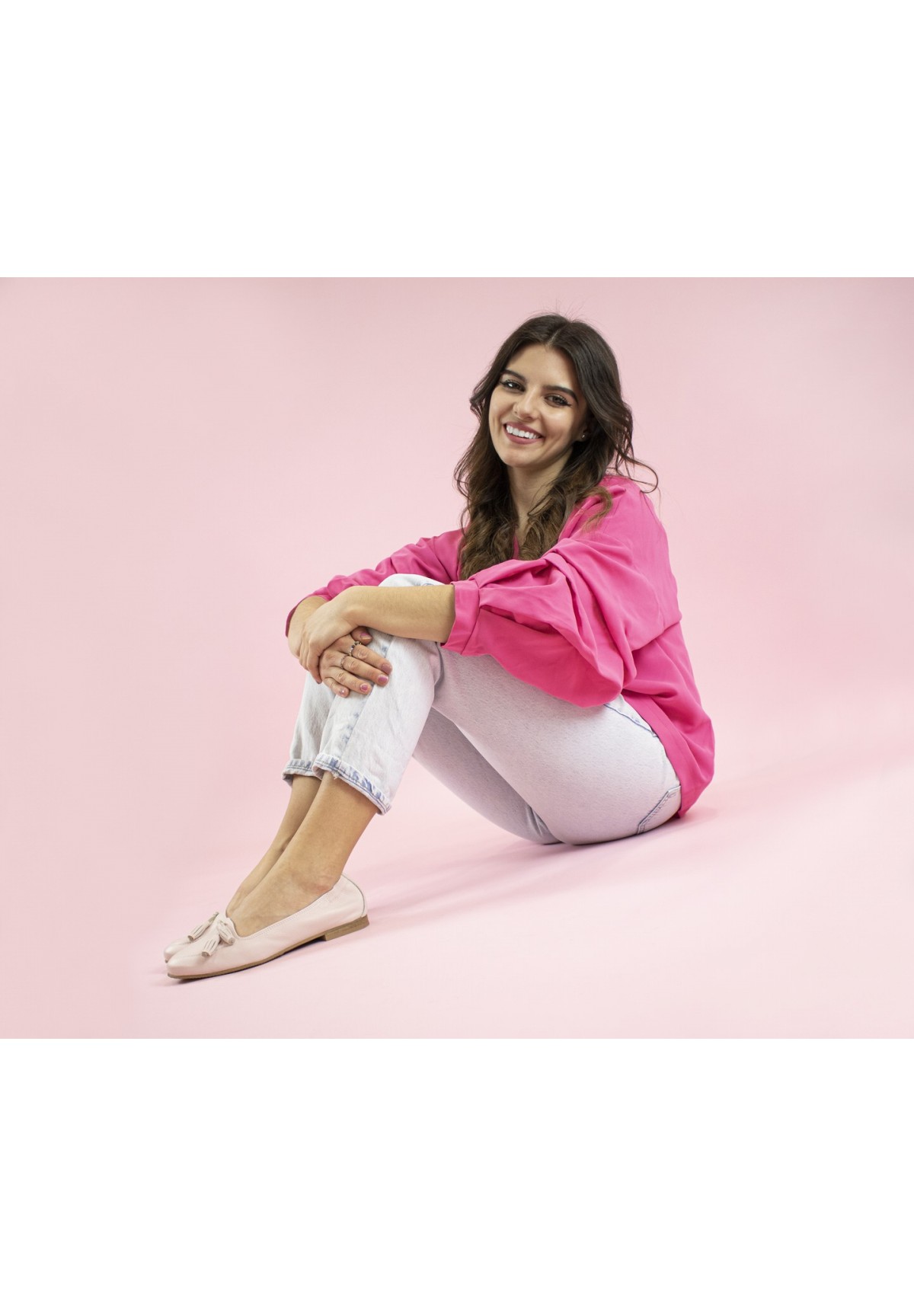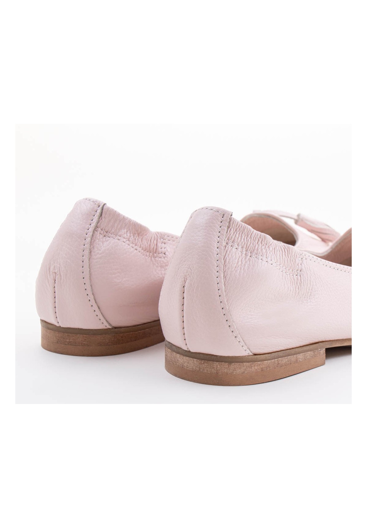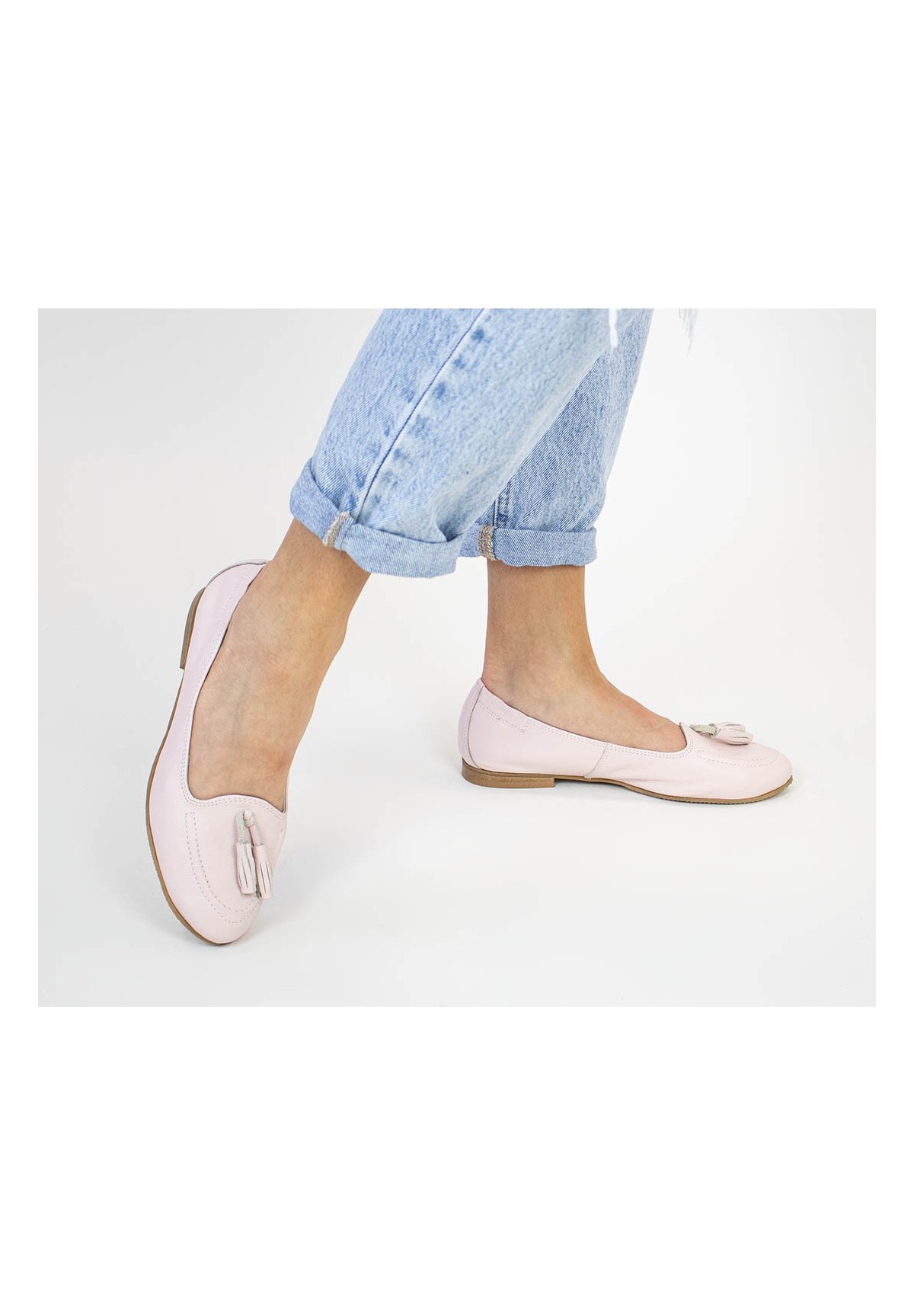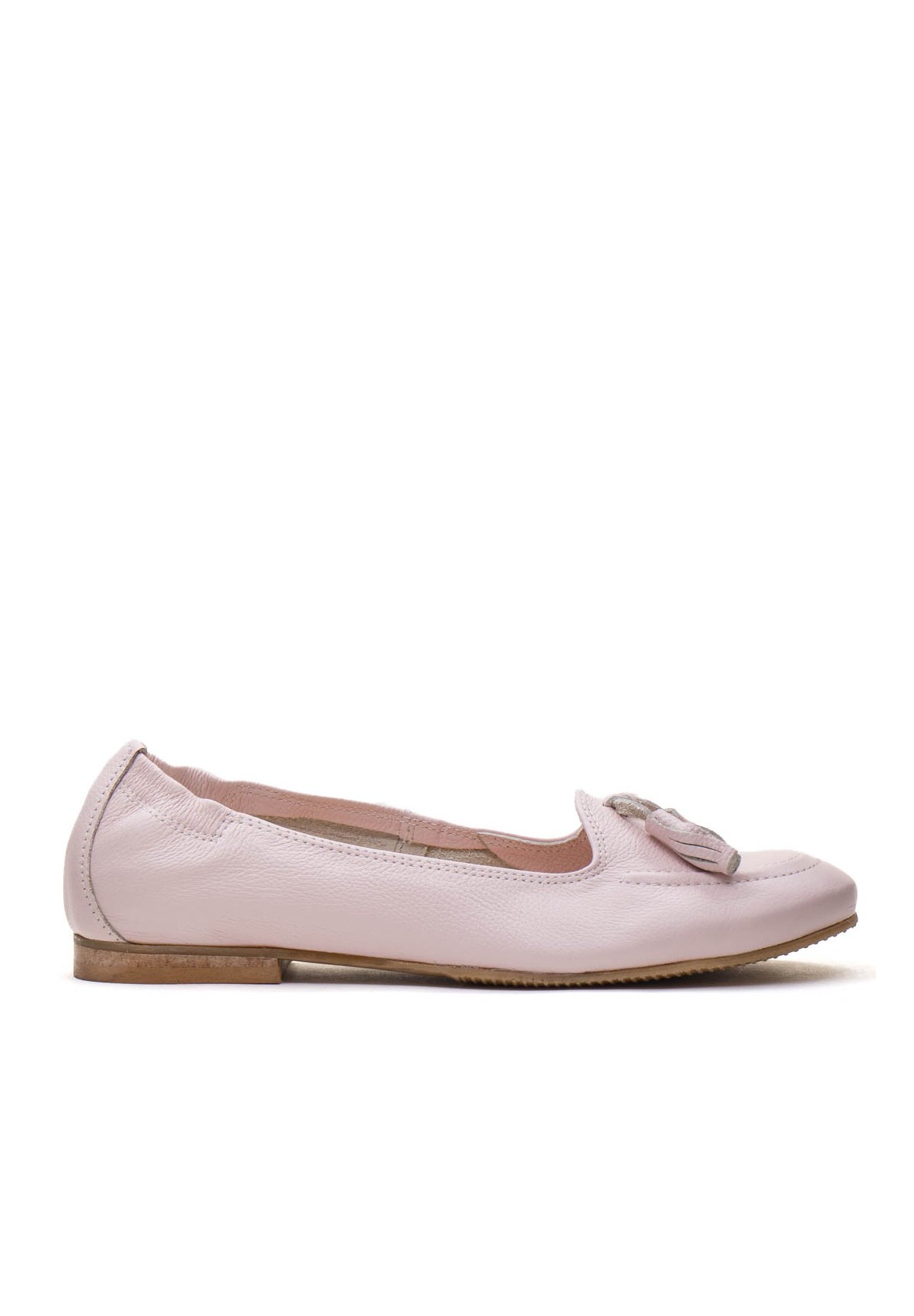 Klasyczne baleriny wykonane z naturalnej skóry licowej w kolorze jasnoróżowym. Posiadają ozdobne frędzle w tym samym kolorze. Z tyłu buta wszyta guma ułatwiająca zakładanie.