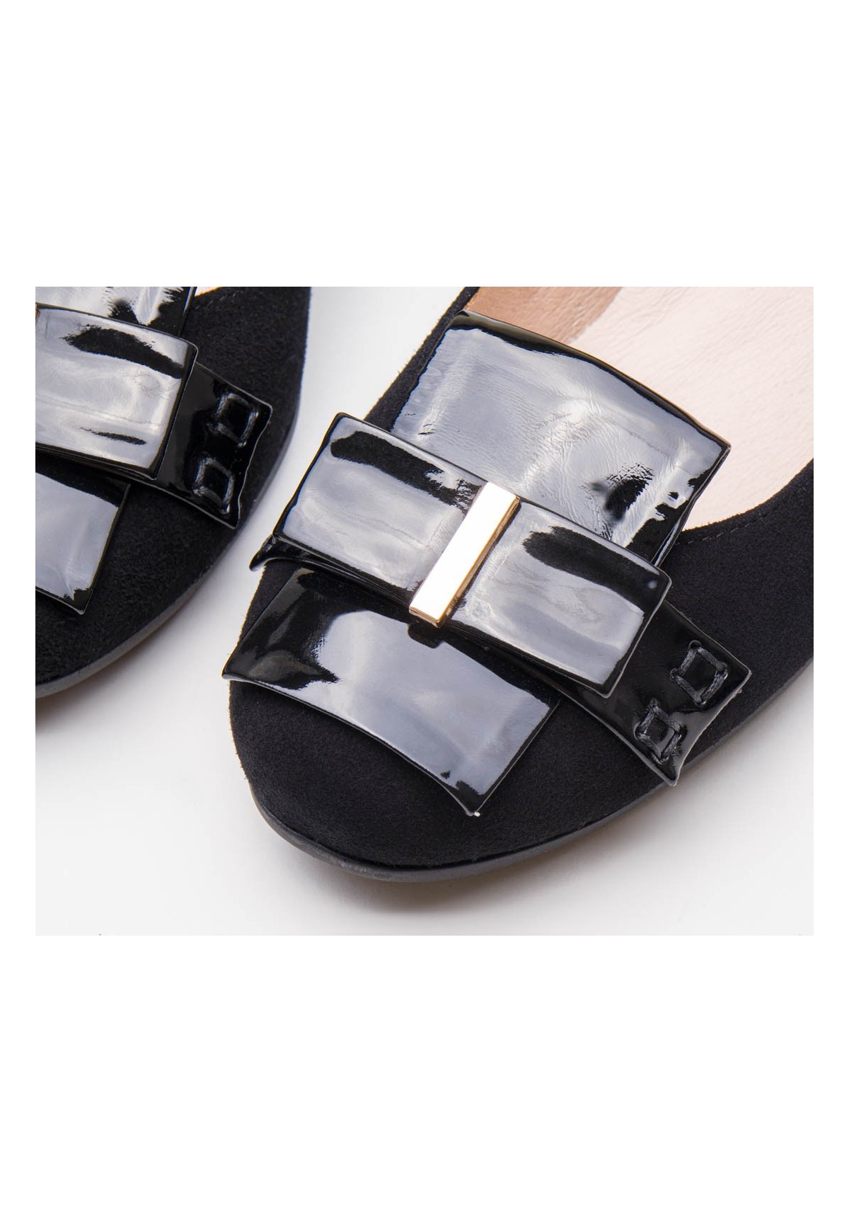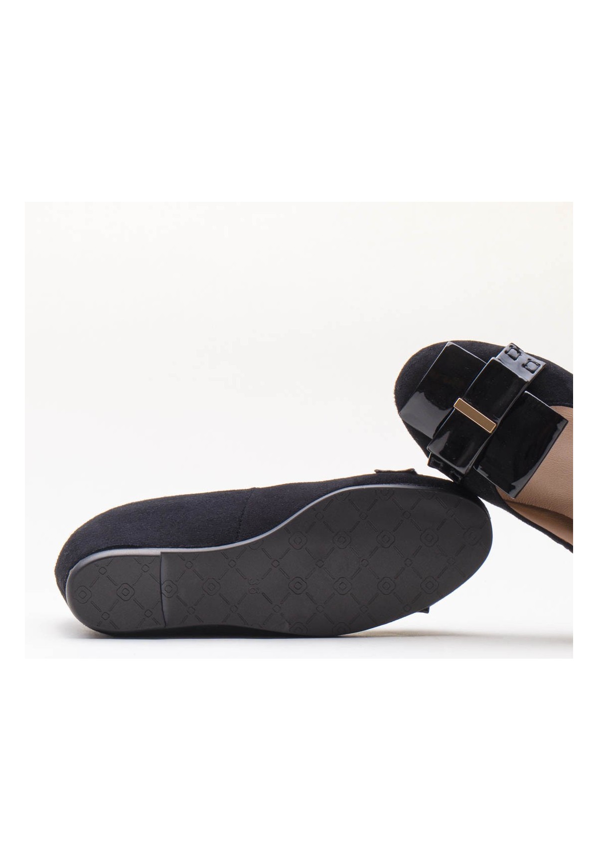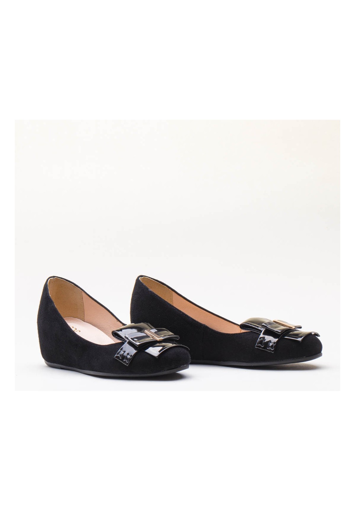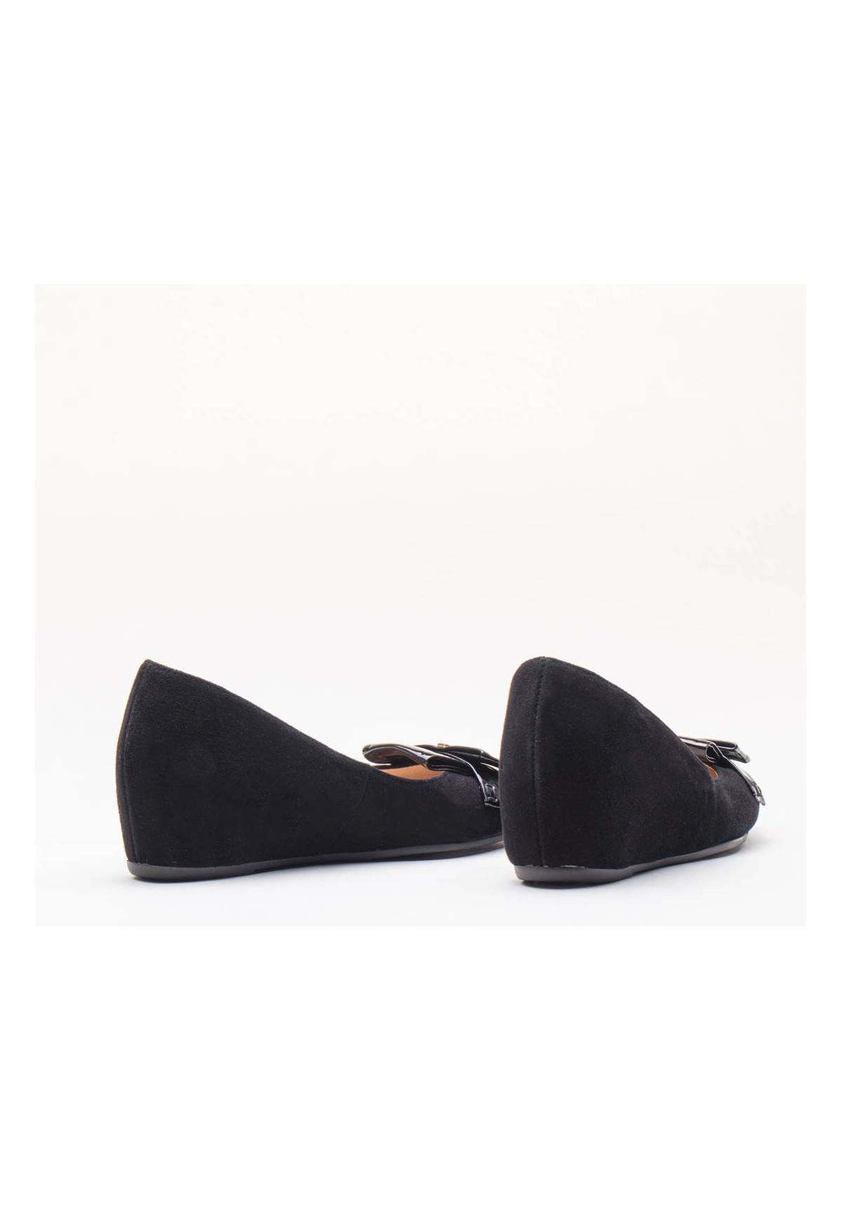 Czarne półbuty wykonane z naturalnej skóry zamszowej z ukrytym koturnem. Posiadają ozdobny element.
