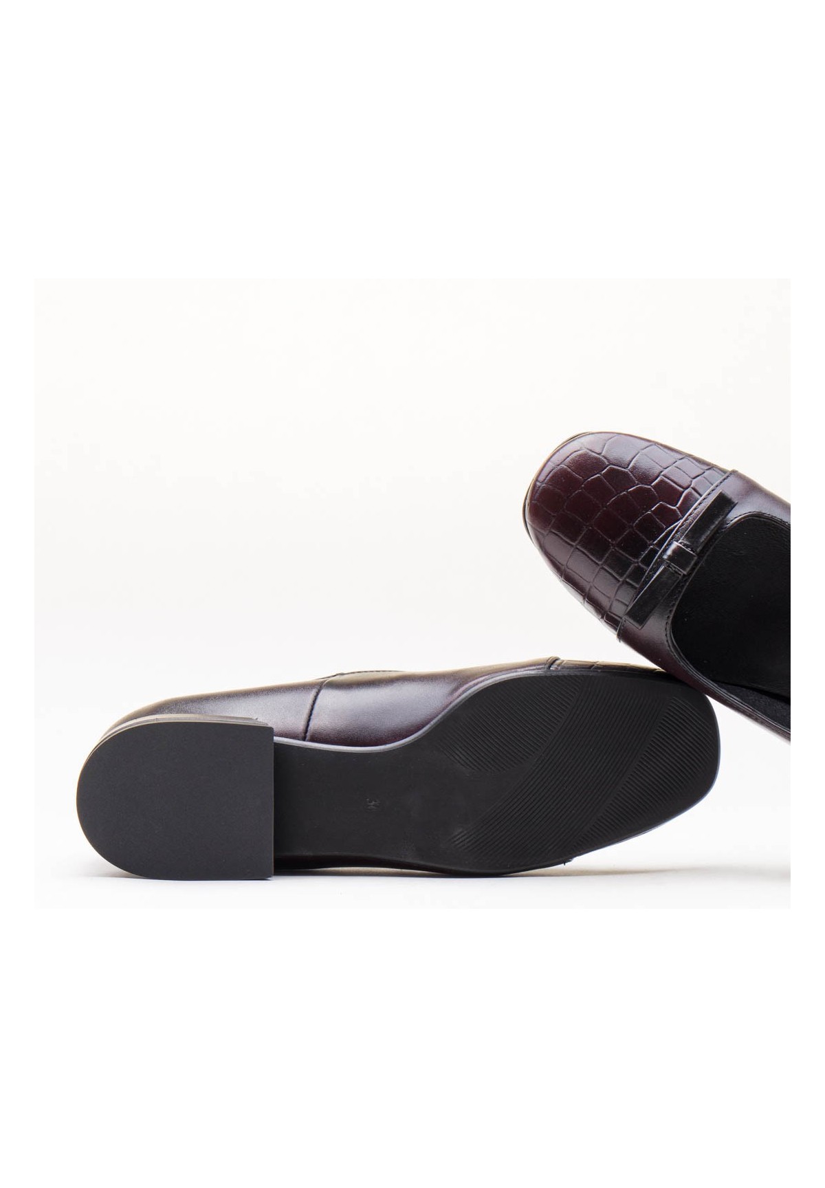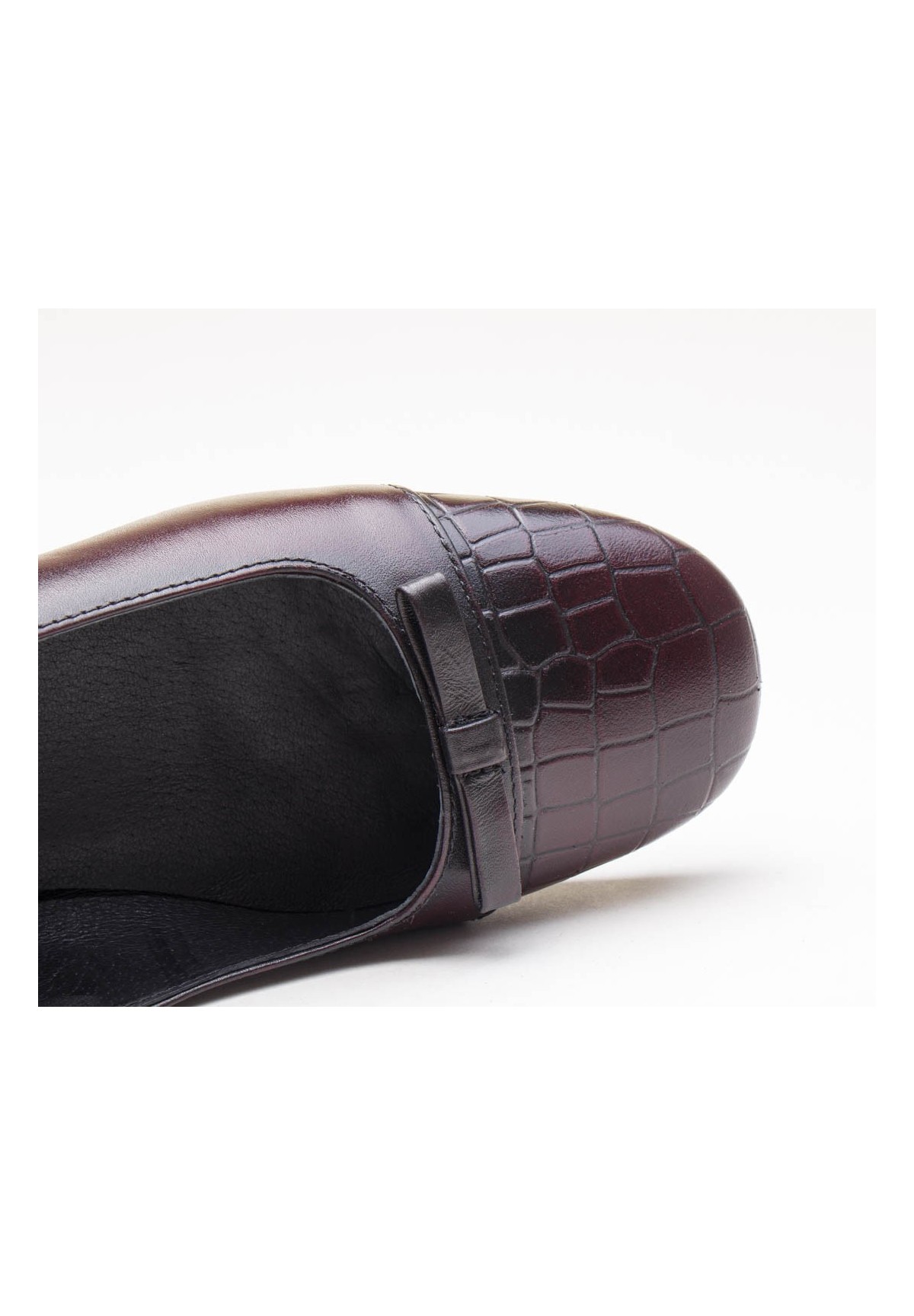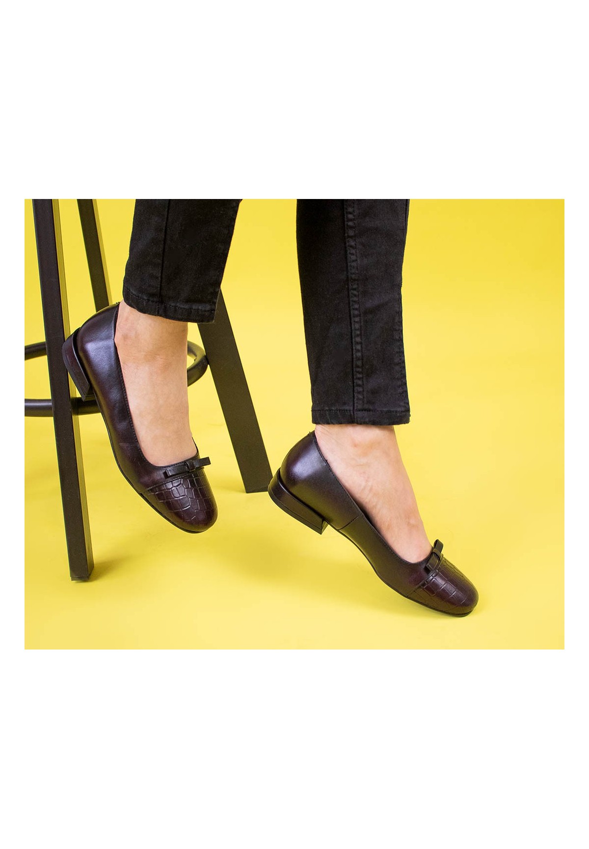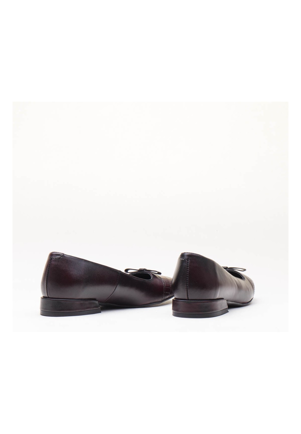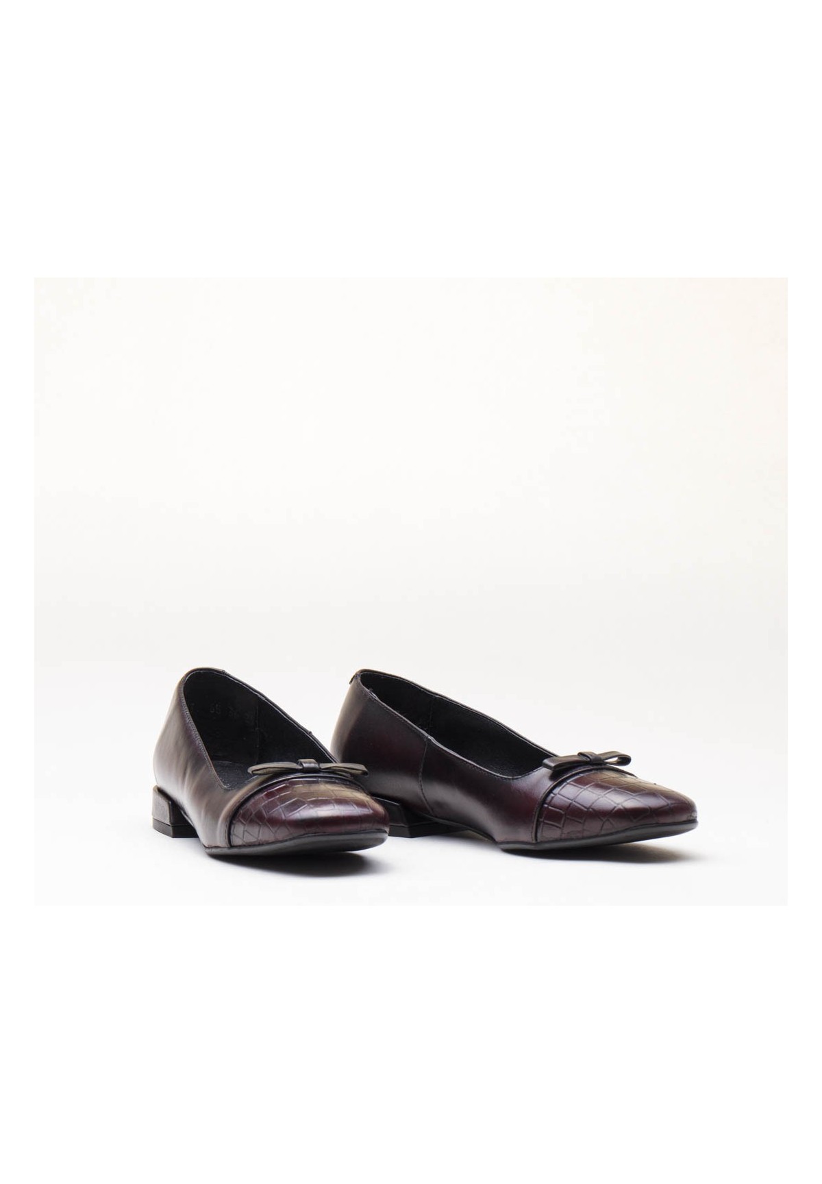 Eleganckie, biznesowe baleriny damskie z ozdobną kokardą. Wykonane z naturalnej skóry licowej w kolorze bordowym, z wstawką ze skóry croco. Model na niewielkim obcasie, chodzenie w nich jest bardzo komfortowe. Nosek w kwadrat optycznie skraca stopę. Wewnątrz znajduje się wkładka ze skóry naturalnej, dzięki której stopa nie poci się.
