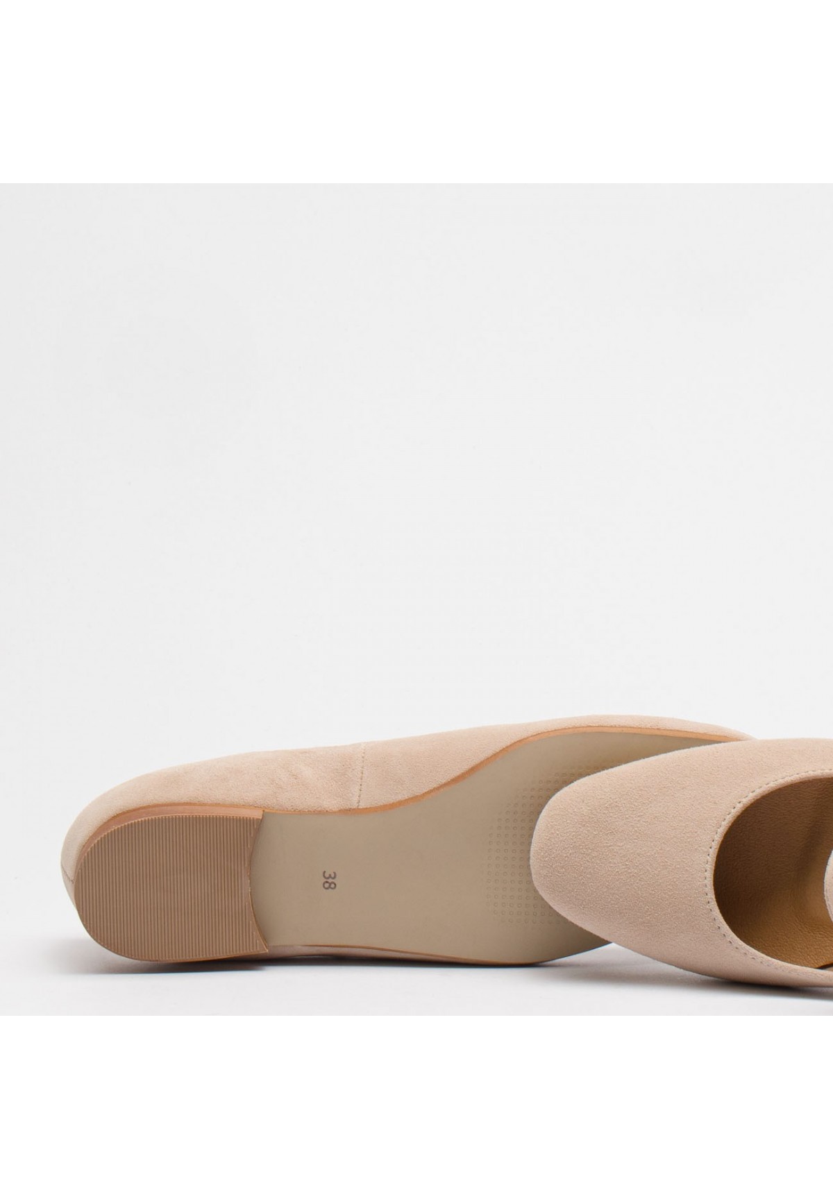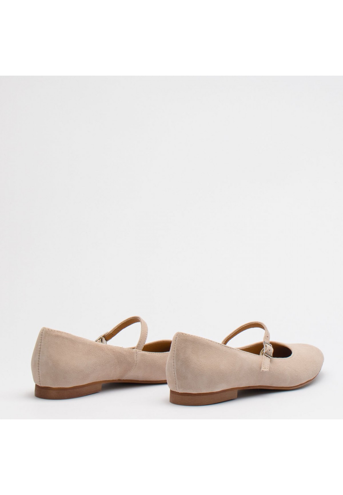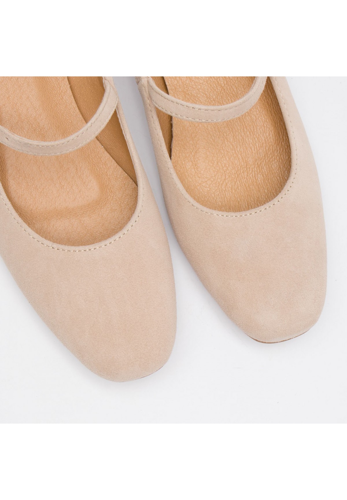 Wygodne baleriny damskie, zapinane za pomocą jednego, regulowanego paska na sprzączkę. Posiadają niski kwadratowy obcas. Wykonane z naturalnej skóry zamszowej w kolorze beżowym. Wyściełane miękką, naturalną wkładką, zapewniającą komfort użytkowania. Te klasyczne baleriny można nosić codziennie - są uniwersalne, więc będą pasować do wielu stylizacji.