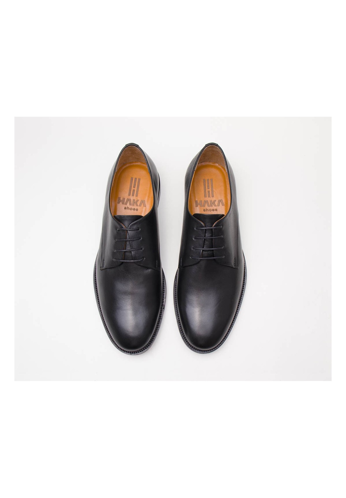 Półbuty męskie marki HAKA Shoes w kolorze czarnym, wykonane z naturalnej skóry cielęcej, będą idealnie sprawdzały się na wielkie uroczystości typu ślub, jak i mniejsze wyjścia np. do pracy. Posiadają naszyte na wierzch przyszwy kwatery. Charakteryzują się ponadczasowym wyglądem oraz smukłą sylwetką. Wykończone podszewką z bydlęcej skóry zapewnią stopie cyrkulację powietrza. Zaletą butów jest ich doskonała jakość oraz wygoda. Sznurowania zapewniają doskonałe dopasowanie ich do tęgości stopy. Buty uszyto metodą Blake, przez doświadczonych szewców, z dbałością o detale.