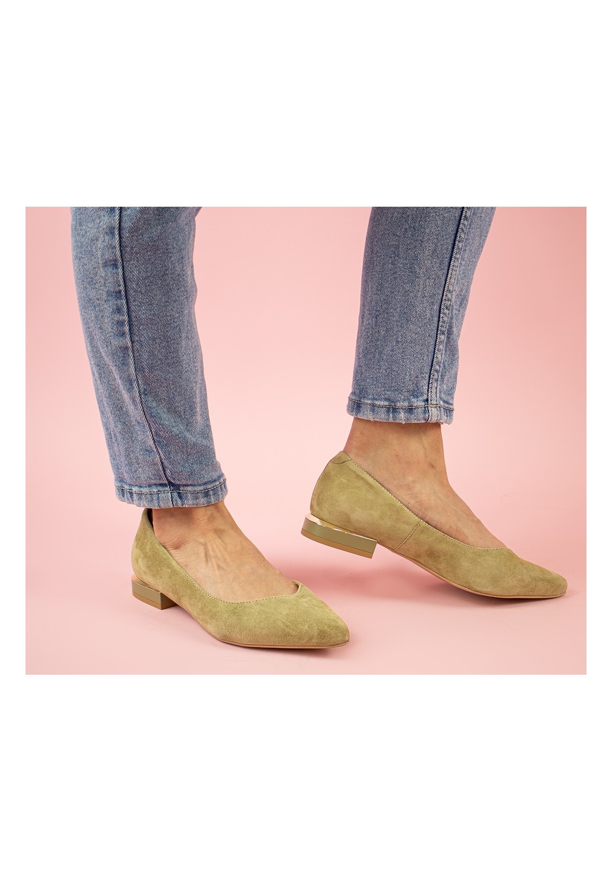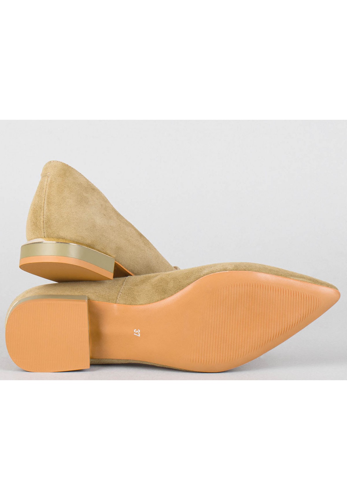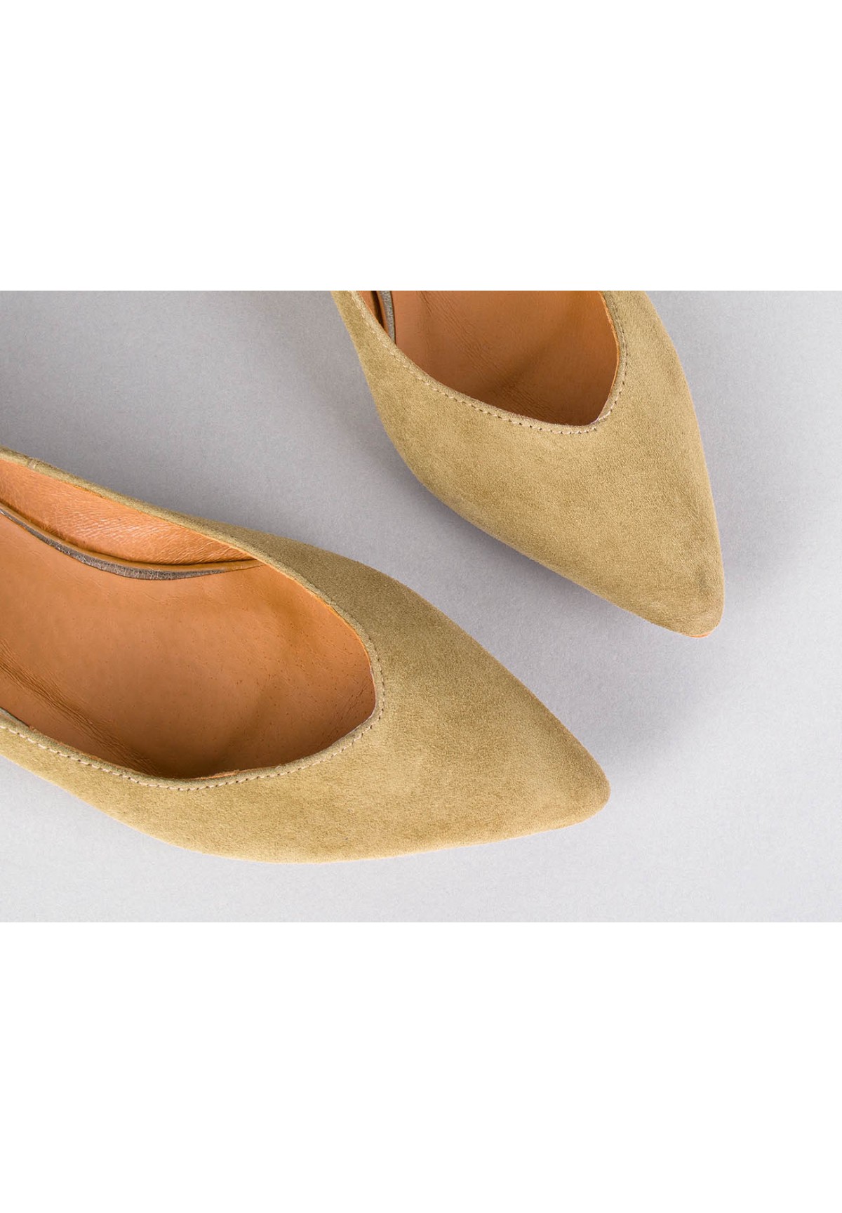 Półbuty wykonane ze skóry zamszowej w kolorze oliwki. Nosek do szpica oraz wycięcie na przyszwie nadają im ciekawy wygląd. Delikatny obcas.