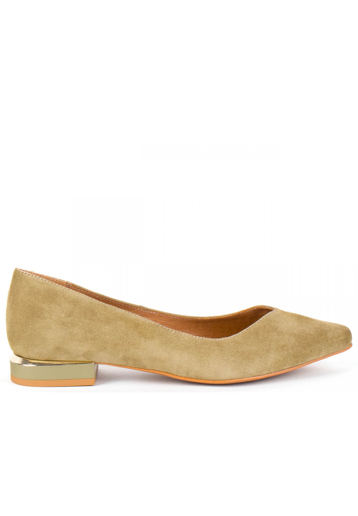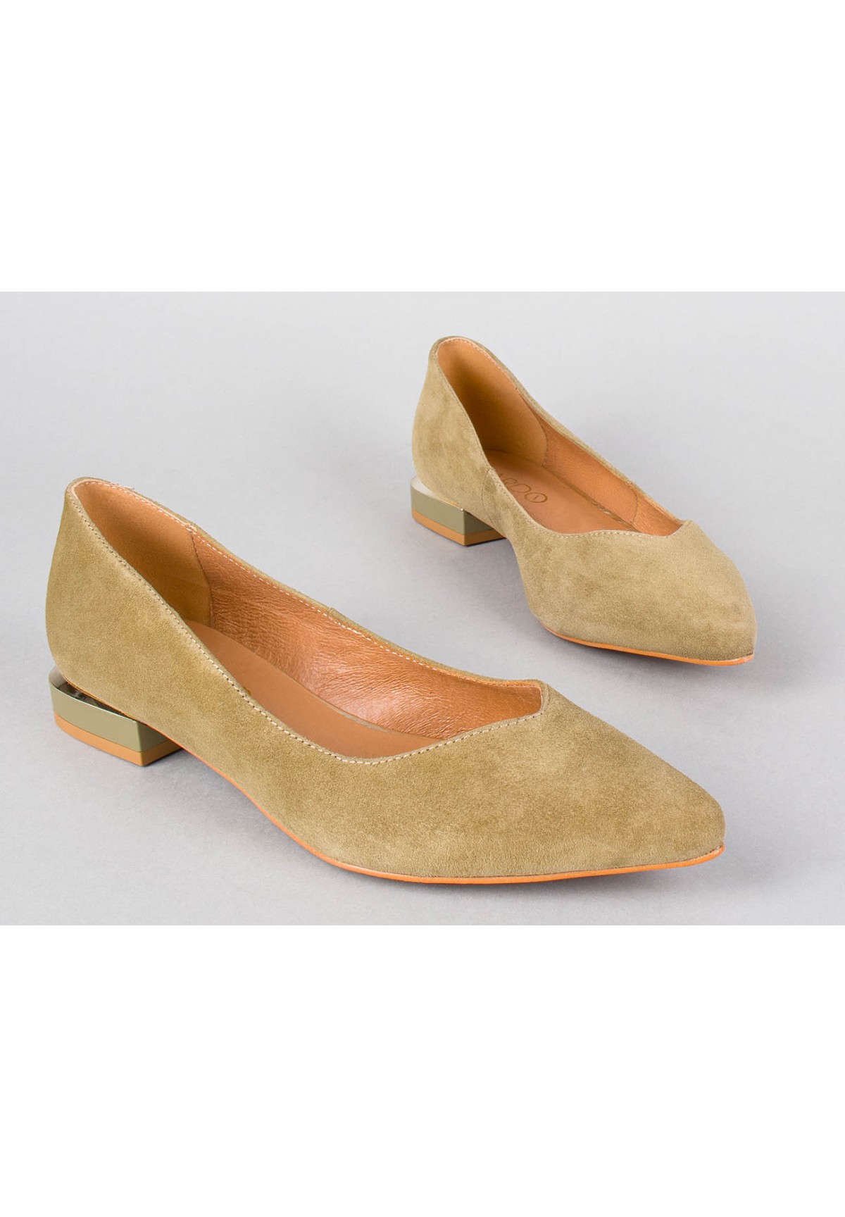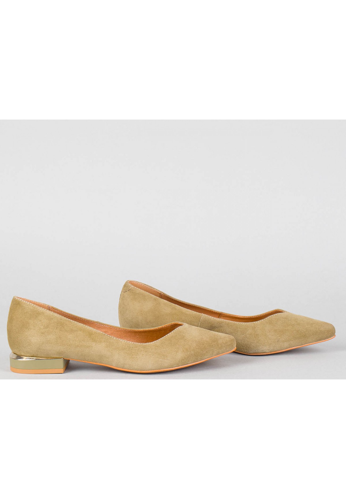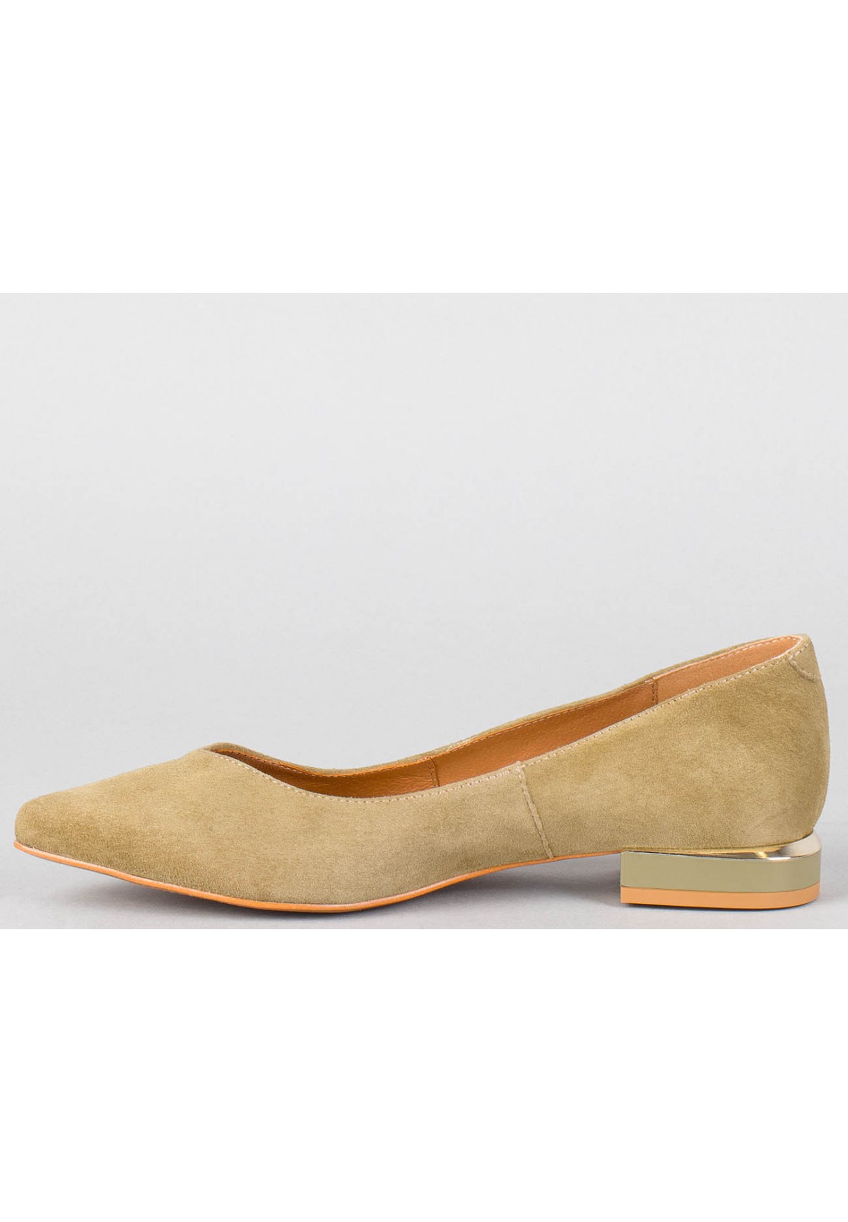 Półbuty wykonane ze skóry zamszowej w kolorze oliwki. Nosek do szpica oraz wycięcie na przyszwie nadają im ciekawy wygląd. Delikatny obcas.