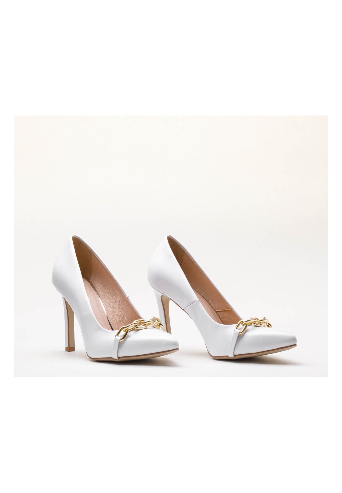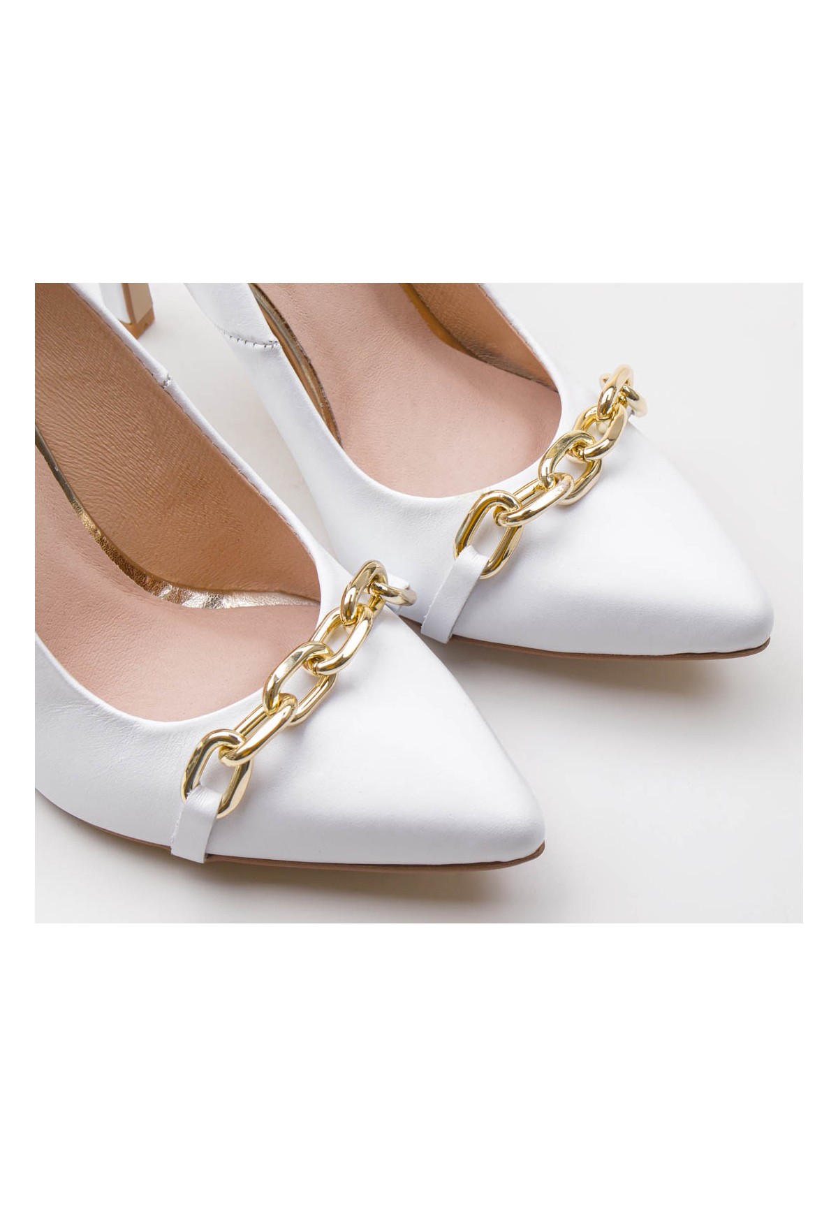 Czółenka na obcasie wykonane z naturalnej skóry licowej. Posiadają ozdobny element w postaci łańcucha.