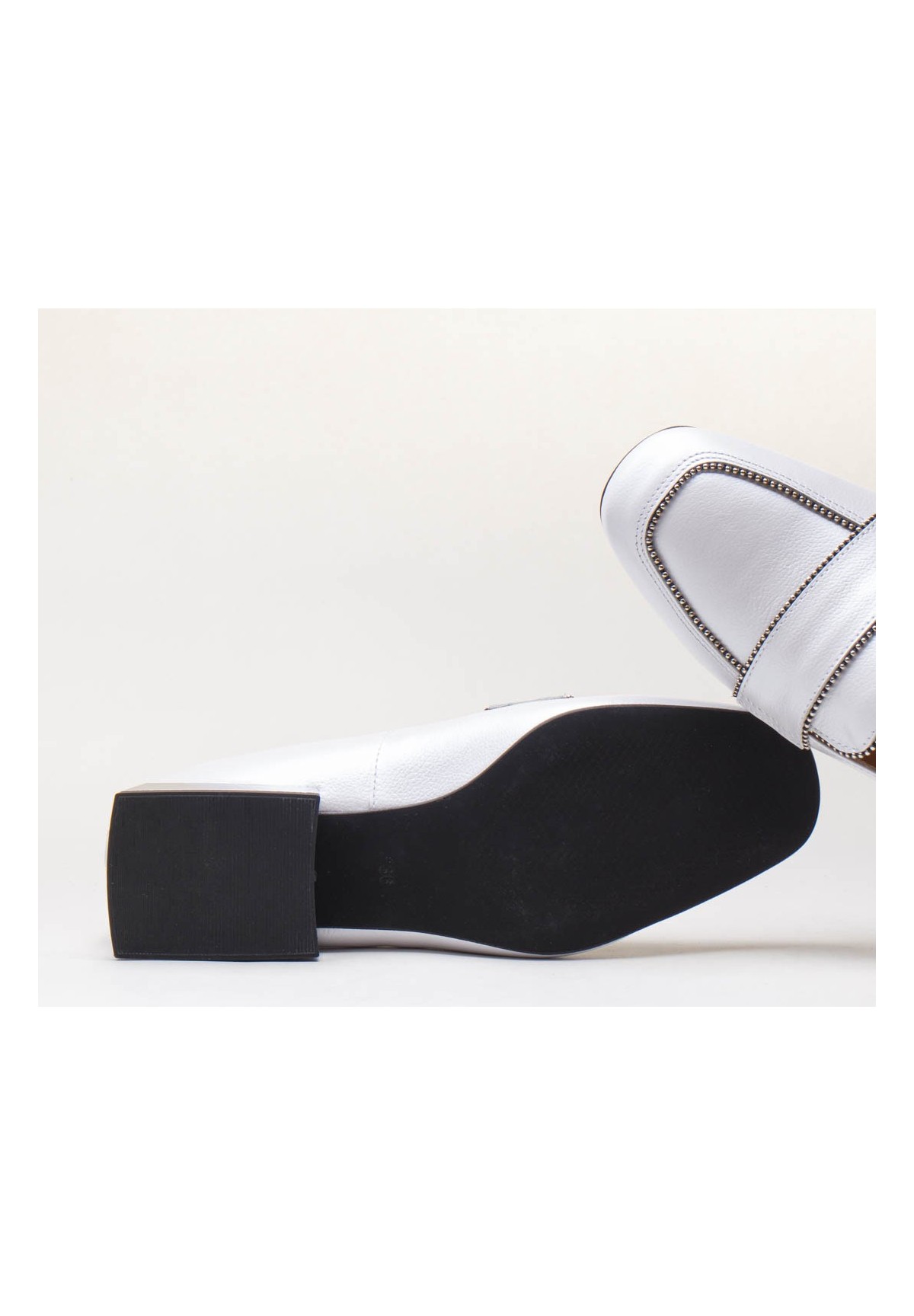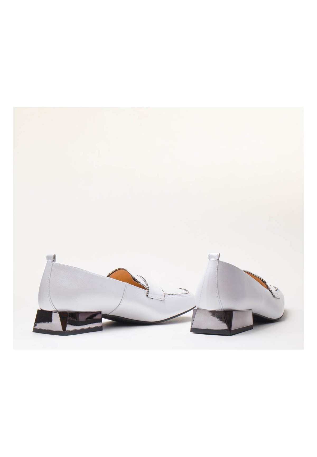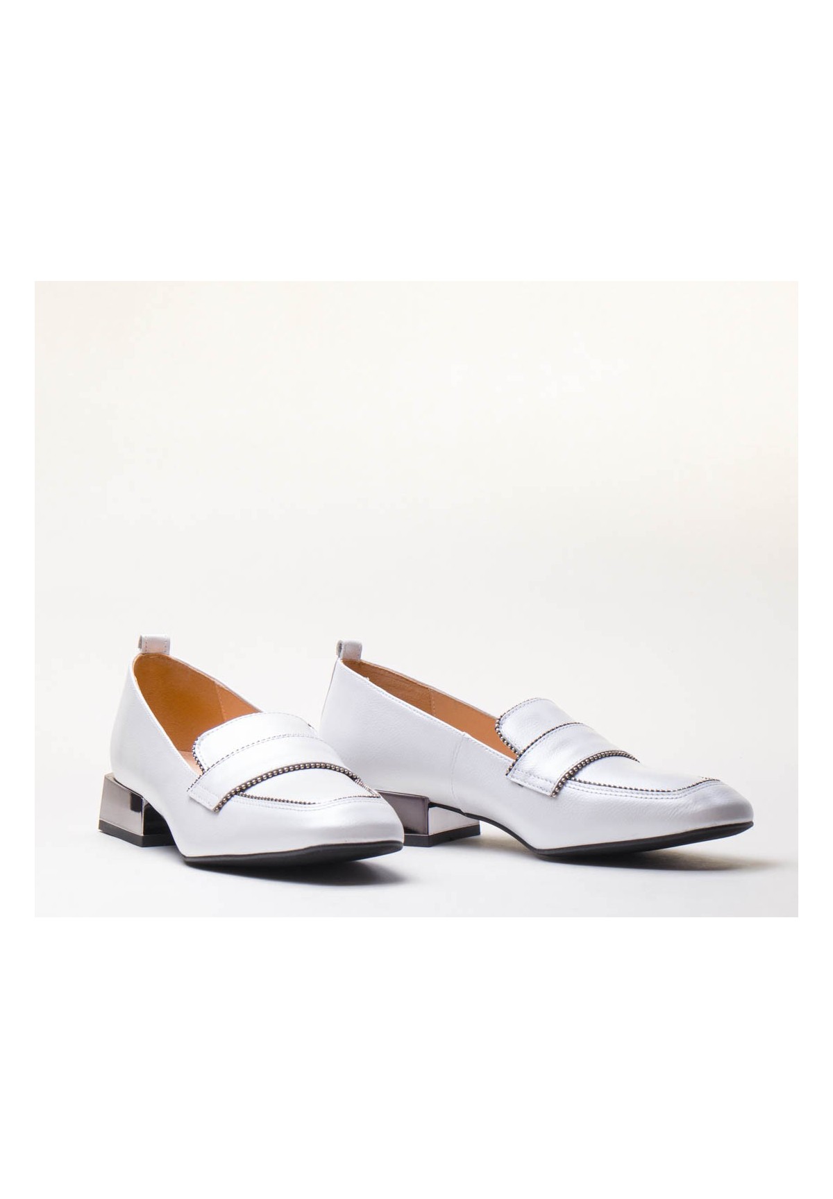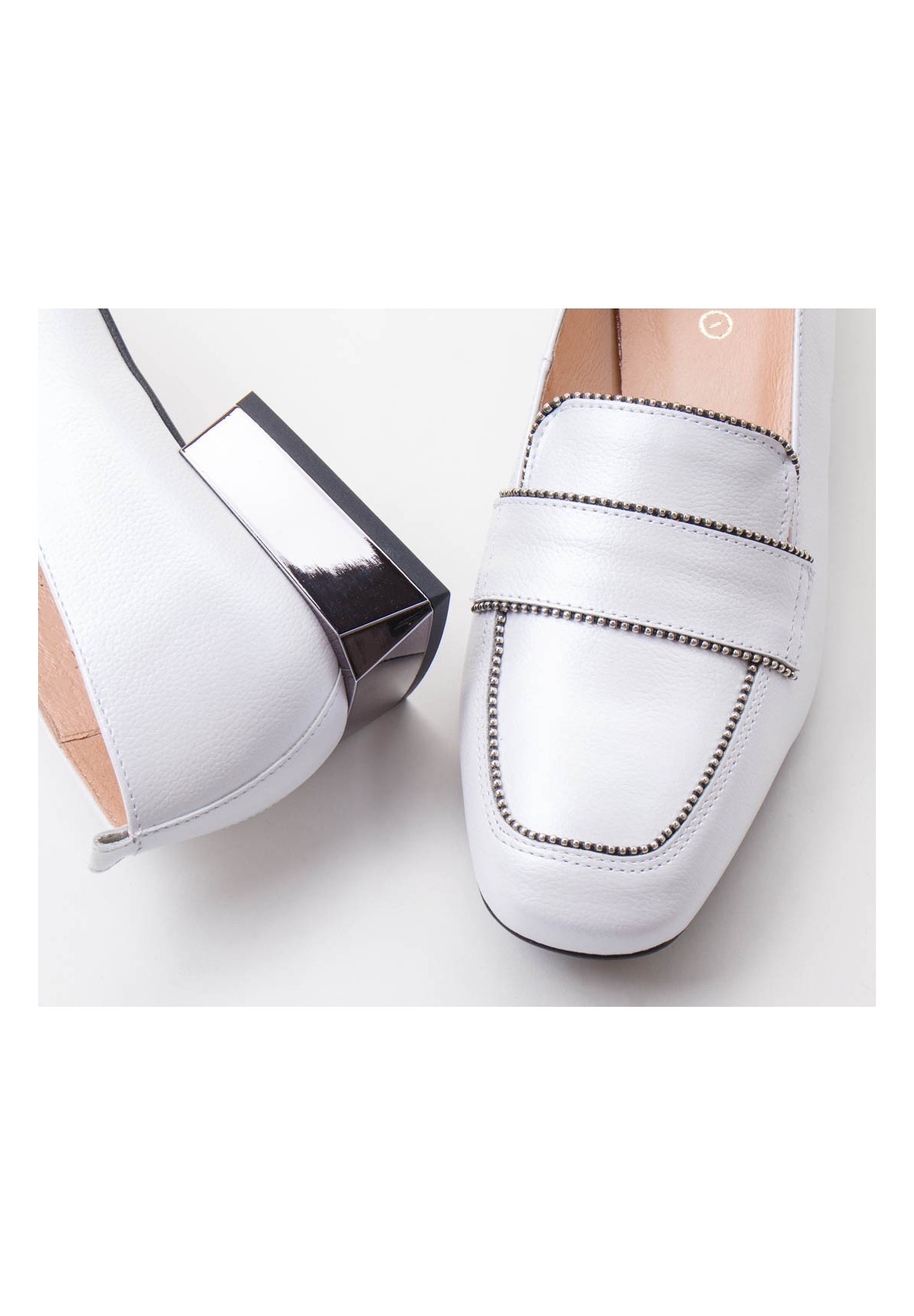 Czółenka w kolorze białym, wykonane z naturalnej skóry licowej. Posiadają niski, kwadratowy obcas.