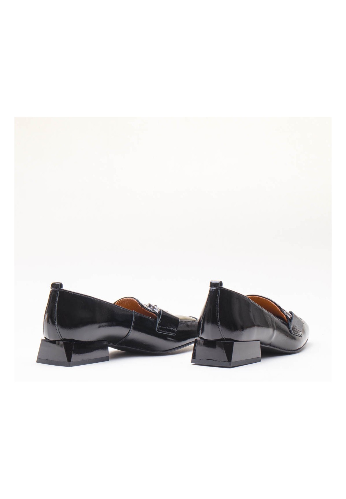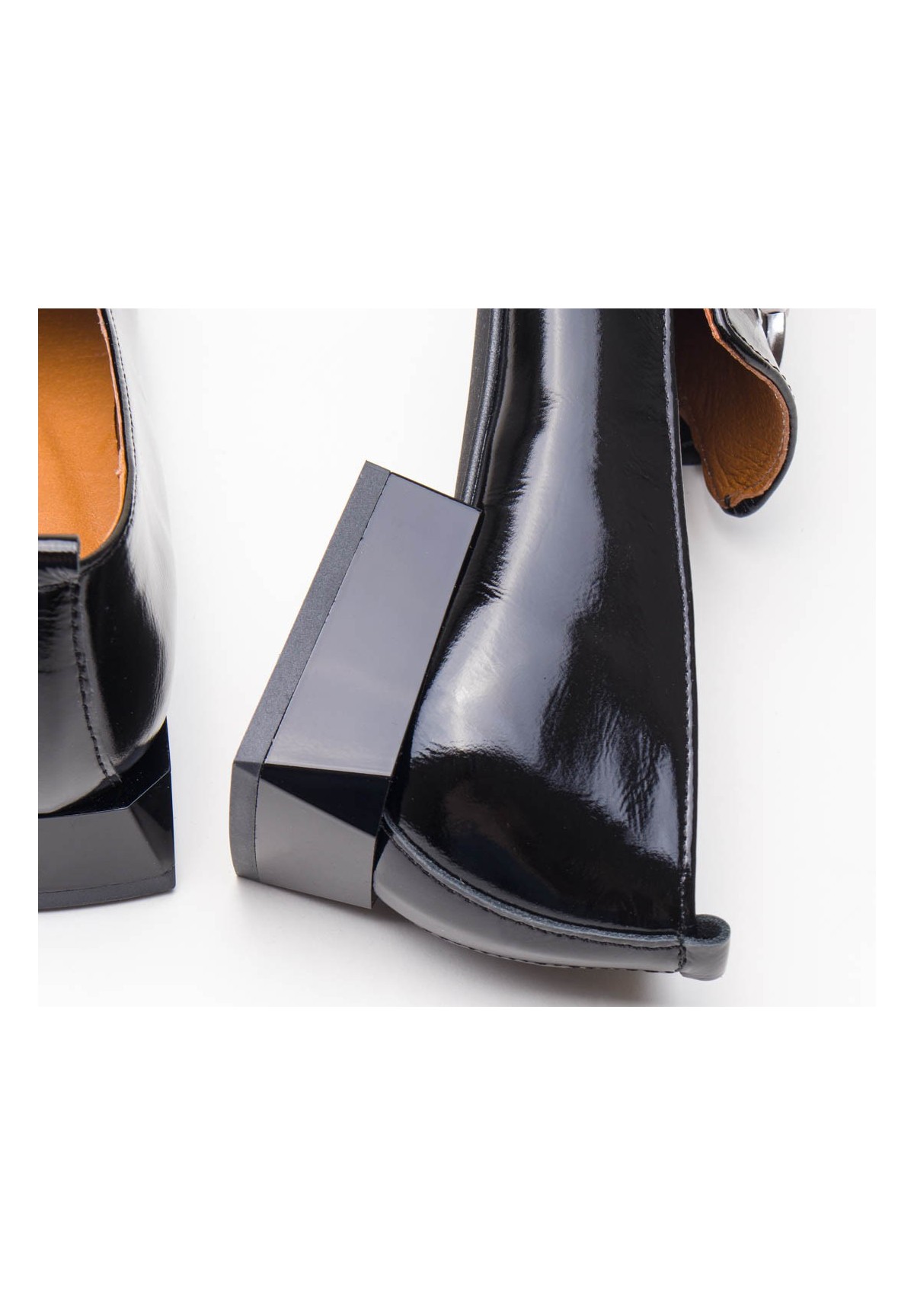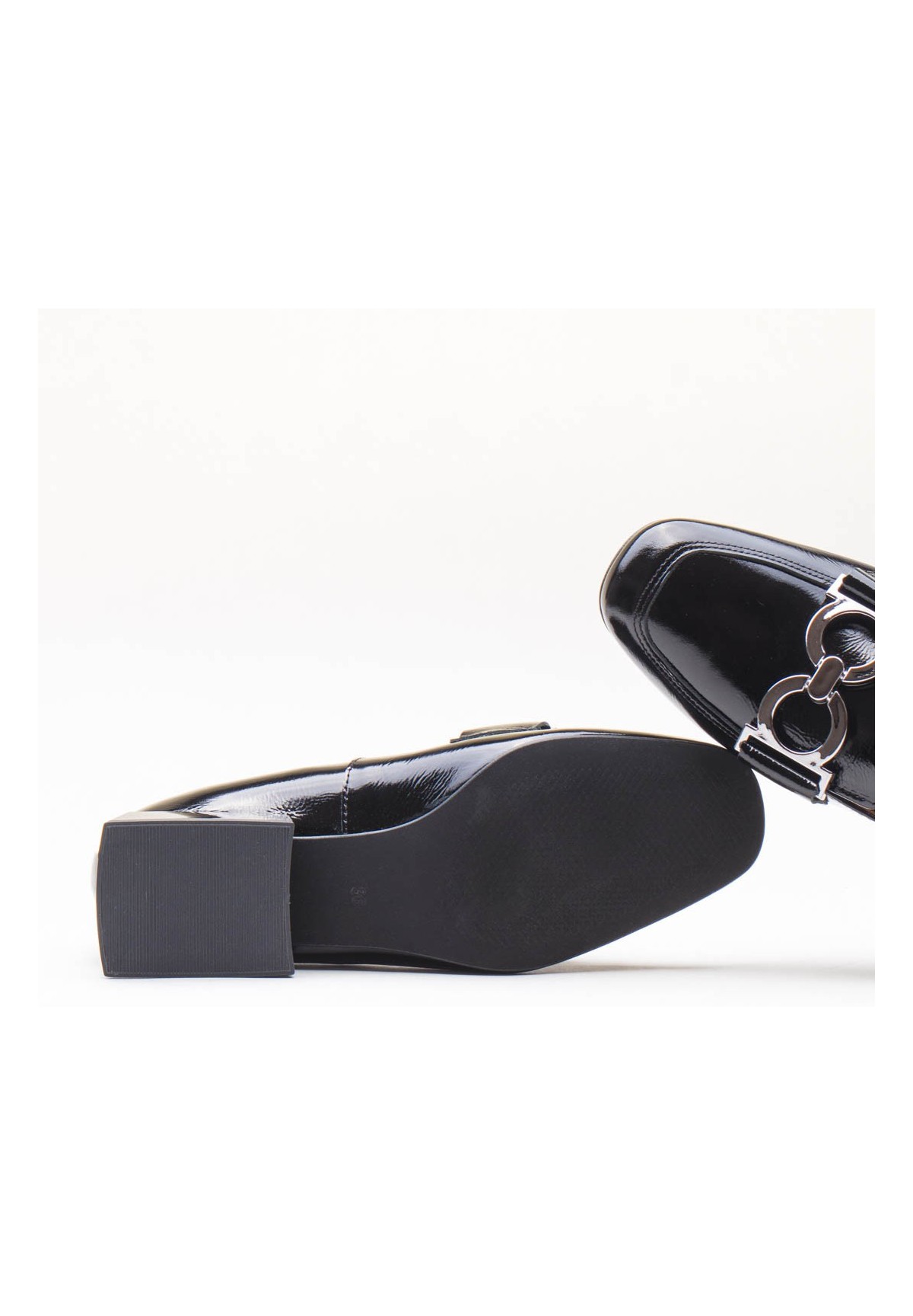 Czółenka damskie, wykonane z naturalnej skóry lakierowanej w kolorze czarnym. Ozdobione dekoracyjną sprzączką. Posiadają niski, kwadratowy obcas, dzięki któremu chodzenie w nich jest niezwykle wygodne. Nosek w kwadrat, optycznie skraca stopę. Wewnątrz wyściełane skórzaną wkładką, która zapewnia stopie komfort. Doskonałe do wielu stylizacji.