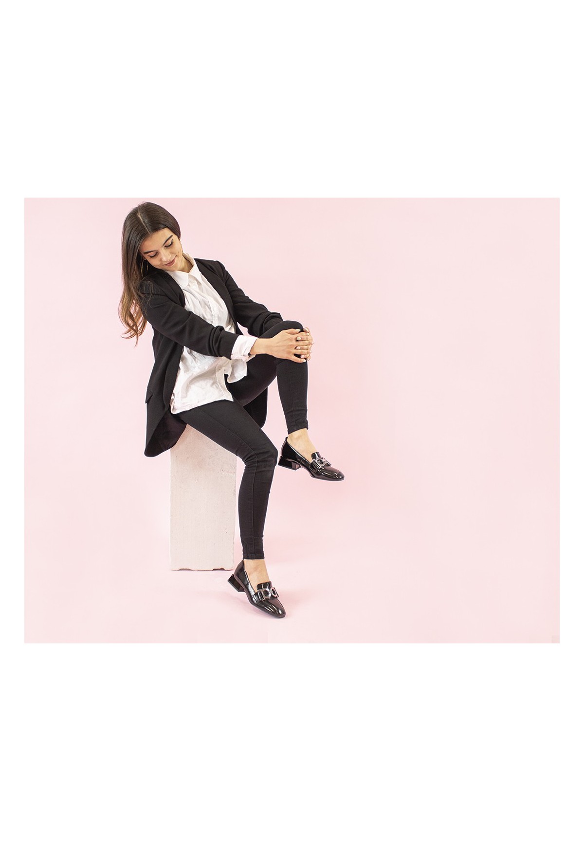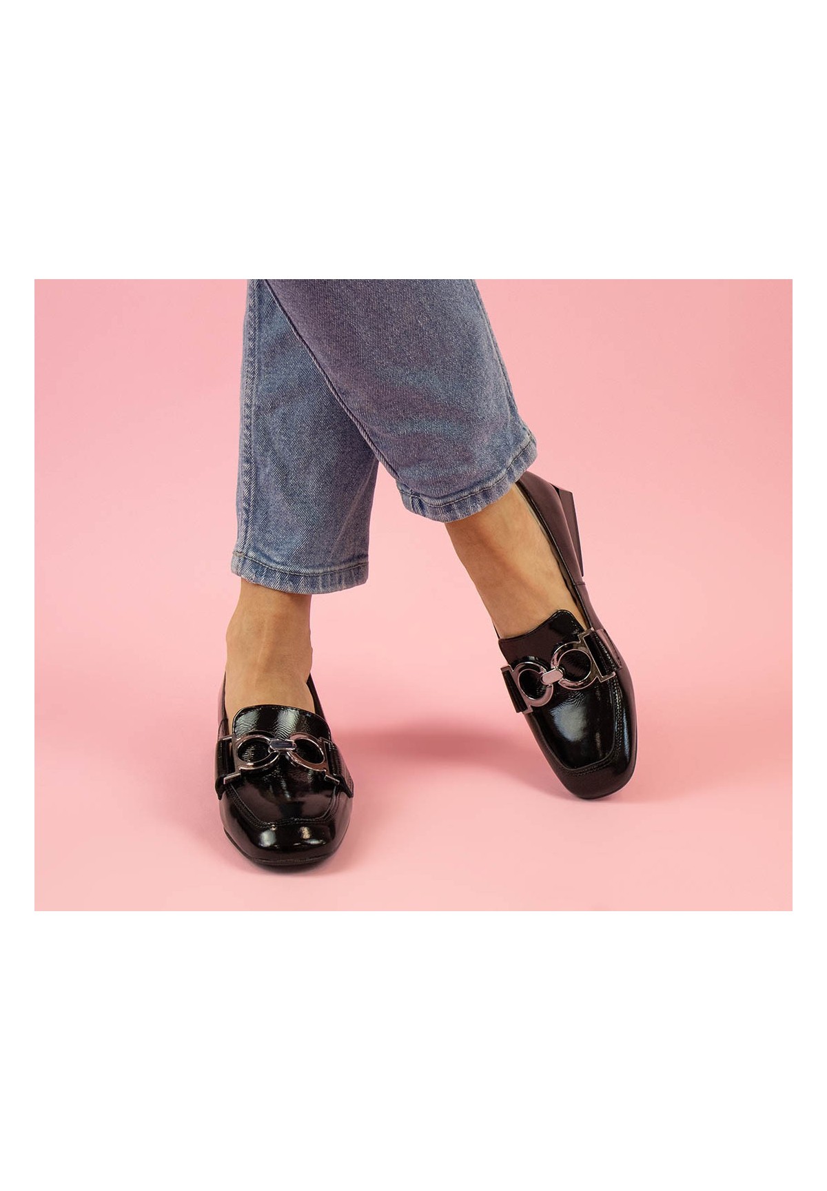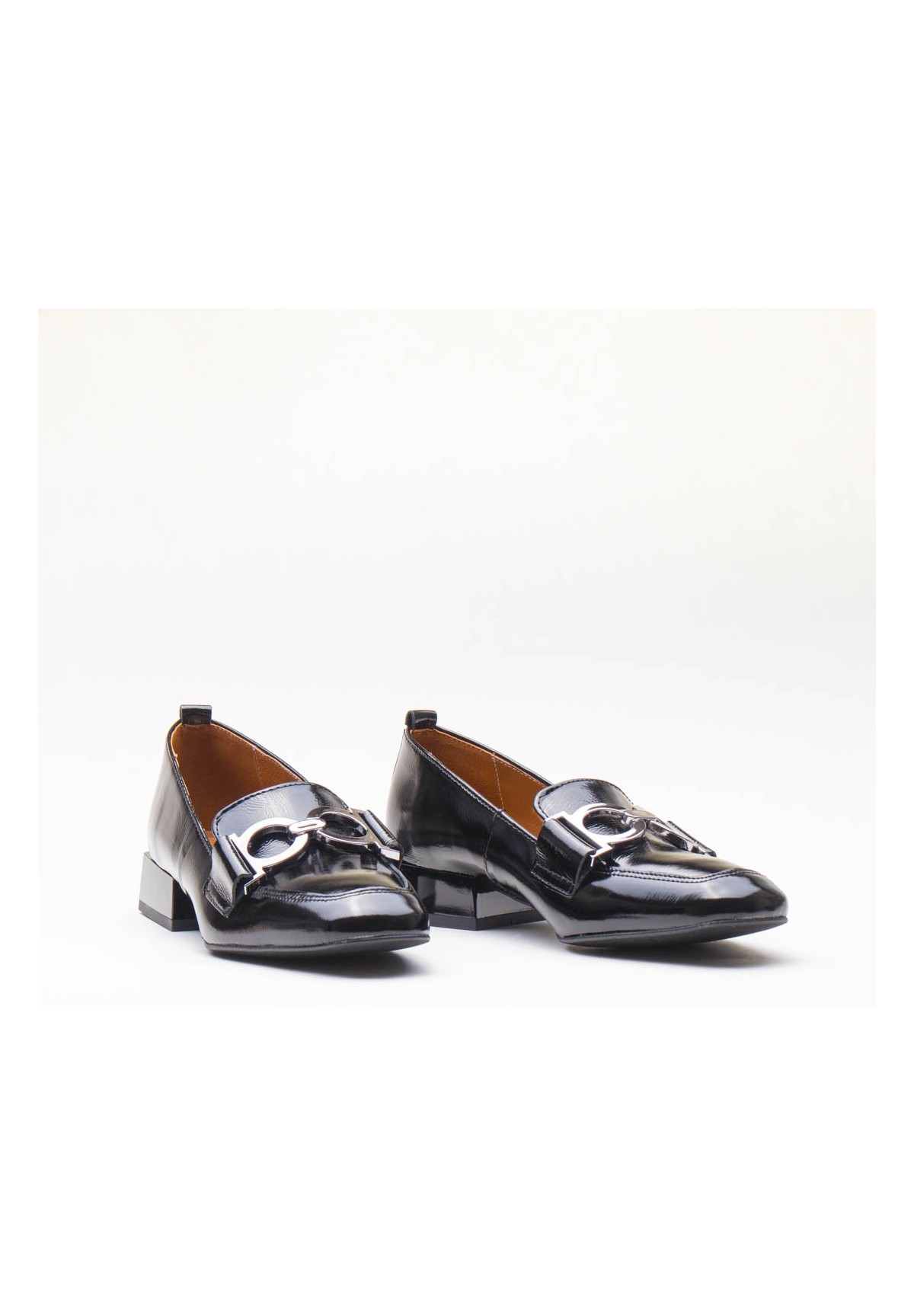 Czółenka damskie, wykonane z naturalnej skóry lakierowanej w kolorze czarnym. Ozdobione dekoracyjną sprzączką. Posiadają niski, kwadratowy obcas, dzięki któremu chodzenie w nich jest niezwykle wygodne. Nosek w kwadrat, optycznie skraca stopę. Wewnątrz wyściełane skórzaną wkładką, która zapewnia stopie komfort. Doskonałe do wielu stylizacji.