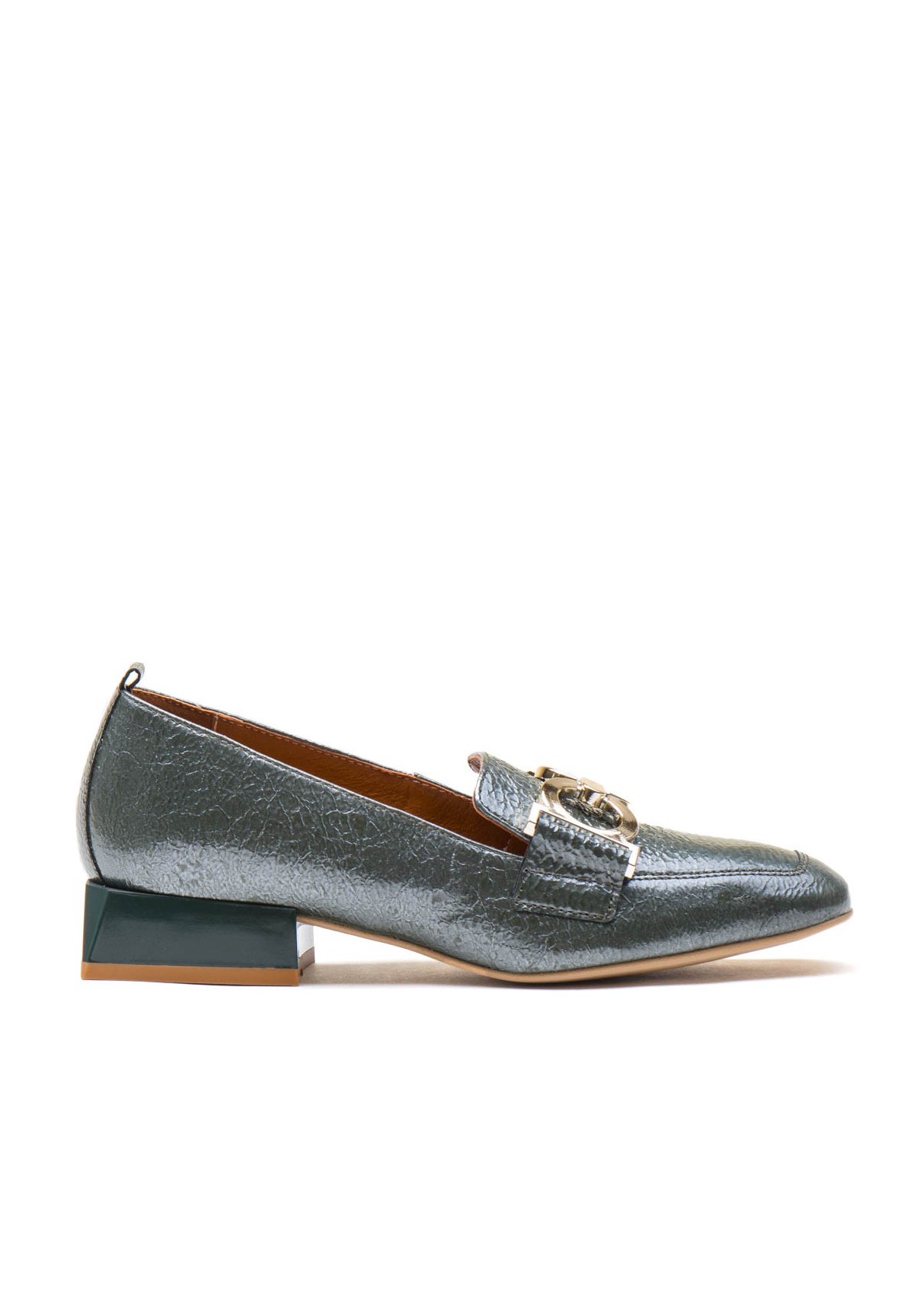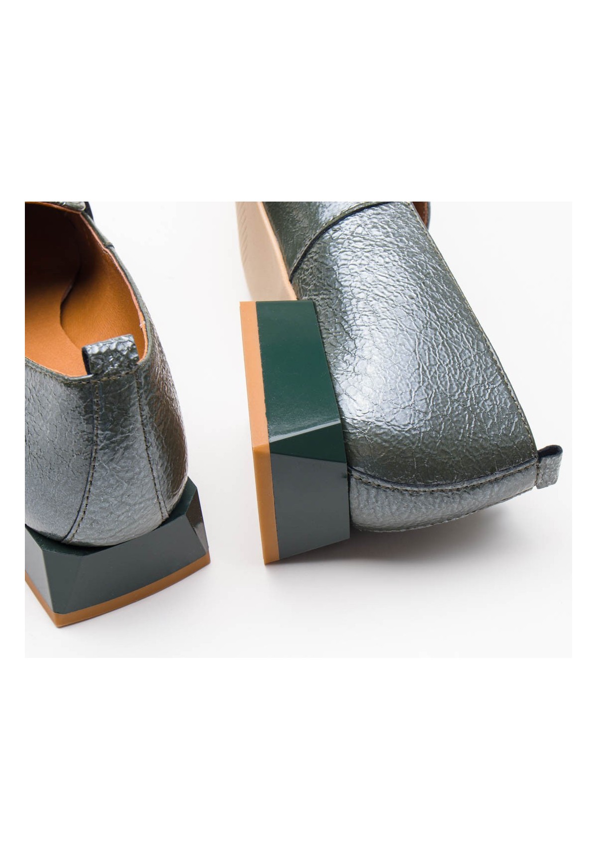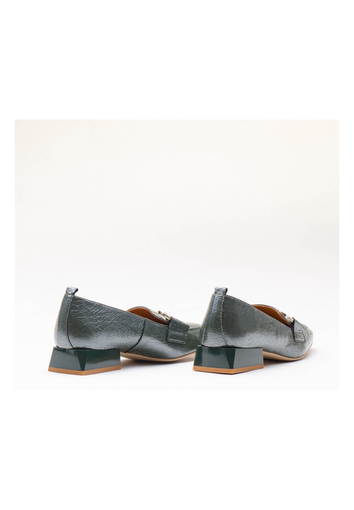 Czółenka damskie, wykonane z naturalnej skóry lakierowanej w kolorze zielonym. Ozdobione dekoracyjną sprzączką. Posiadają niski, kwadratowy obcas, dzięki któremu chodzenie w nich jest niezwykle wygodne. Nosek w kwadrat, optycznie skraca stopę. Wewnątrz wyściełane skórzaną wkładką, która zapewnia stopie komfort. Doskonałe do wielu stylizacji.