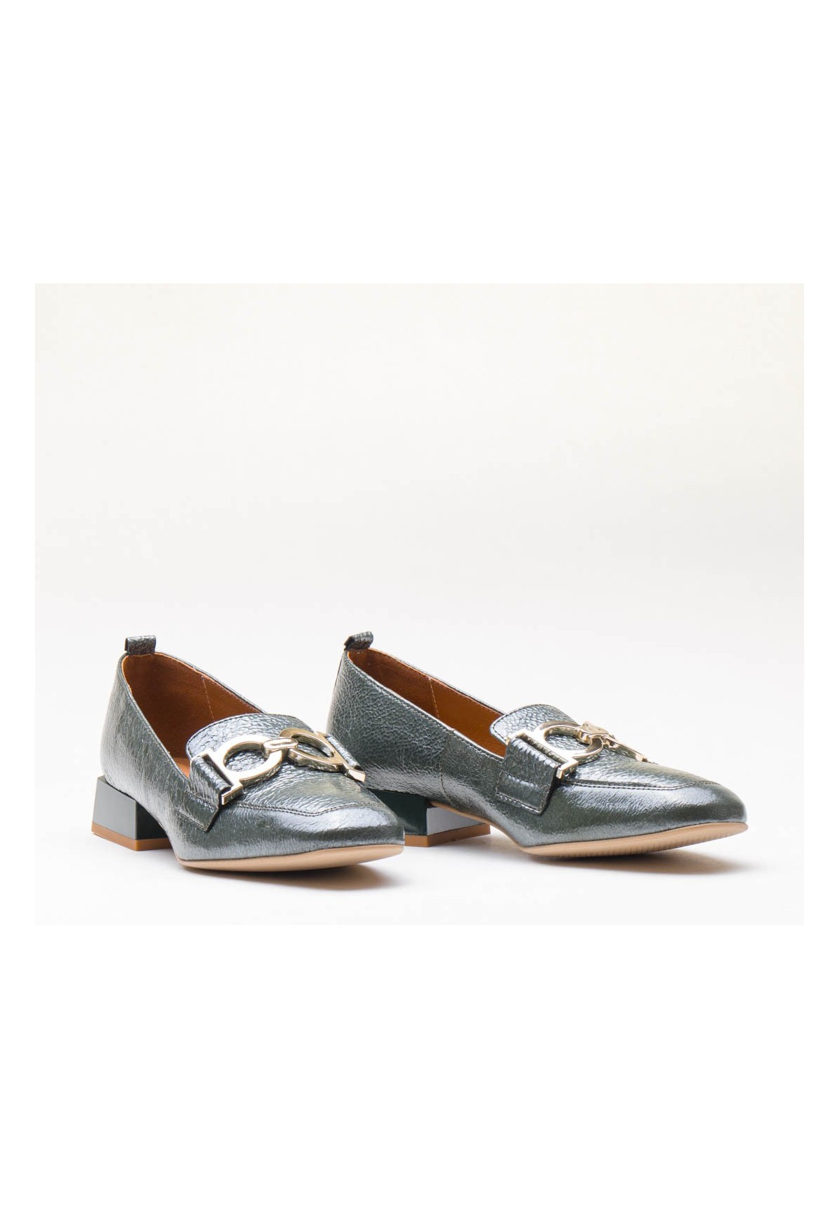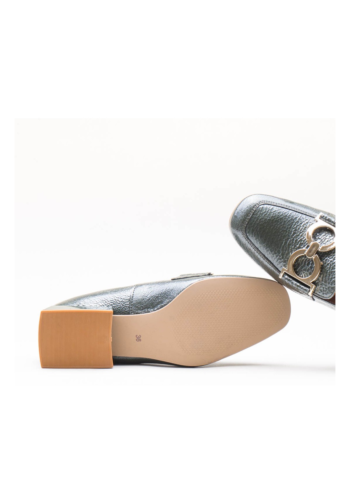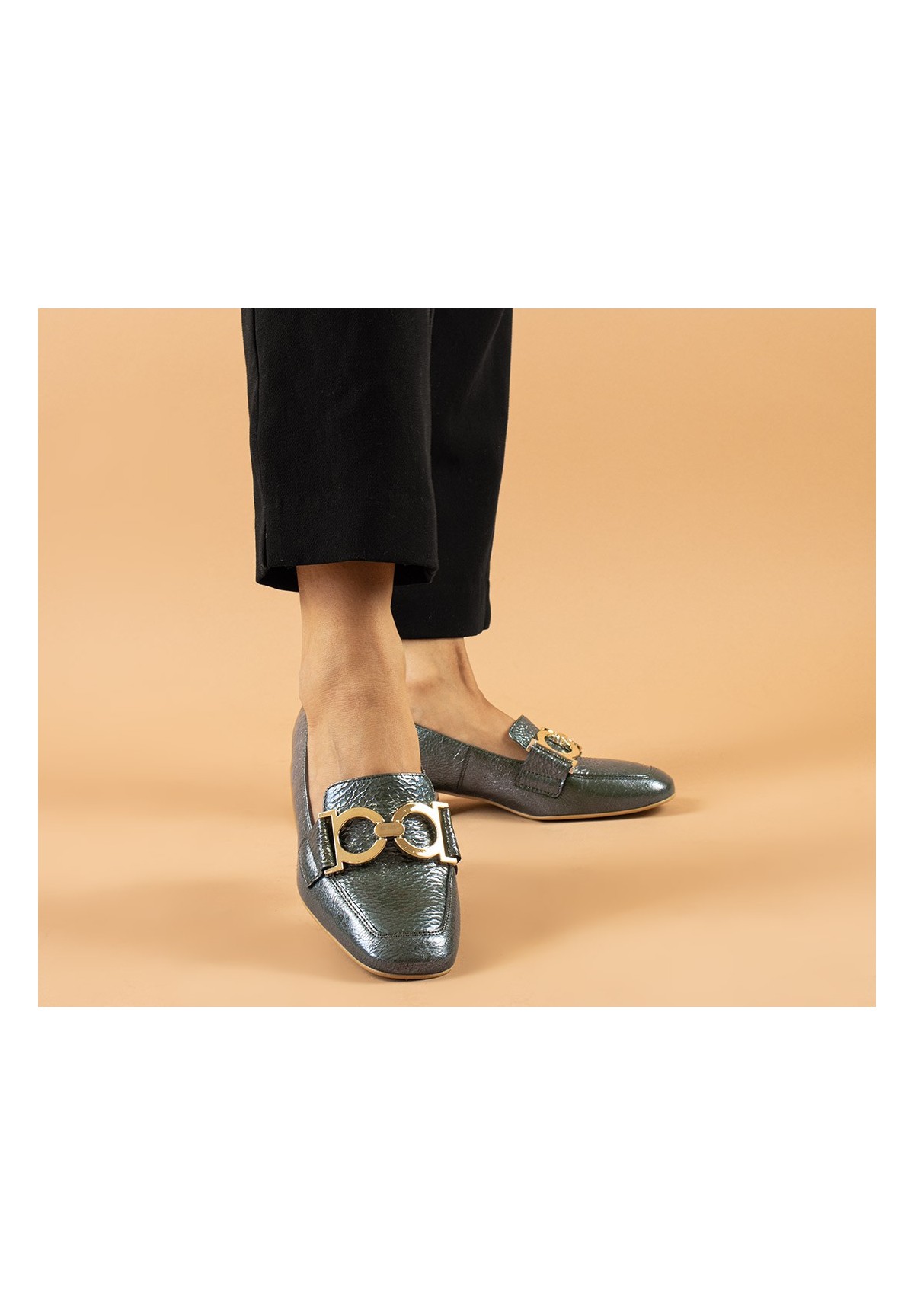 Czółenka damskie, wykonane z naturalnej skóry lakierowanej w kolorze zielonym. Ozdobione dekoracyjną sprzączką. Posiadają niski, kwadratowy obcas, dzięki któremu chodzenie w nich jest niezwykle wygodne. Nosek w kwadrat, optycznie skraca stopę. Wewnątrz wyściełane skórzaną wkładką, która zapewnia stopie komfort. Doskonałe do wielu stylizacji.