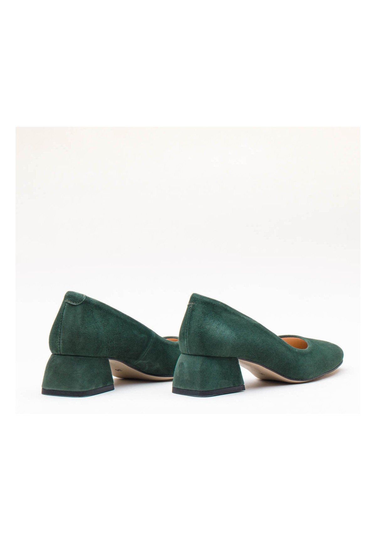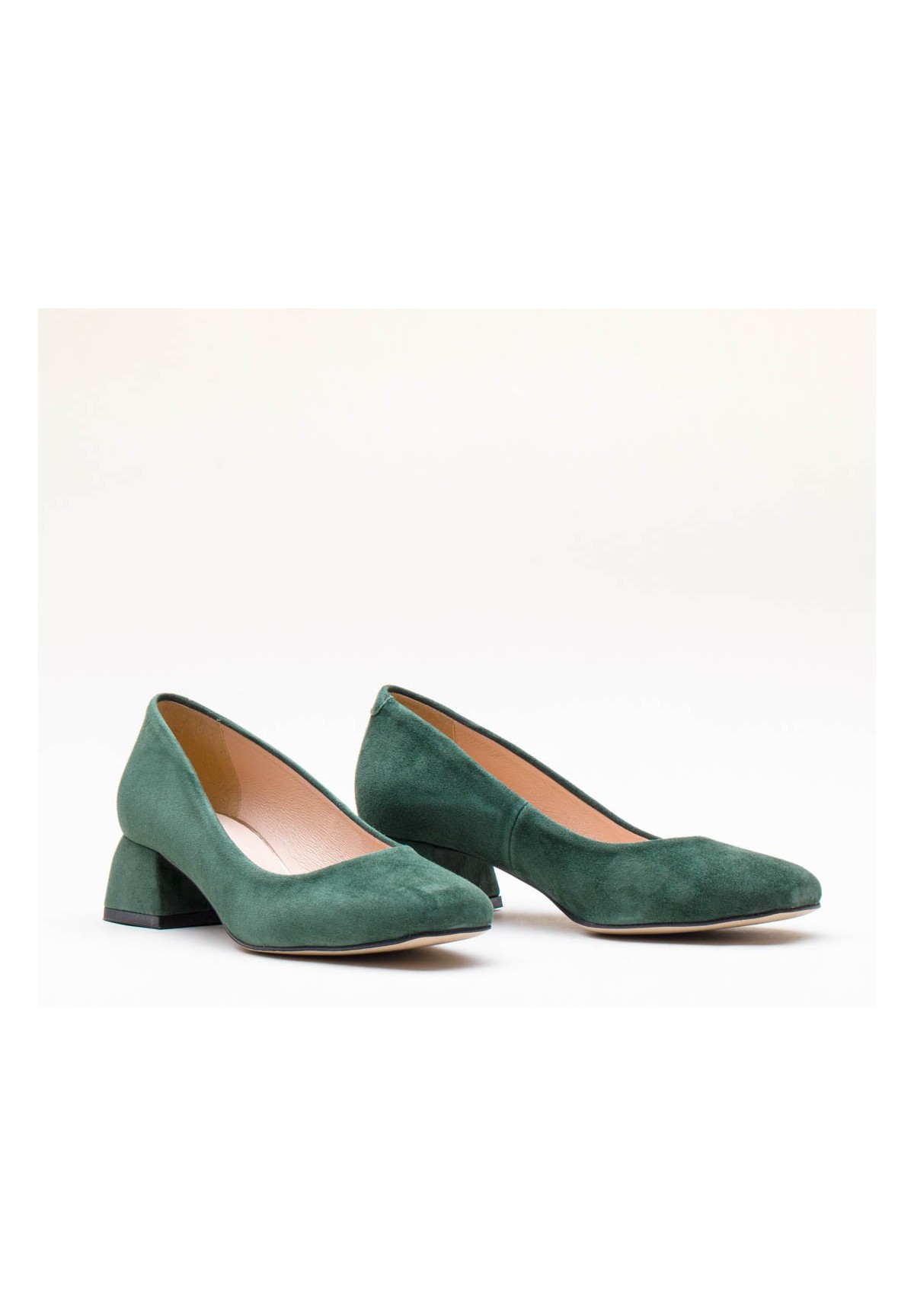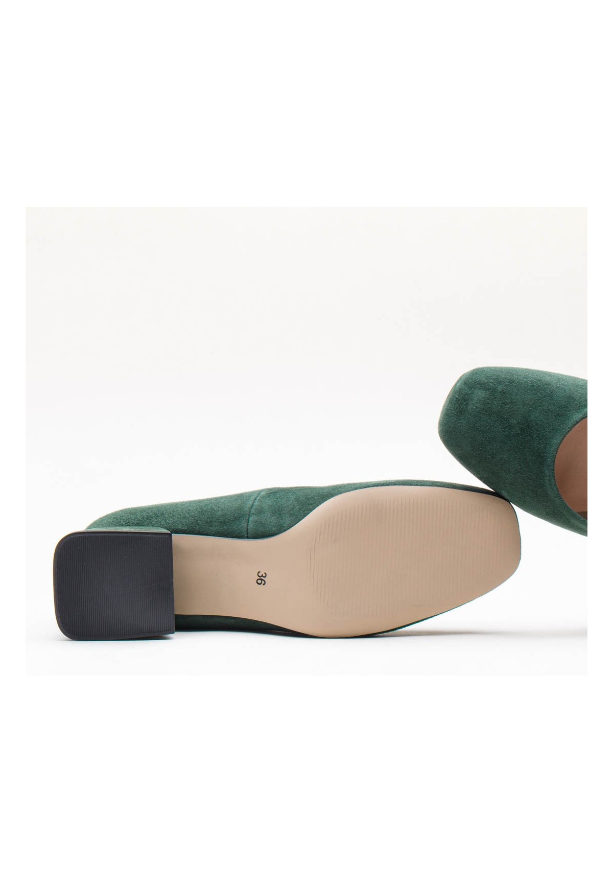 Czółenka na niskim słupku wykonane z naturalnej skóry zamszowej w kolorze zielonym.