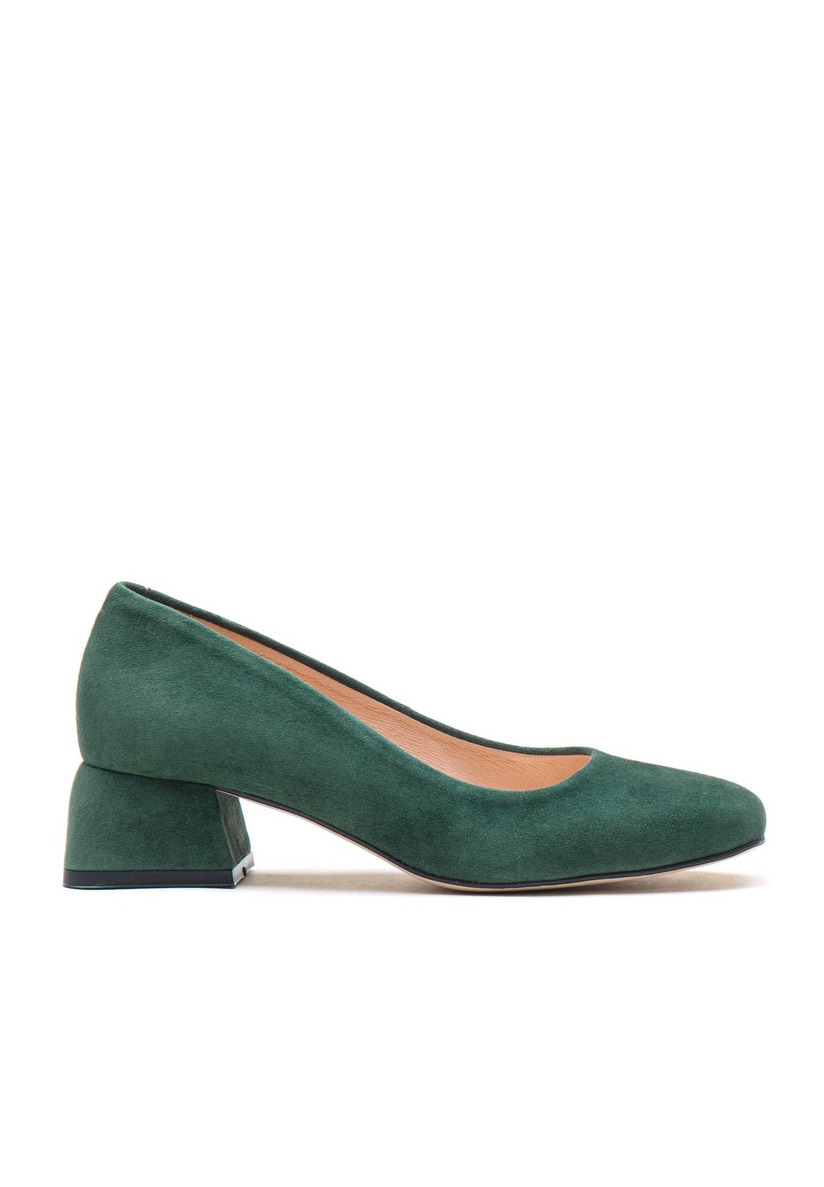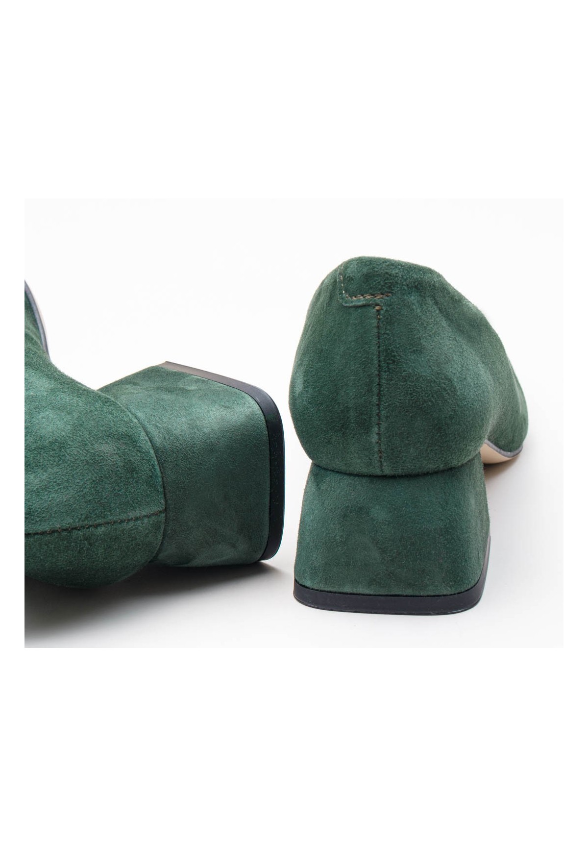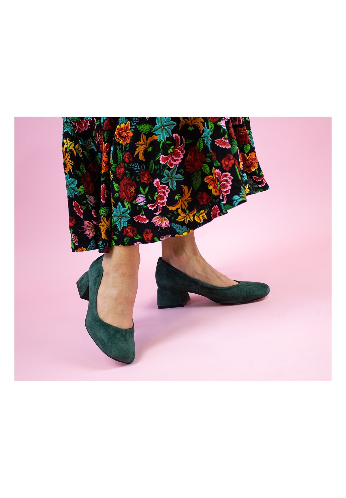 Czółenka na niskim słupku wykonane z naturalnej skóry zamszowej w kolorze zielonym.