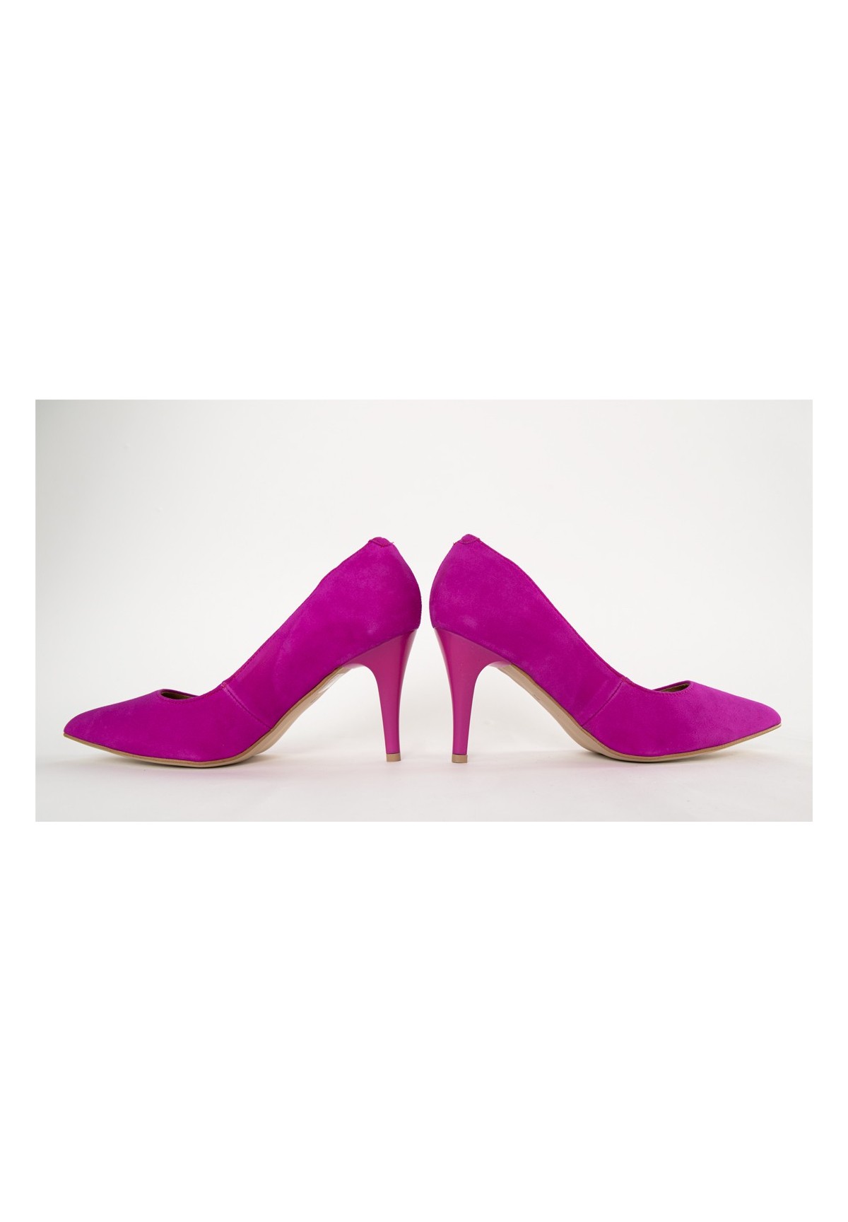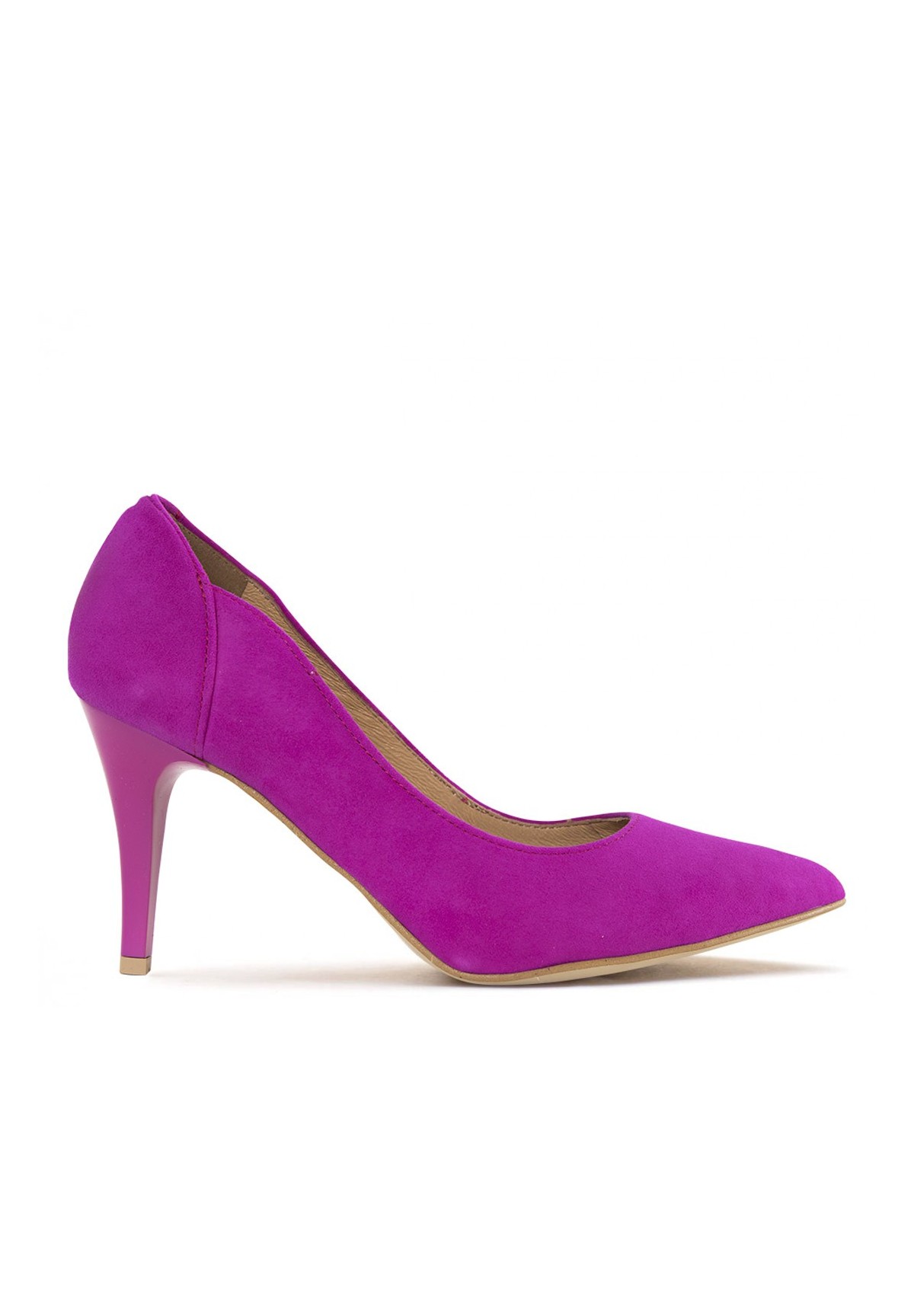 Czółenka damskie na wysokim obcasie, wykonane z naturalnej skóry zamszowej w kolorze fuksjowym. Sprawdzą się jako buty do wielu stylizacji. Wewnętrzna wyściółka ze skóry naturalnej zapewnia komfort chodzenia. Klasyczny krój w szpic i wysoka szpilka z pewnością optycznie wydłuży i wysmukli nogi.