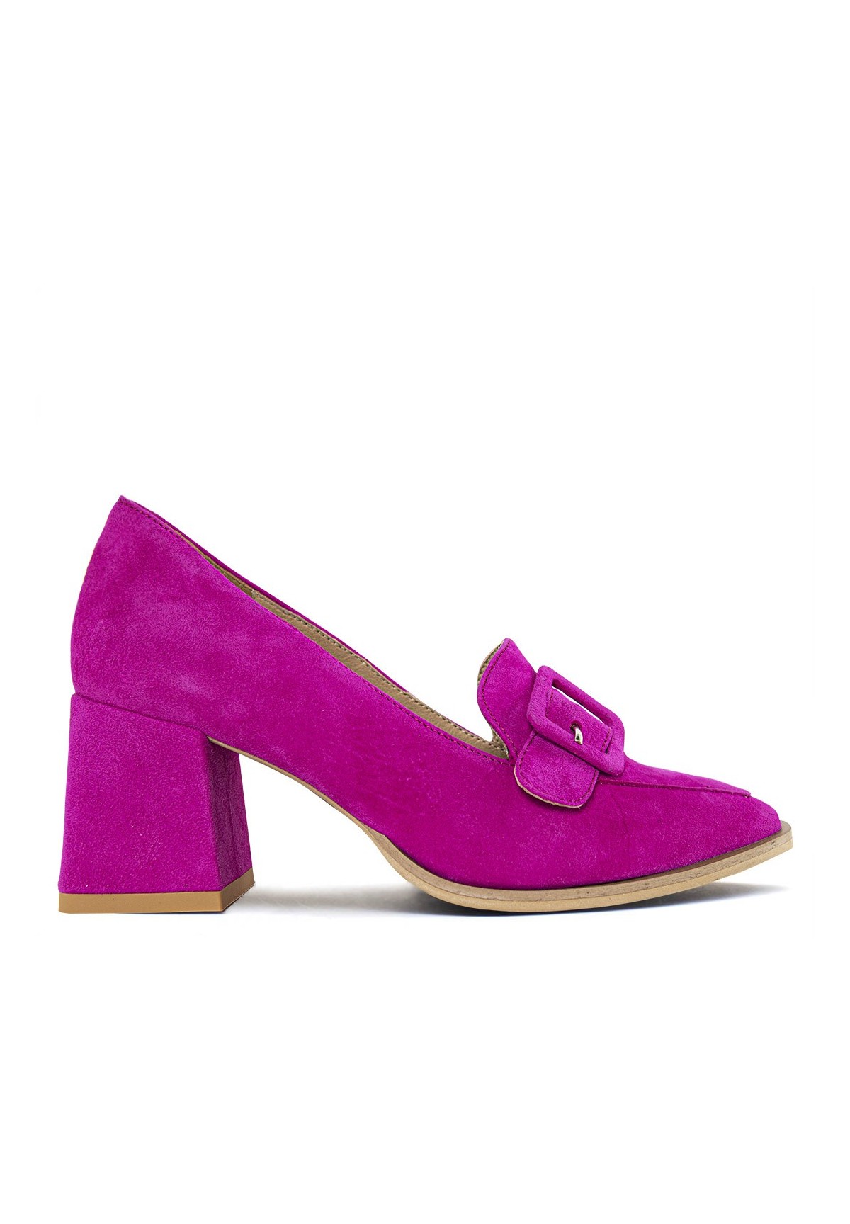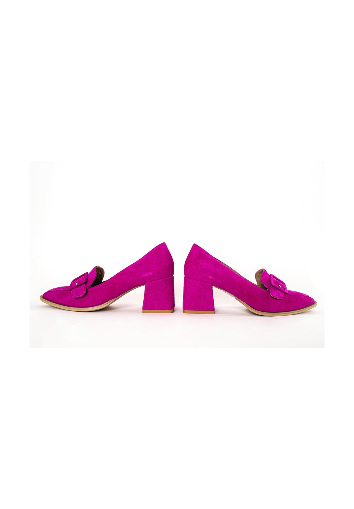 Czółenka damskie, wykonane z naturalnej skóry zamszowej w kolorze fuksjowym. Posiadają gruby, stabilny obcas typu słupek, dzięki któremu są niezwykle wygodne. Zdobi je delikatna, dodająca charakteru klamra. Uniwersalny model będzie dopełnieniem wielu stylizacji. Kwadratowy kształt noska nie uciska palców i optycznie skraca stopy. W środku buty mają miękką, skórzaną wkładkę dbającą o komfort stóp.