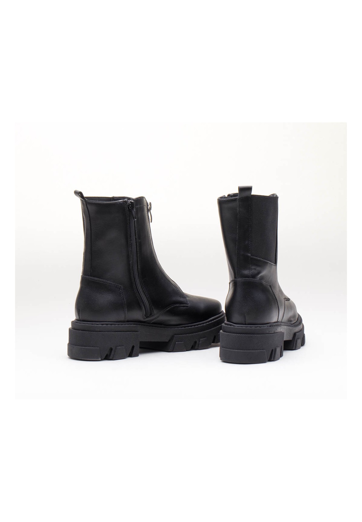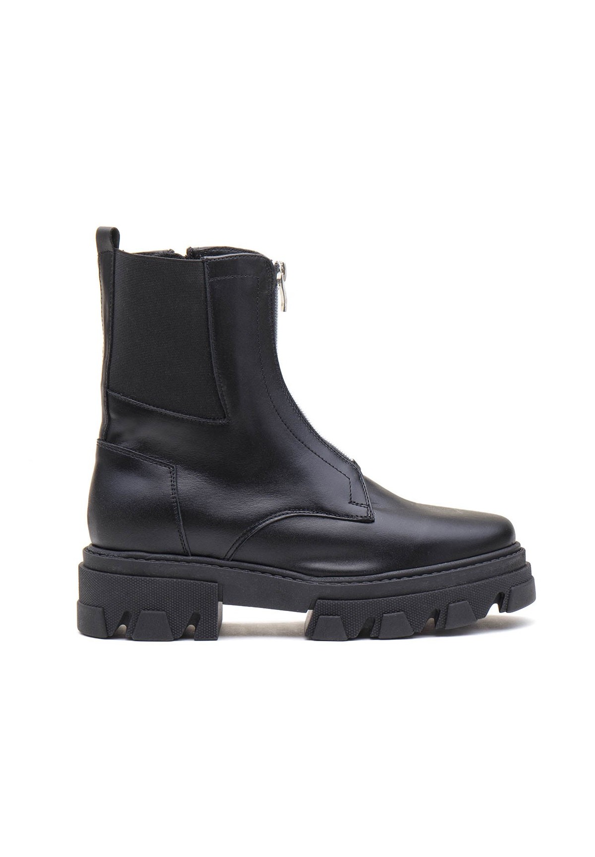 Czarne botki damskie, wykonane ze skóry licowej. Osadzone na grubej, masywnej podeszwie, zapewniającej doskonałą amortyzację i stabilność podczas chodzenia. Zapinane na zamek. Model z okrągłym noskiem. Cholewka dodatkowo zdobiona suwaniem. Wewnątrz skórzana wkładka zapewniająca komfort stopom.