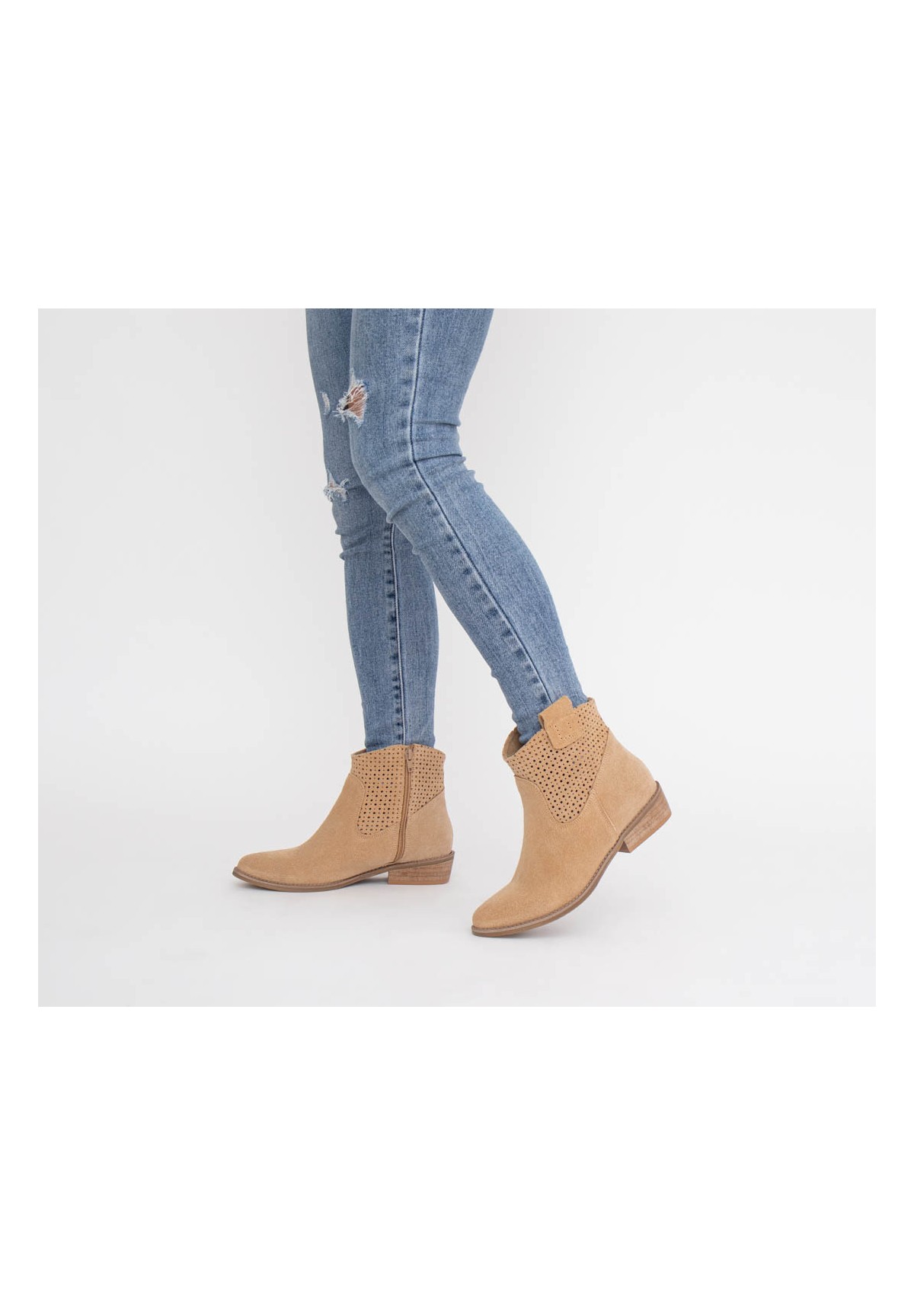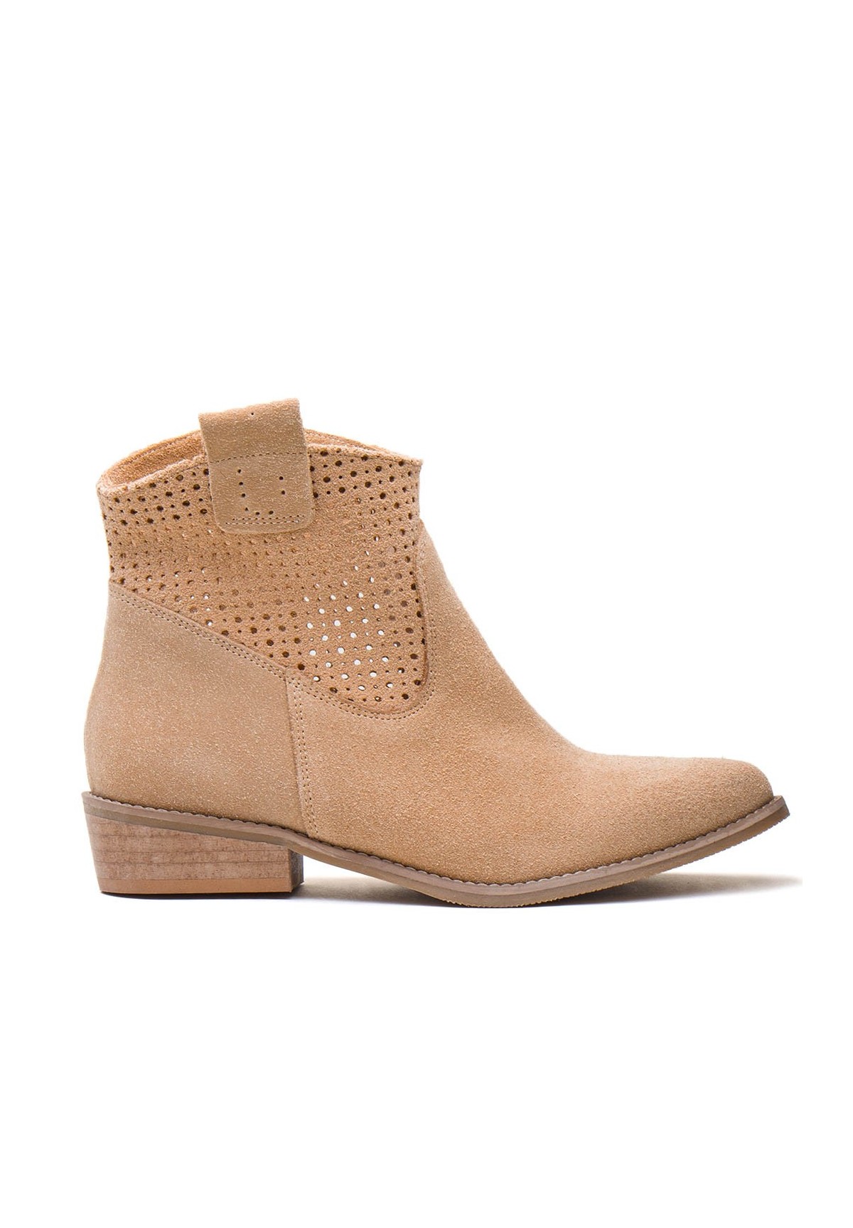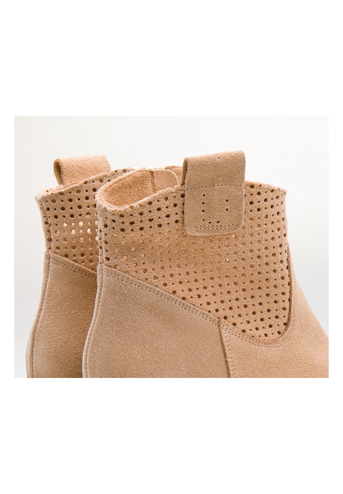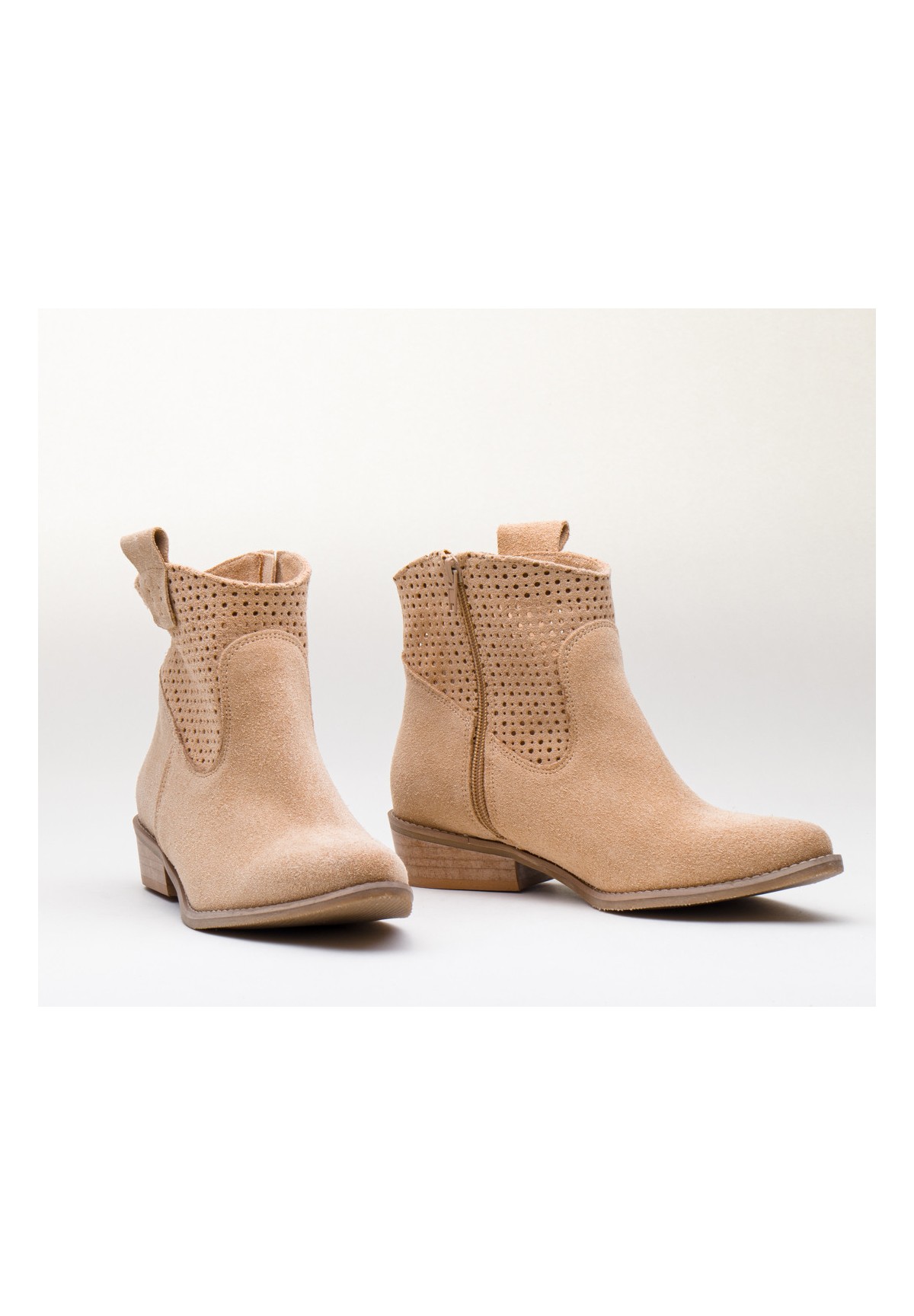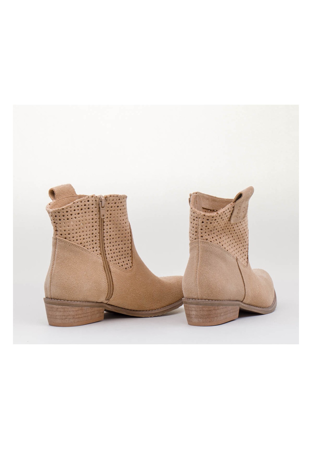 Stylowe, ażurowe botki damskie, wykonane z naturalnej skóry welurowej. Buty na niskim obcasie, niezwykle komfortowe. Po wewnętrznej stronie buta znajduje się zamek ułatwiający szybkie zakładanie i zdejmowanie. Górna część cholewki z performacją. Doskonałe do jesiennych stylizacji, w zestawieniu z czarnymi rajstopami, spódnicą oraz grubym swetrem.