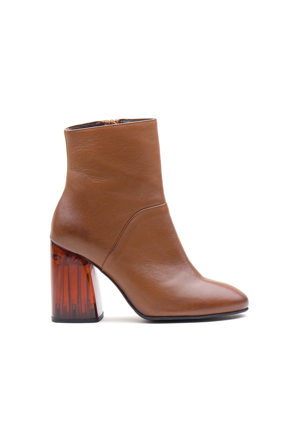 Eleganckie botki damskie, wykonane z naturalnej skóry licowej. Model nad kostkę. Posiadają wysoki obcas typu słupek, mierzącym 9 cm. Po wewnętrznej stronie zapinane za pomocą zamka. Buty posiadają okrągły nosek. Wewnątrz znajduje się skórzana wkładka, która zapobiega poceniu oraz ślizganiu się stopy.