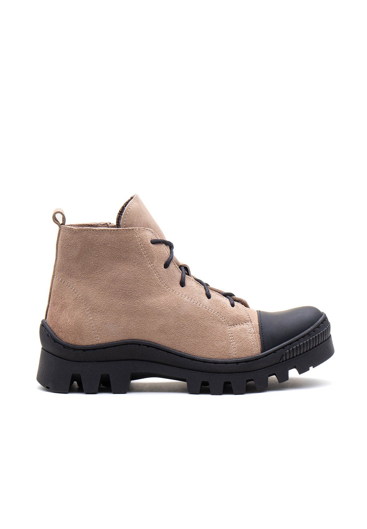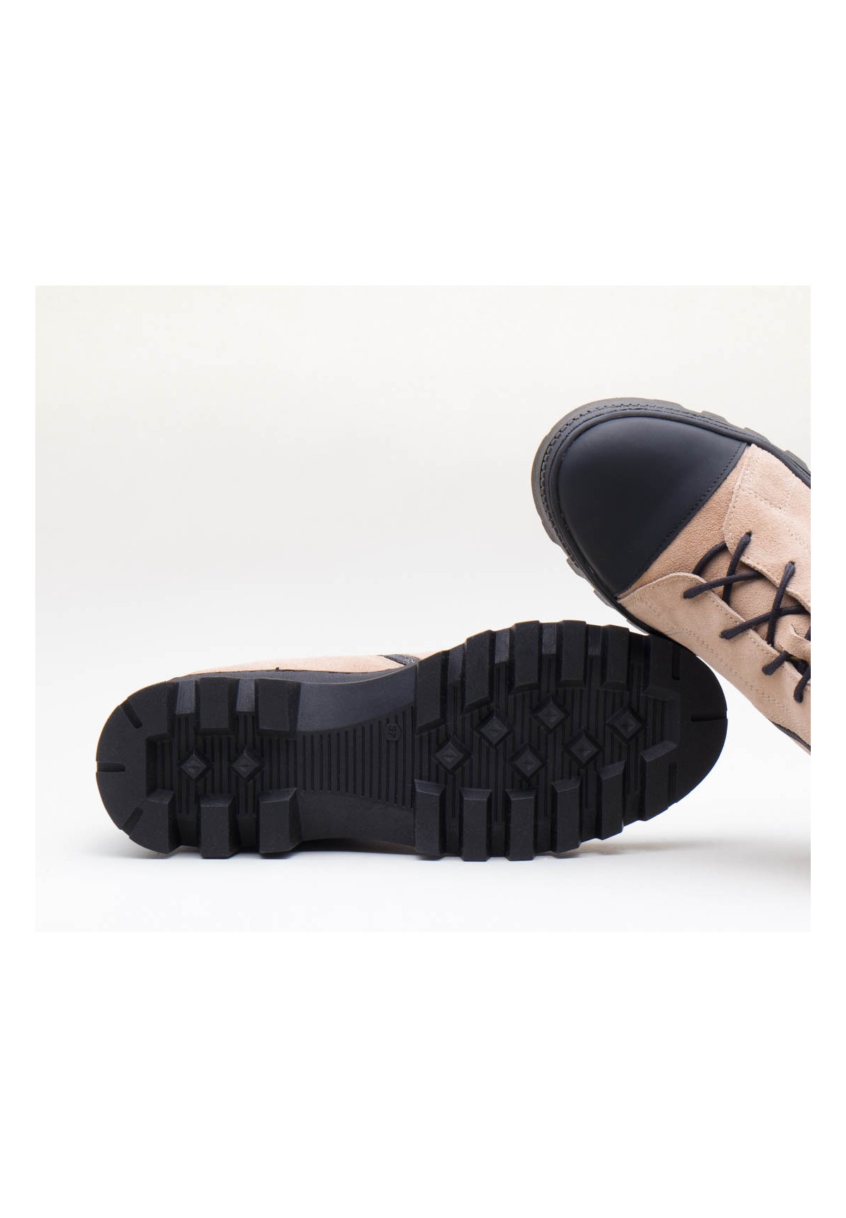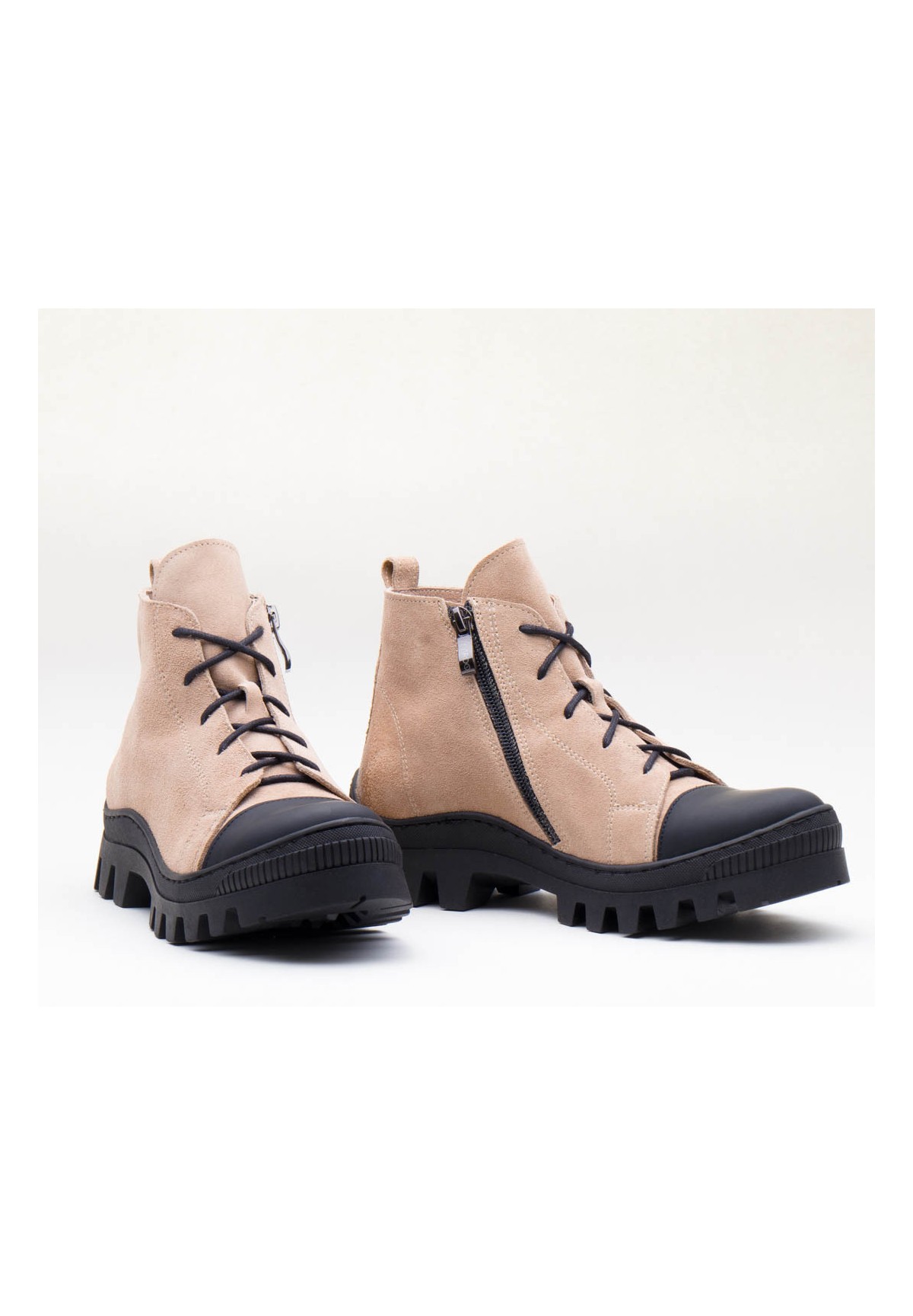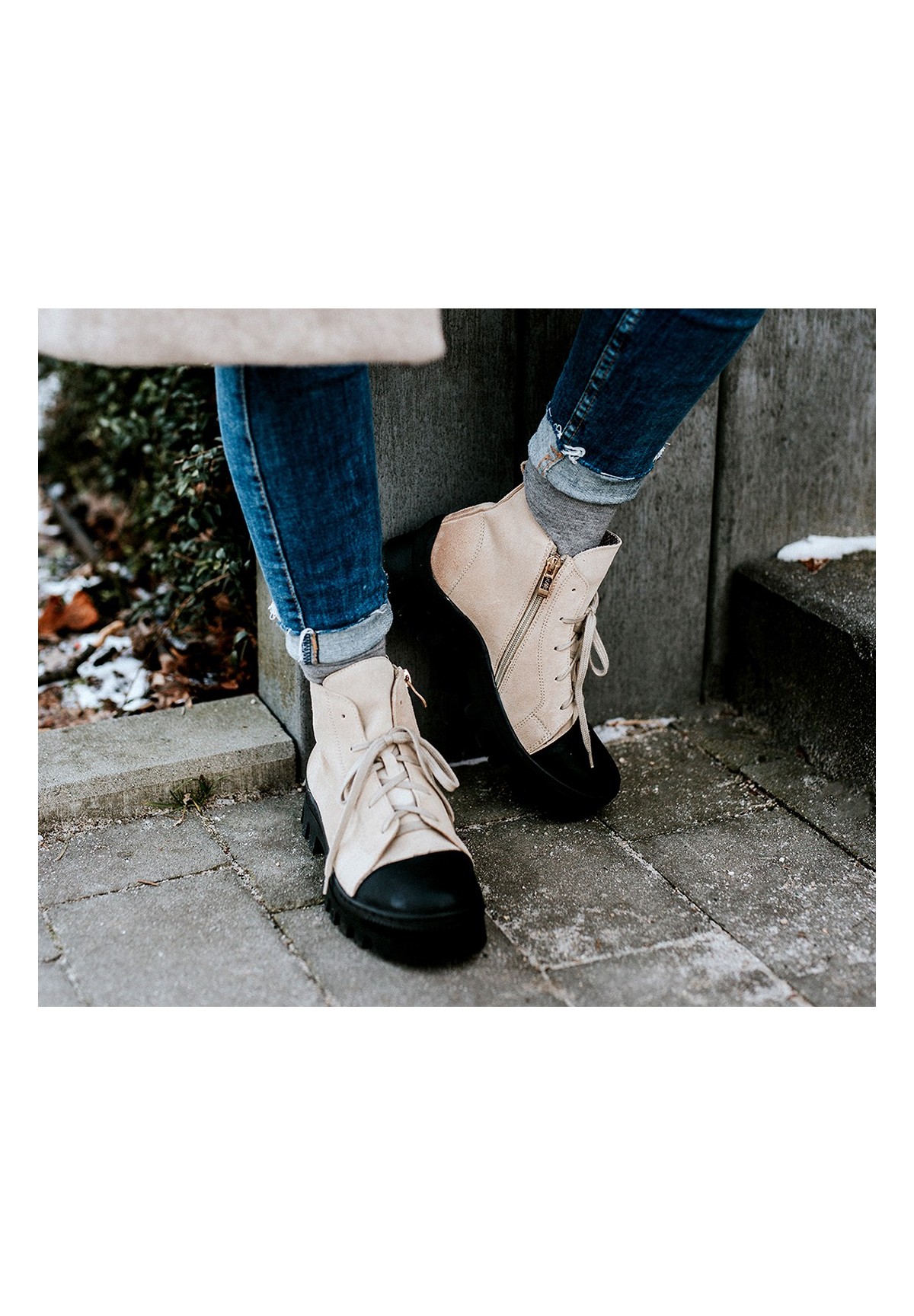 Botki damskie, to doskonały wybór na spacery w chłodniejsze dni. Wykonane ze skóry naturalnej welurowej w kolorze beżowym. Dodatkowo nosek wykończony skórą licową. Gruba podeszwa z głębokim bieżnikiem sprawia, że buty są bardzo stabilne i komfortowe podczas chodzenia. Zapinane po wewnętrznej stronie na zamek, który ułatwia szybkie zakładanie i zdejmowanie. Dzięki sznurowaniu można je idealnie dopasować do tęgości stopy.