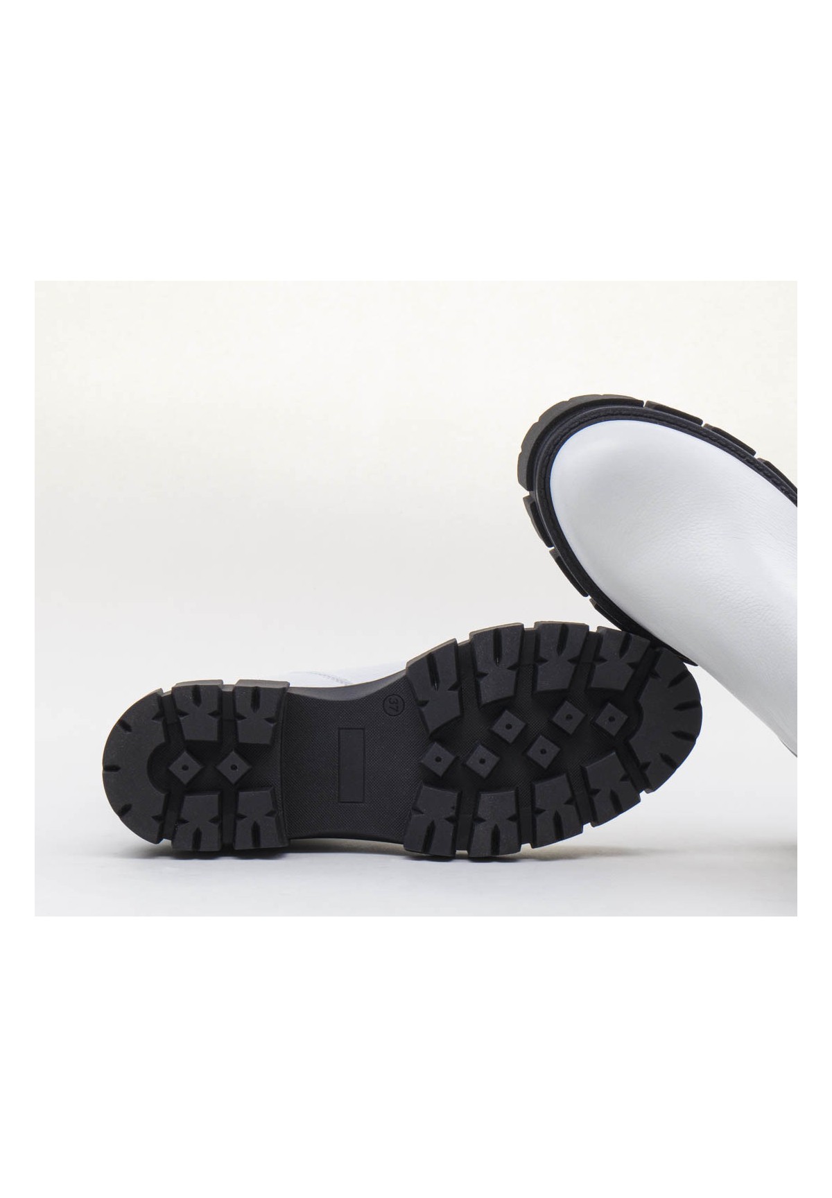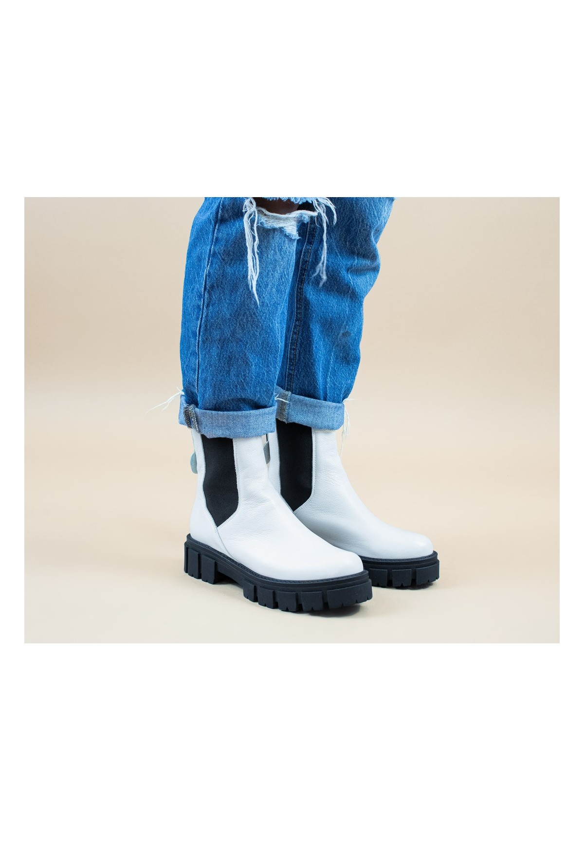 Białe, ocieplane botki damskie, wykonane ze skóry licowej o fakturze groszkowej. Z obu stron wszyta elastyczna wstawka, dzięki której ubieranie ich jest niezwykle wygodne i szybkie. Klasyczny model na wysokiej, stabilnej podeszwie. Model nad kostkę. Doskonale sprawdzą się w zimne, jesienno-zimowe dni.
