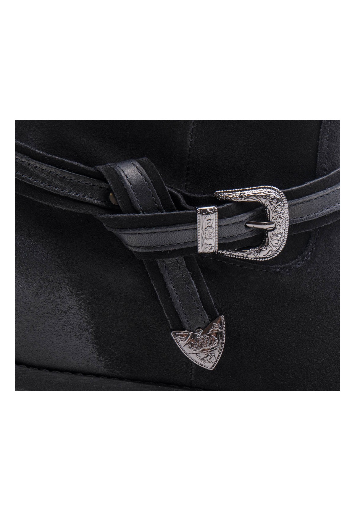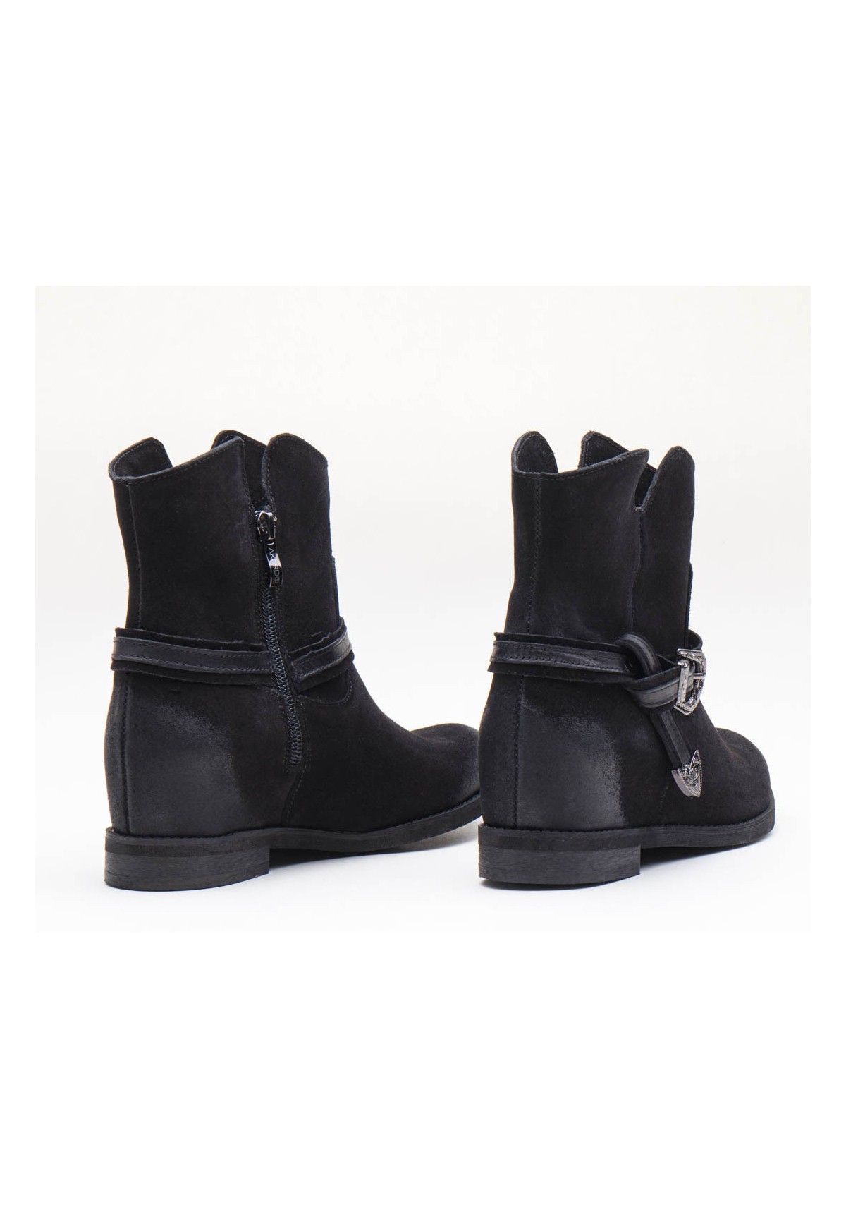 Botki damskie w kolorze czarnym, wykonane ze skóry naturalnej welurowej. Wewnątrz buta znajduje się podwyższający klin. Botki zdobione paskiem ze sprzączką na wysokości kostki. Zapinane za pomocą zamka, dzięki któremu zakładanie i zdejmowanie jest szybkie.