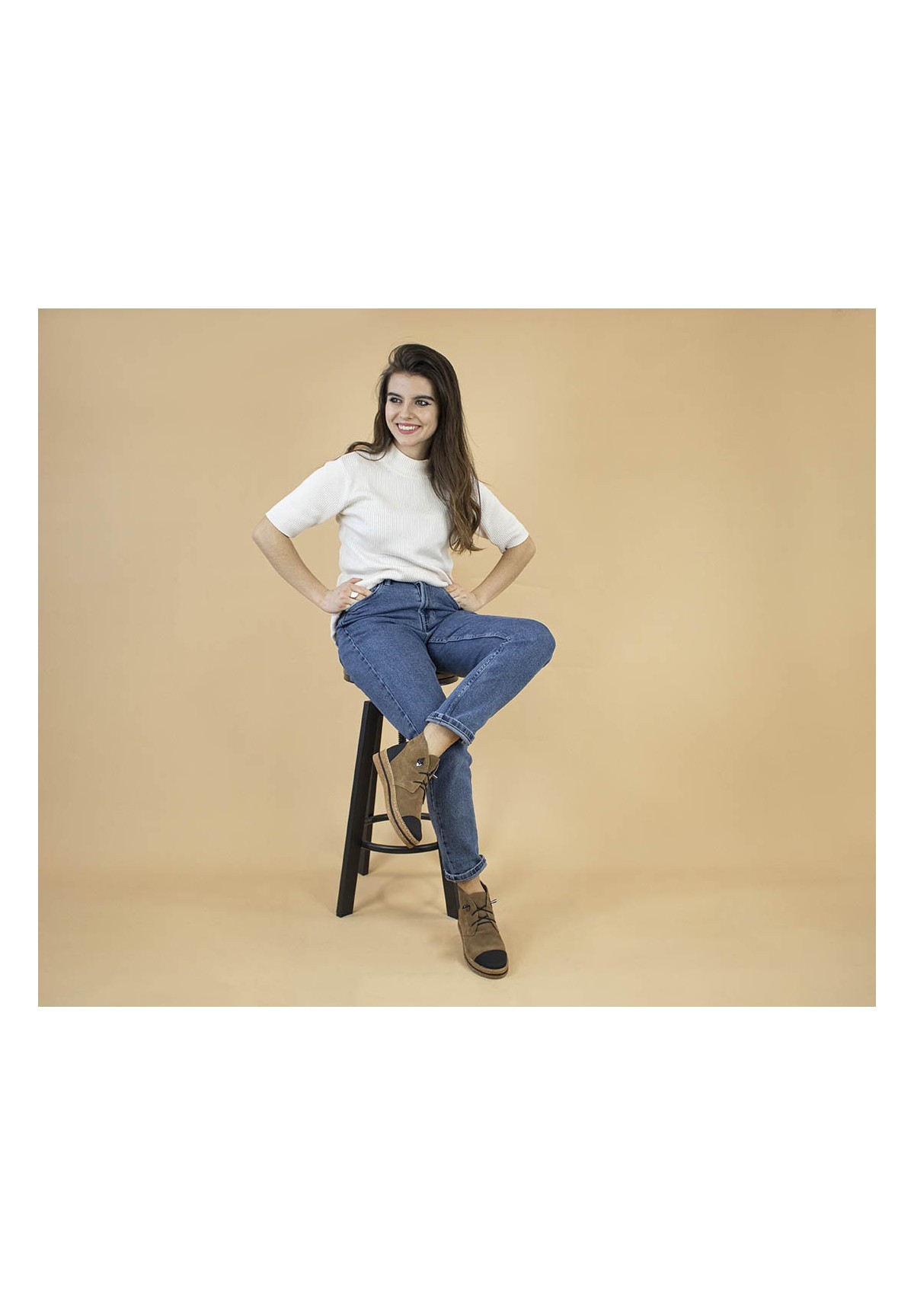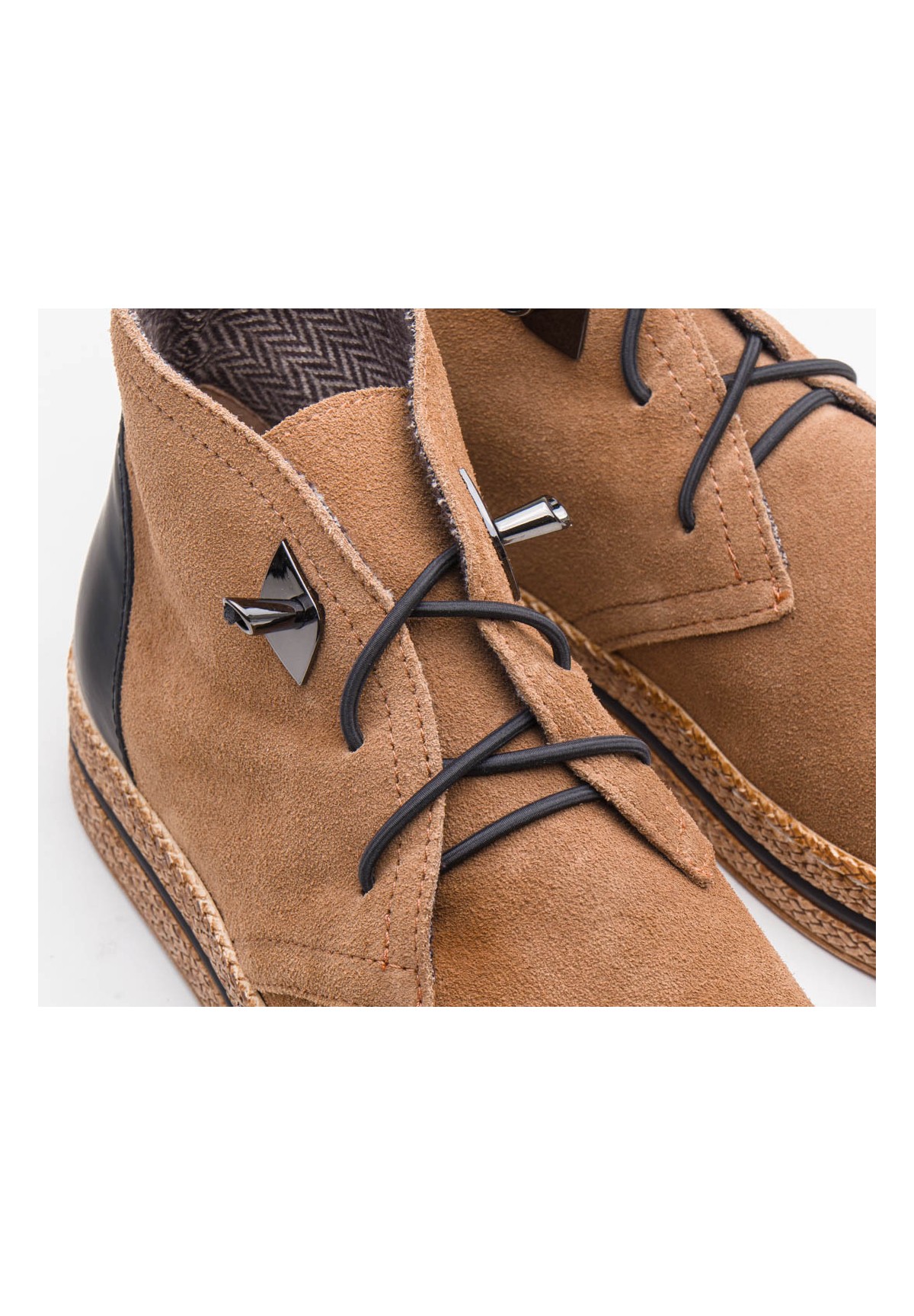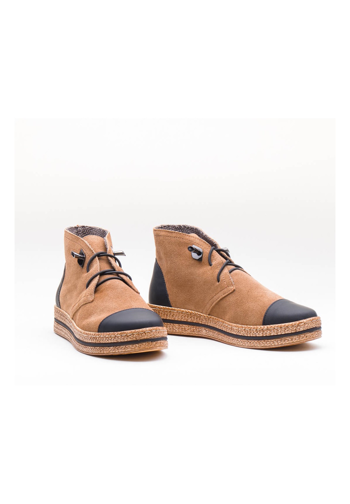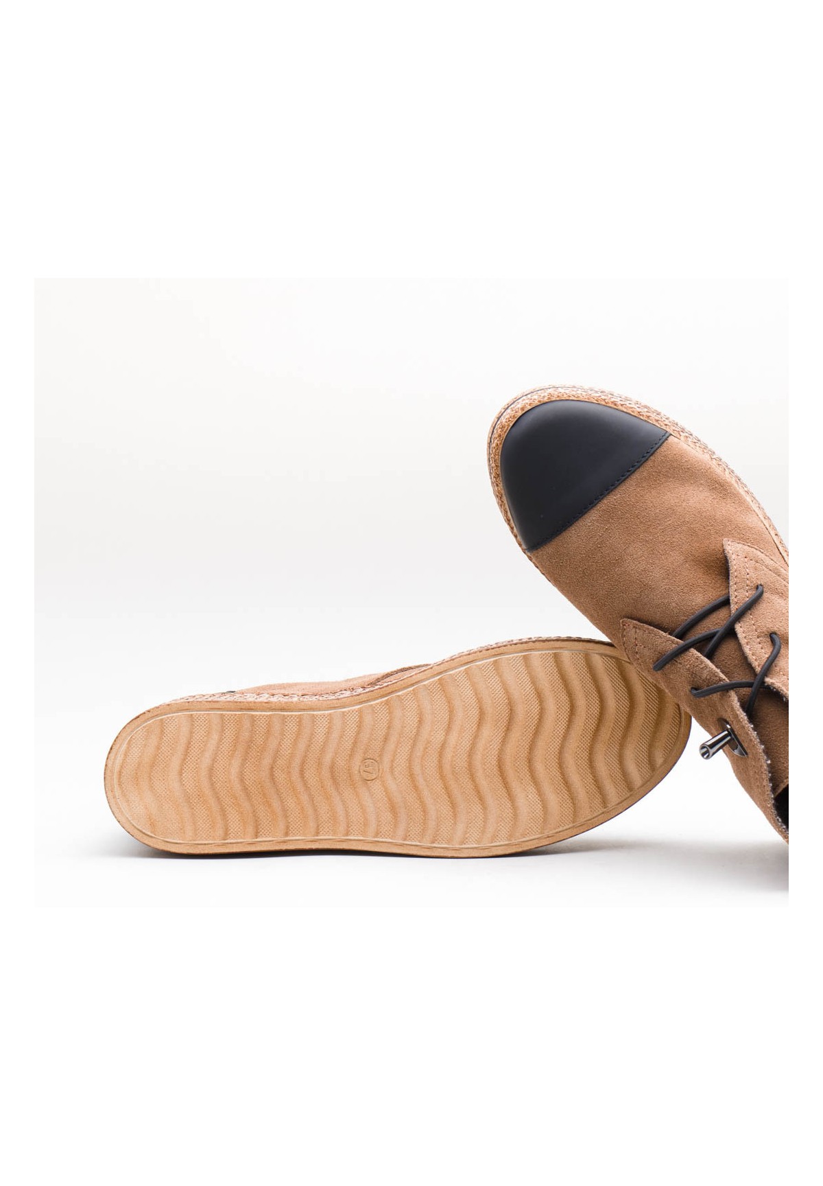 Krótkie botki damskie, wykonane ze skóry naturalnej welurowej. Nosek oraz zapiętek wzmocnione skórą licową. Wiązane za pomocą cienkich, okrągłych sznurowadeł. Posiadają ozdobną podeszwę. Buty niezwykle wygodne, świetnie prezentują się w wielu stylizacjach.