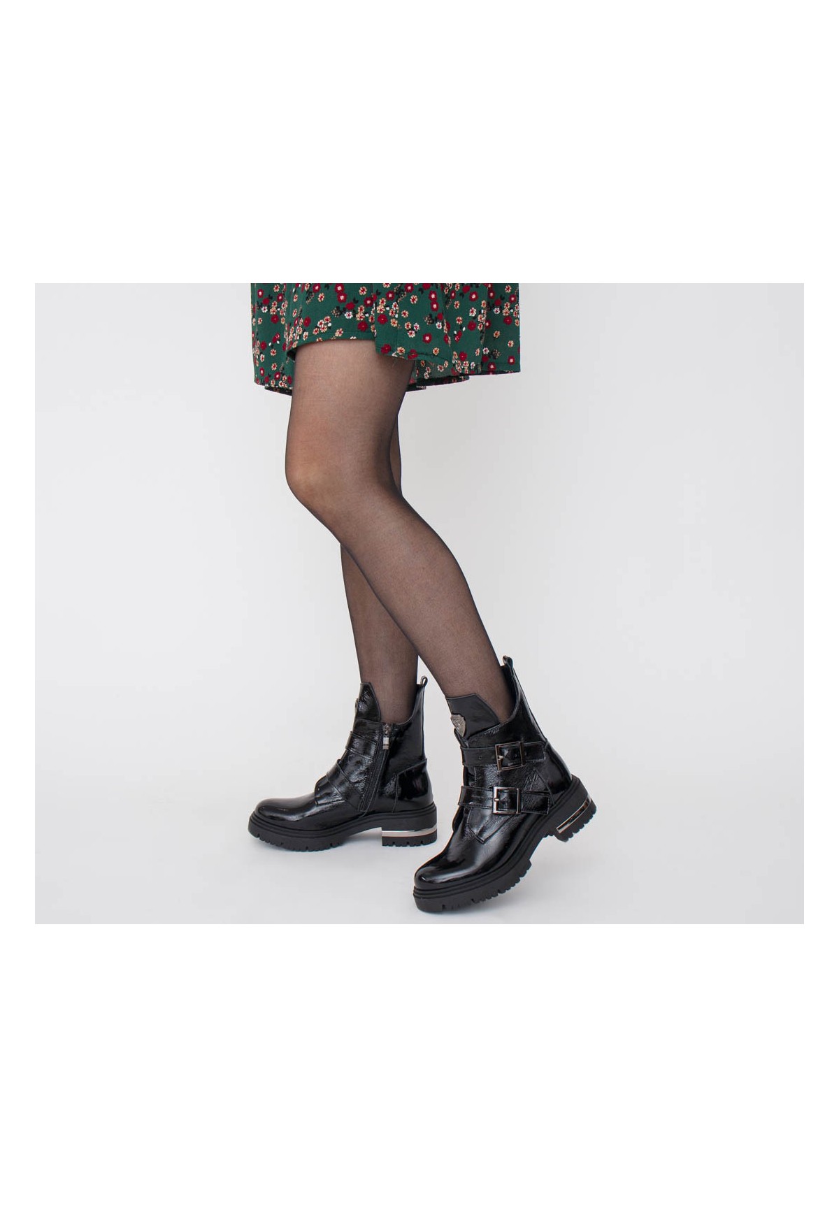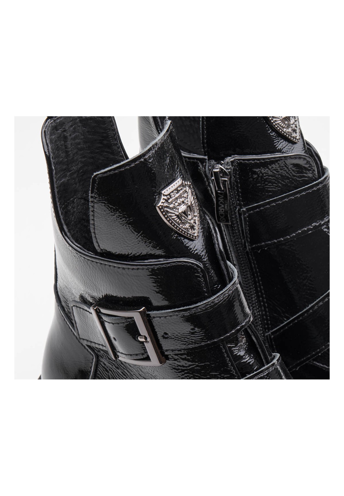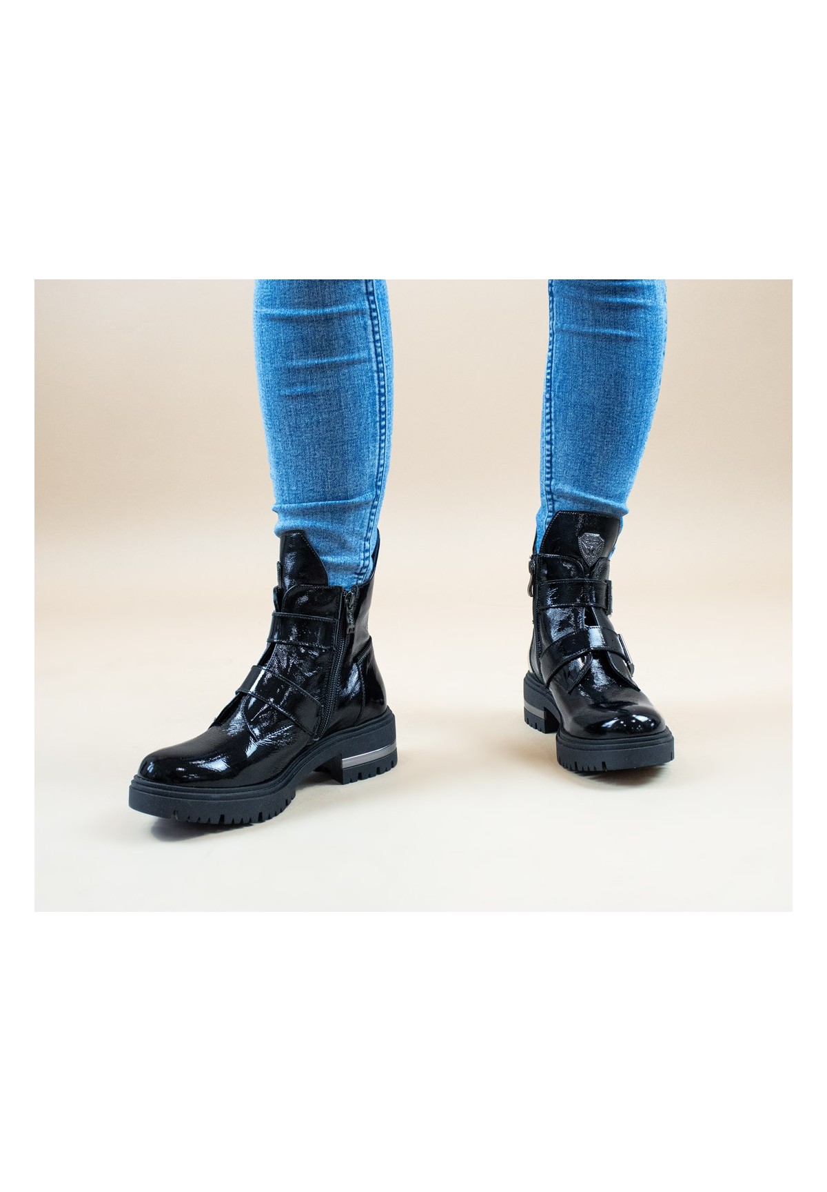 Botki damskie, wykonane ze skóry naturalnej typu naplak (miękki lakier). Posiadają ozdobne klamry, dodające charakteru. Po wewnętrznej stronie zapinane na zamek. Osadzone na grubej podeszwie z ozdobionym obcasem. Niezwykle wygodne i stabilne.