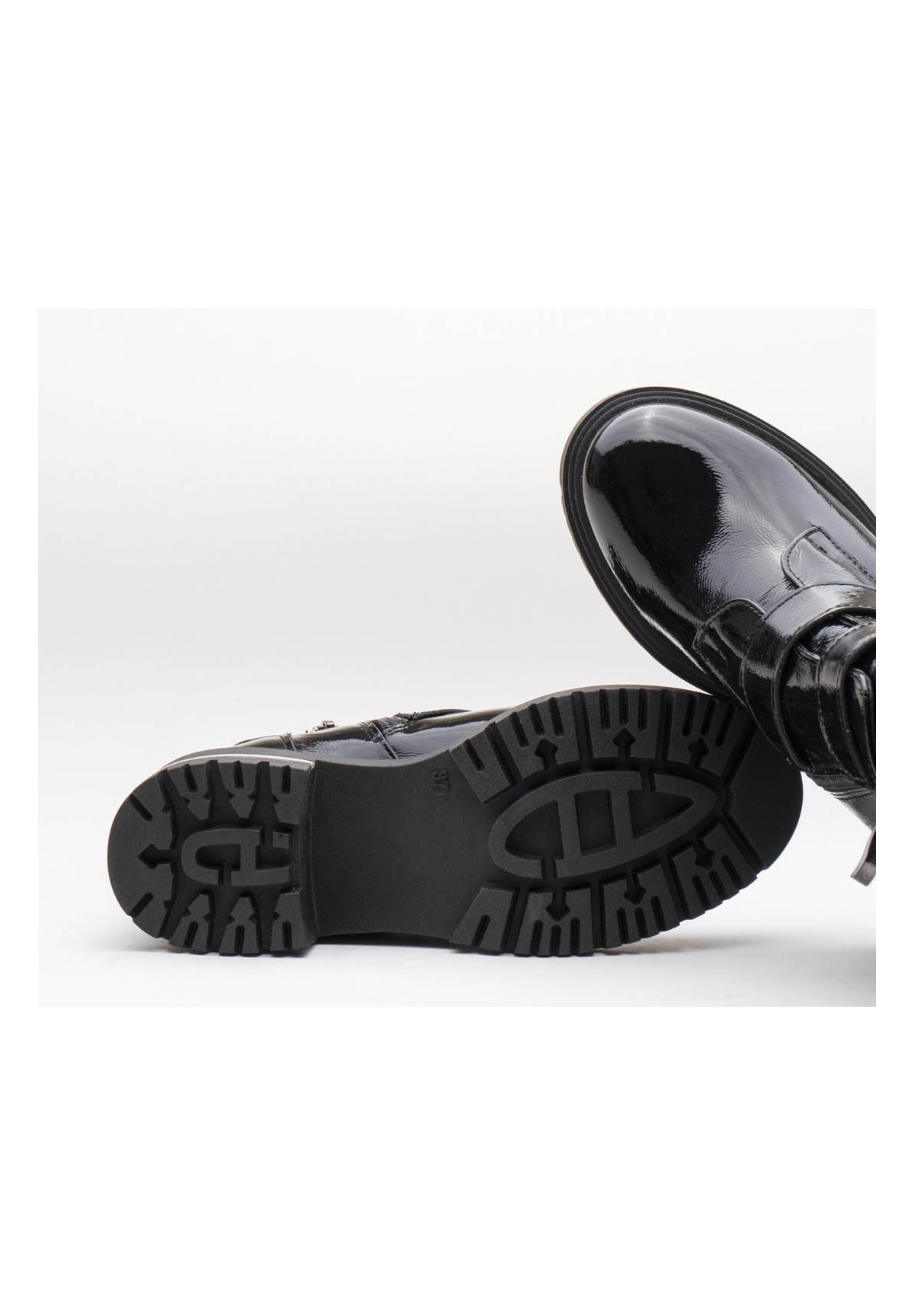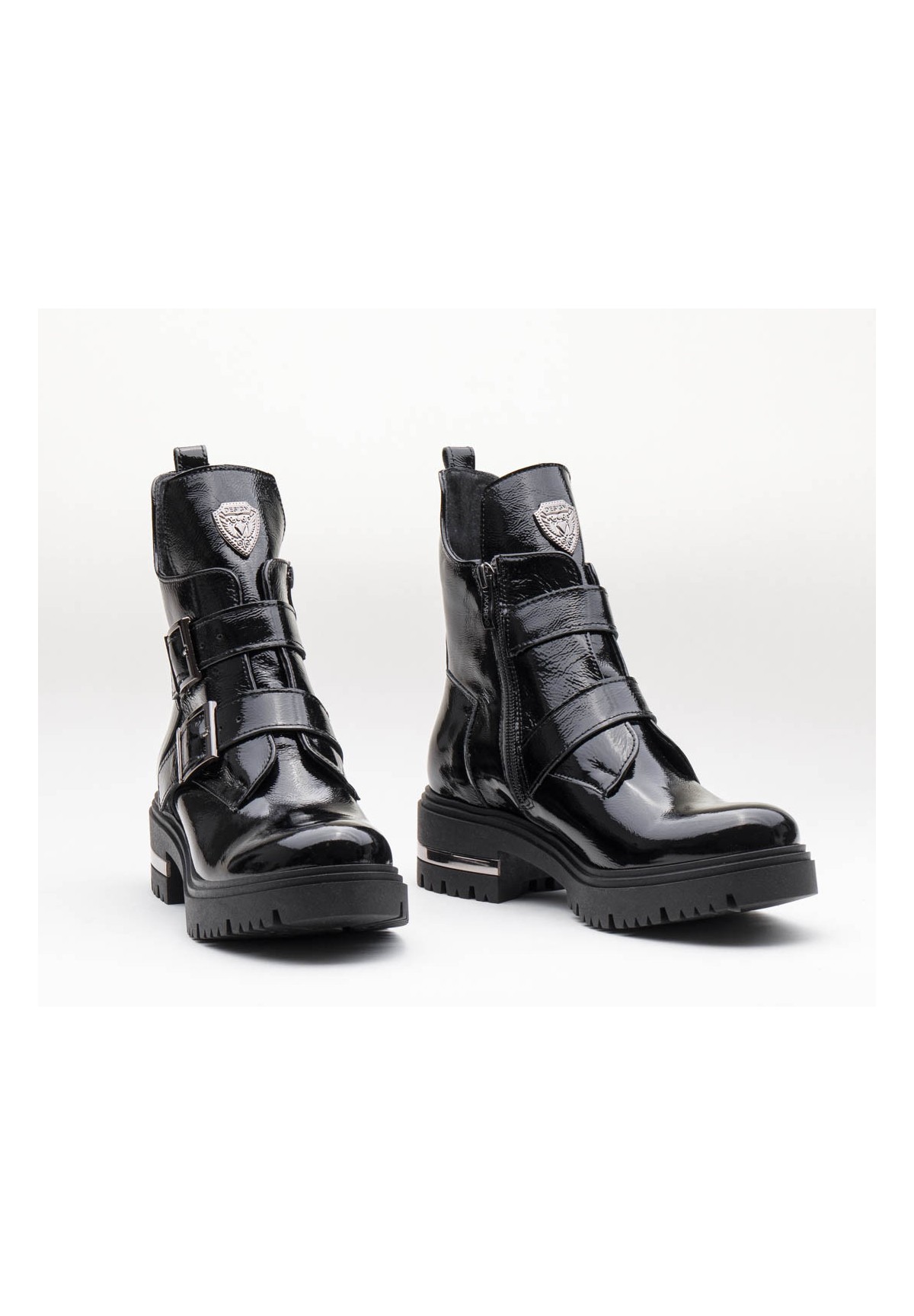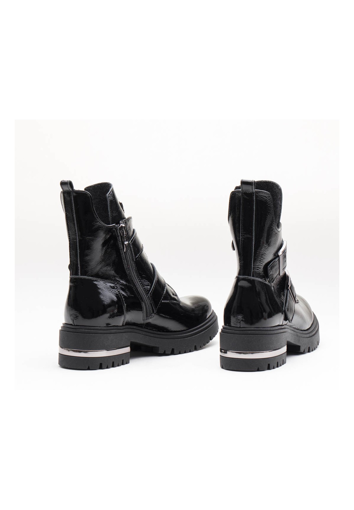 Botki damskie, wykonane ze skóry naturalnej typu naplak (miękki lakier). Posiadają ozdobne klamry, dodające charakteru. Po wewnętrznej stronie zapinane na zamek. Osadzone na grubej podeszwie z ozdobionym obcasem. Niezwykle wygodne i stabilne.