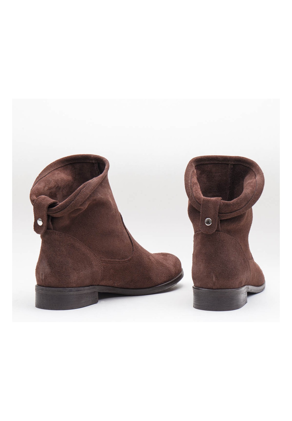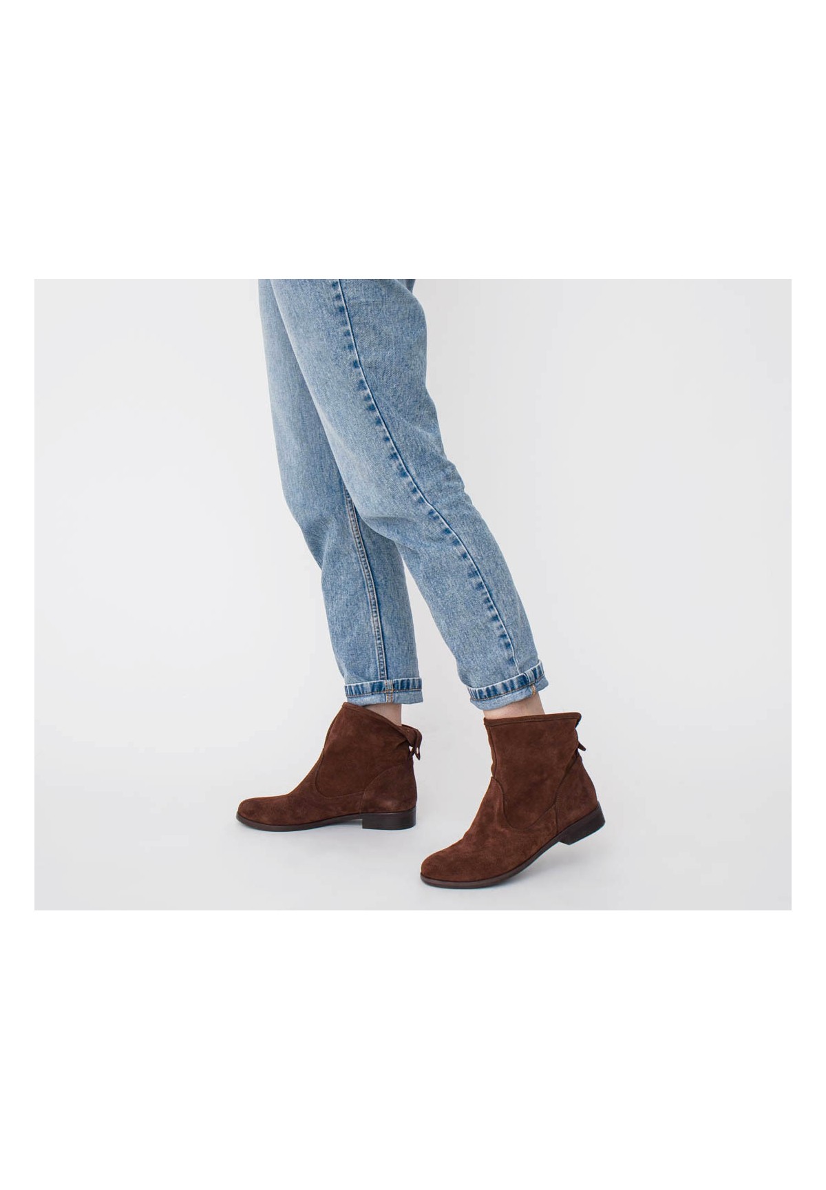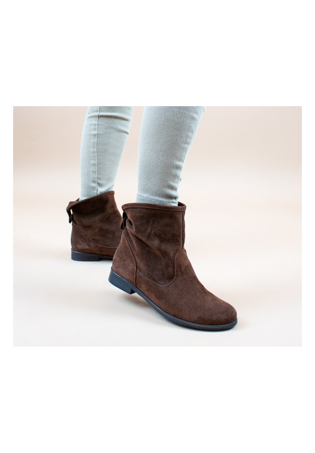 Botki damskie nad kostkę, wykonane z naturalnej skóry welurowej w kolorze brązowym. Stabilne i wygodne. Osadzone na podeszwie posiadającej niski obcas. Wewnątrz znajduje się skórzana wkładka, która zapewnia doskonały komfort stopie. Buty wsuwane, z dekoracyjnym zapięciem z tyłu.