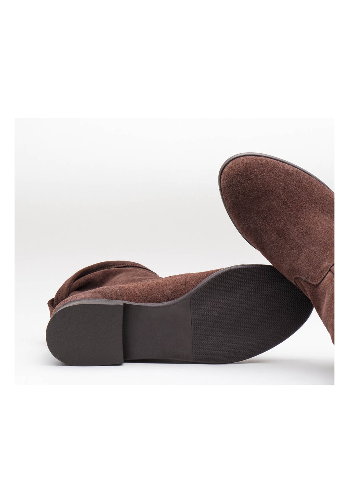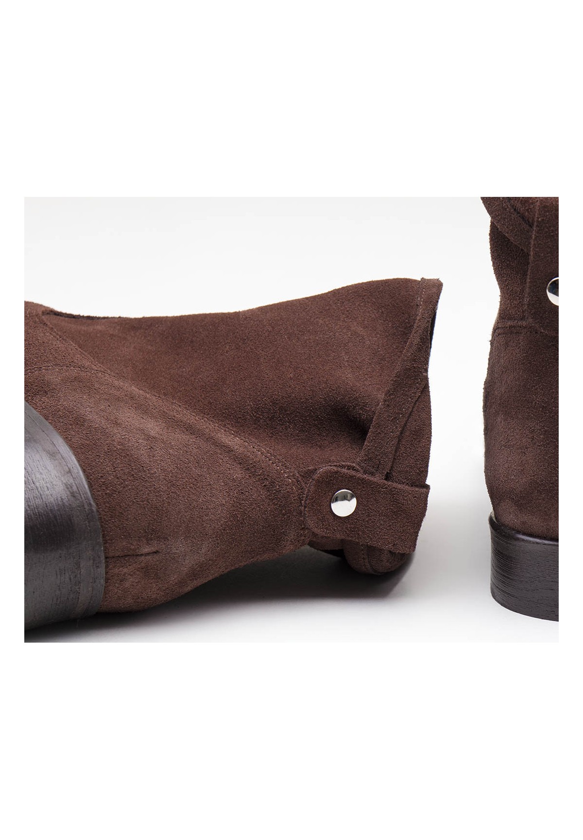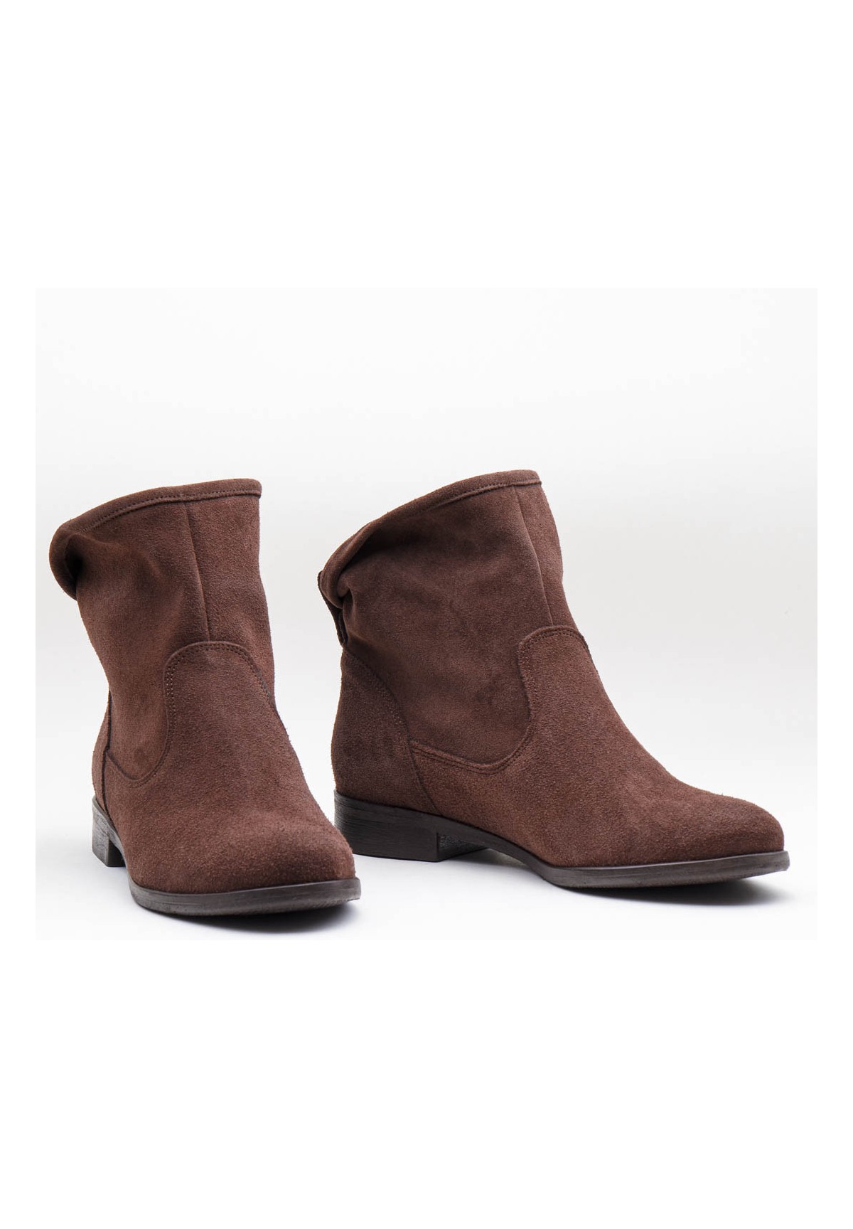 Botki damskie nad kostkę, wykonane z naturalnej skóry welurowej w kolorze brązowym. Stabilne i wygodne. Osadzone na podeszwie posiadającej niski obcas. Wewnątrz znajduje się skórzana wkładka, która zapewnia doskonały komfort stopie. Buty wsuwane, z dekoracyjnym zapięciem z tyłu.
