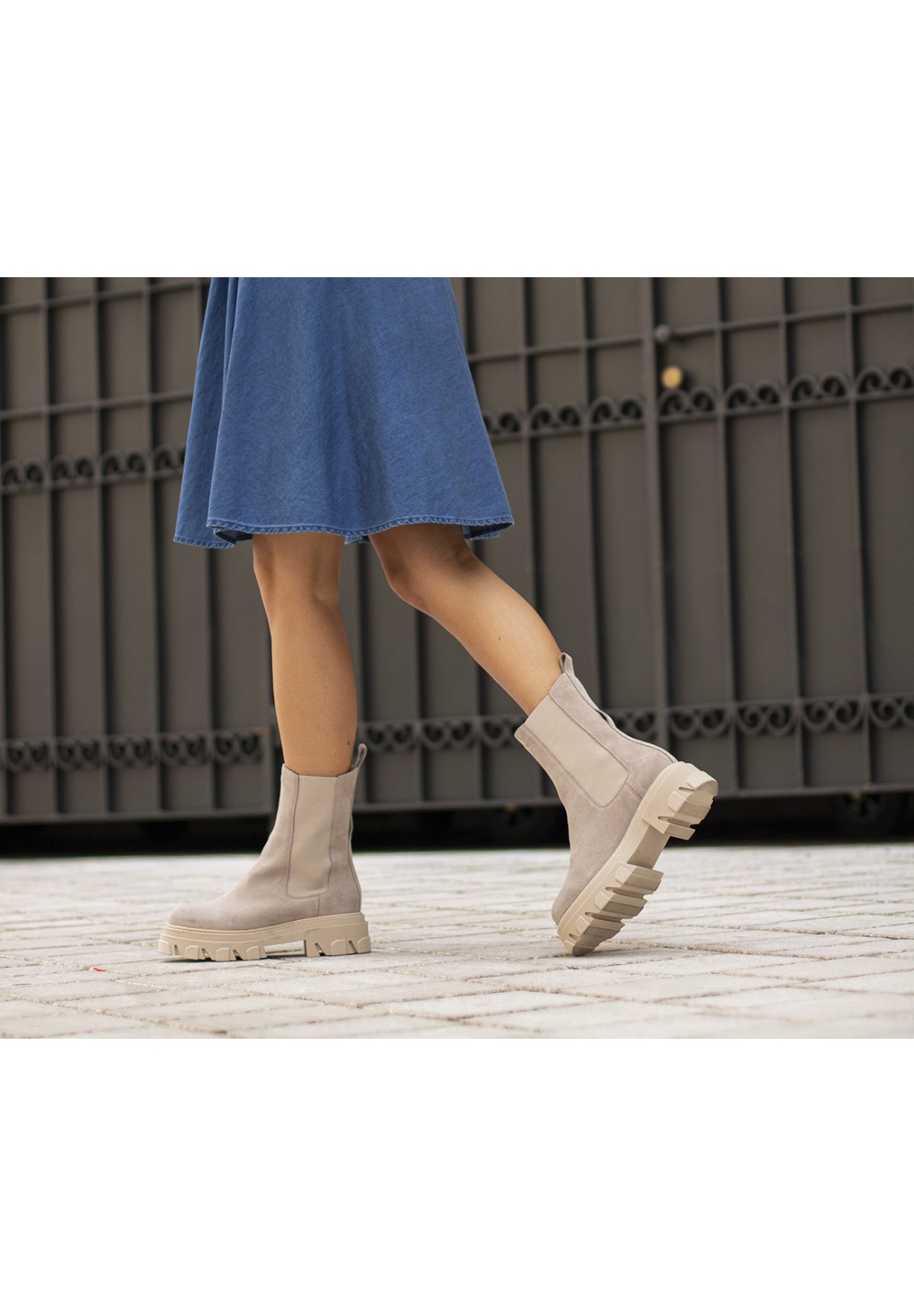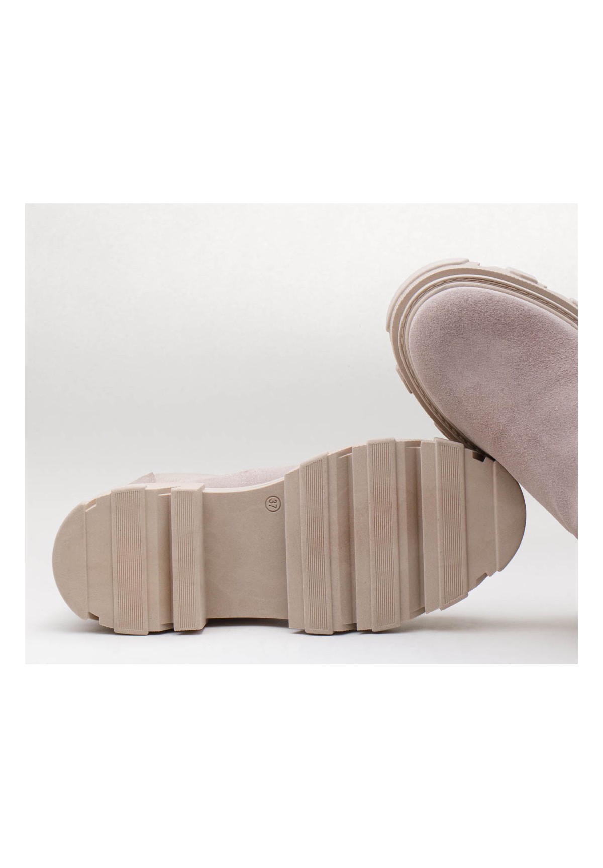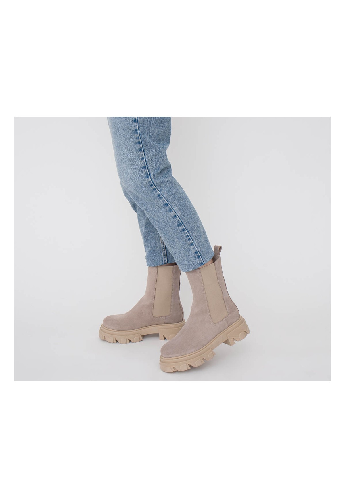 Beżowe botki damskie z okrągłym noskiem, to idealne obuwie do wielu wiosennych, jak i jesiennych stylizacji. Buty wykonane są z miękkiej, welurowej skóry naturalnej. Z obu stron wszyto elastyczną wstawkę, dzięki której ubieranie ich jest niezwykle wygodne i szybkie. Osadzone na grubej podeszwie, zapewniającej stabilność oraz komfort chodzenia. Wewnątrz znajduje się skórzana wkładka, sprawiająca, że stopa nie poci się. Model nad kostkę.