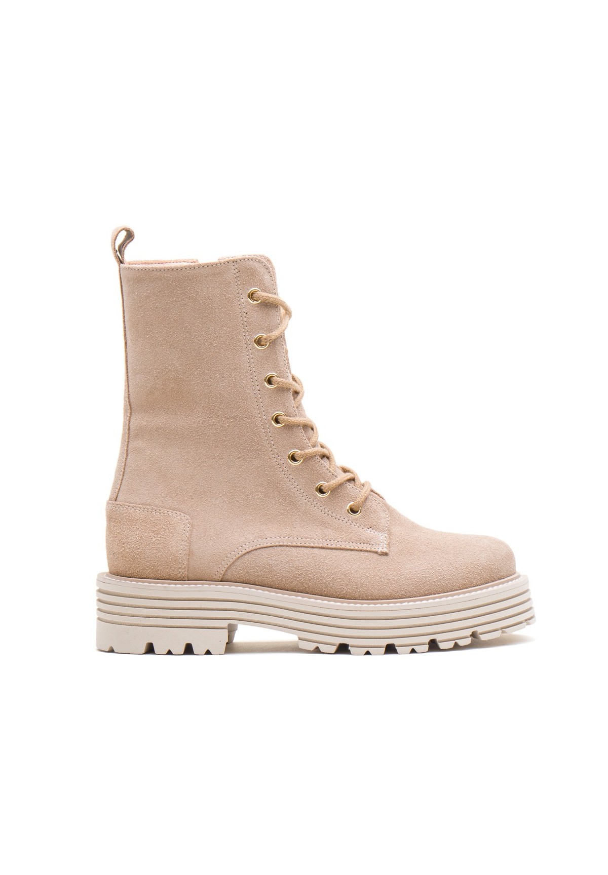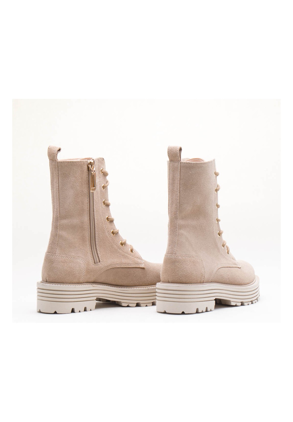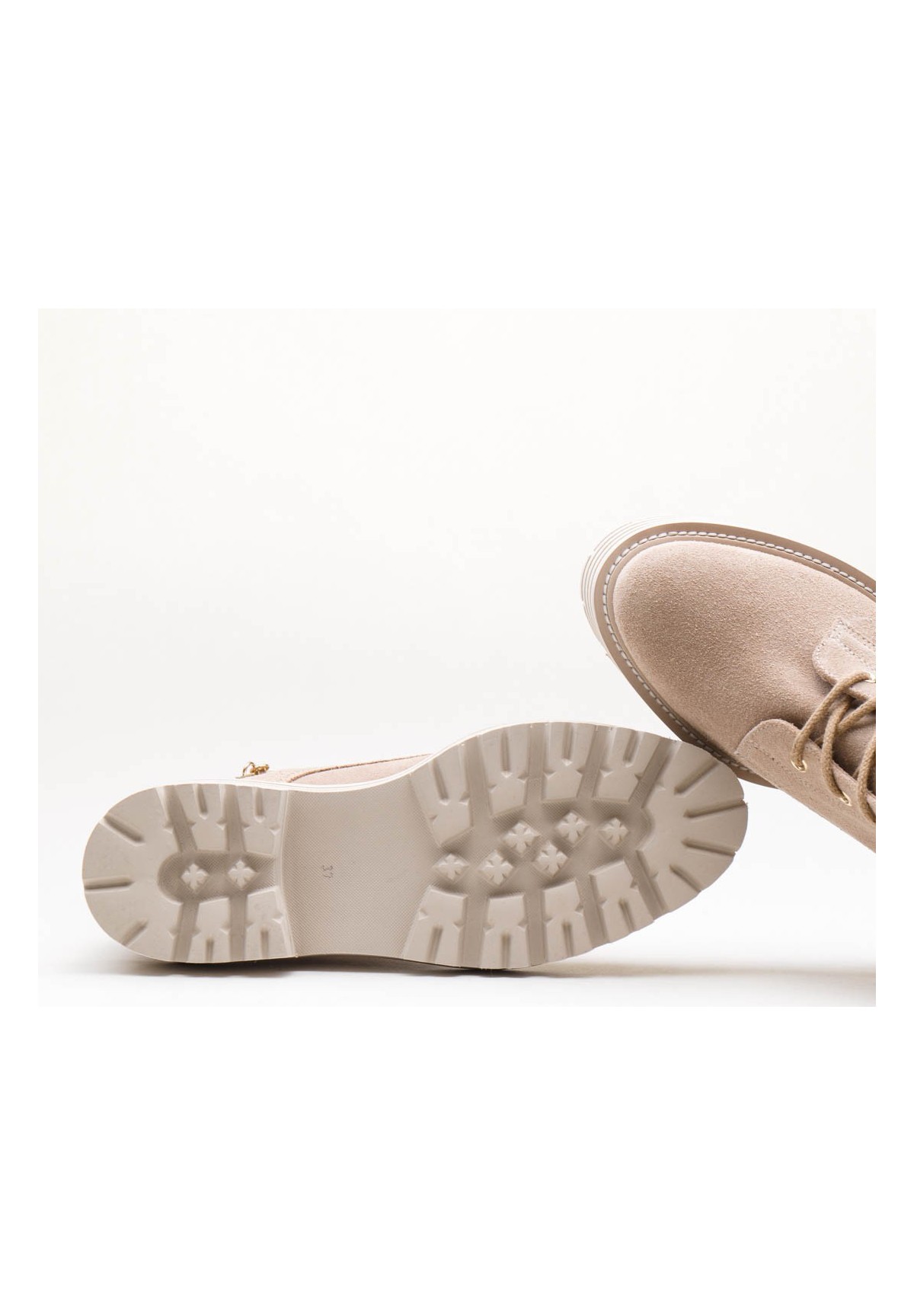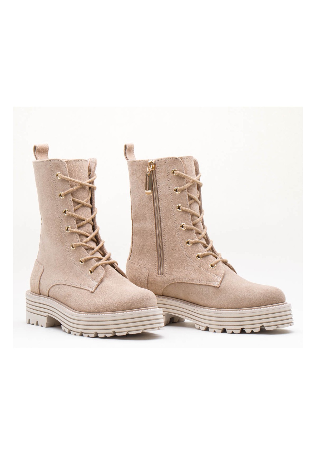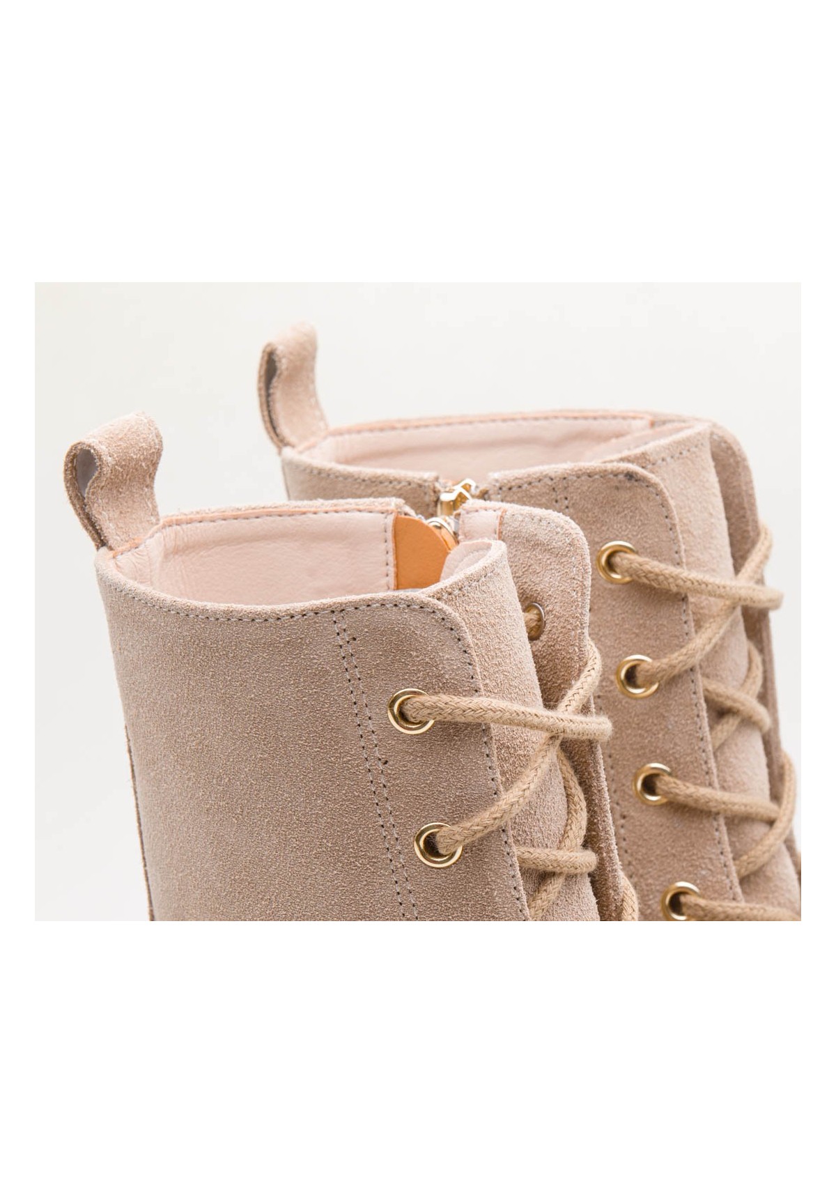 Klasyczne, wysokie botki damskie, wykonane ze skóry welurowej w kolorze beżowym, które doskonale można zestawić np. do czarnych rajstop, spódnicy i grubego swetra. Buty zostały osadzone na grubej podeszwie, która zapewnia doskonałą amortyzację. Zapinane po wewnętrznej stronie na zamek, który ułatwia szybkie zakładanie i zdejmowanie. Dzięki sznurowaniu można je idealnie dopasować do tęgości stopy.