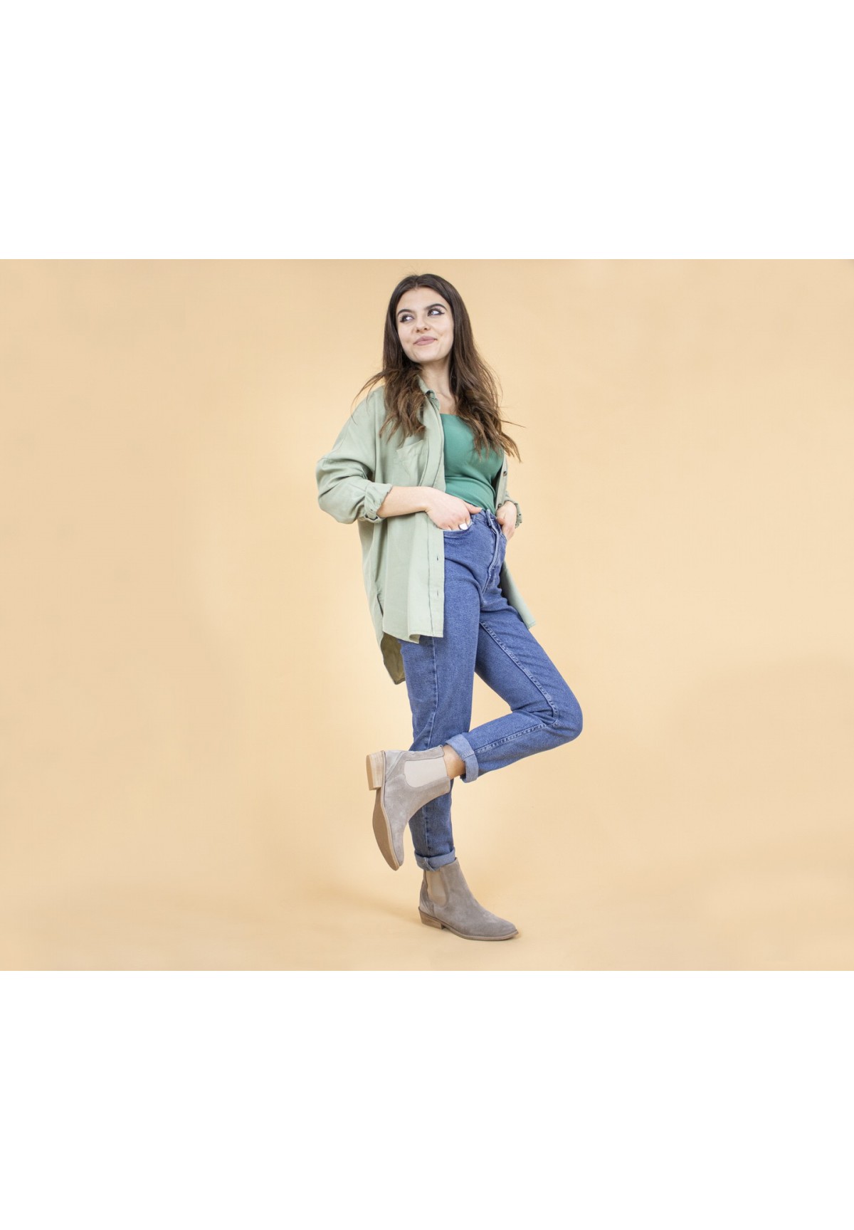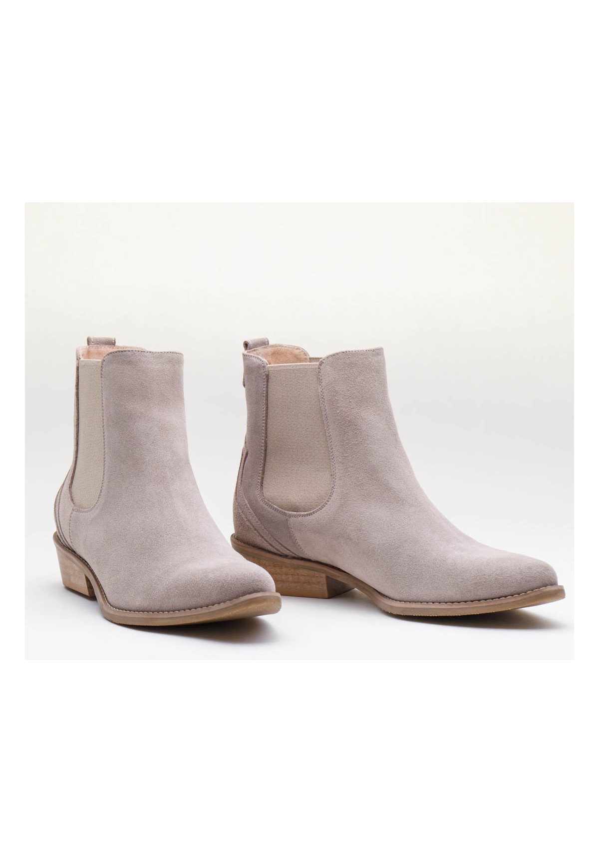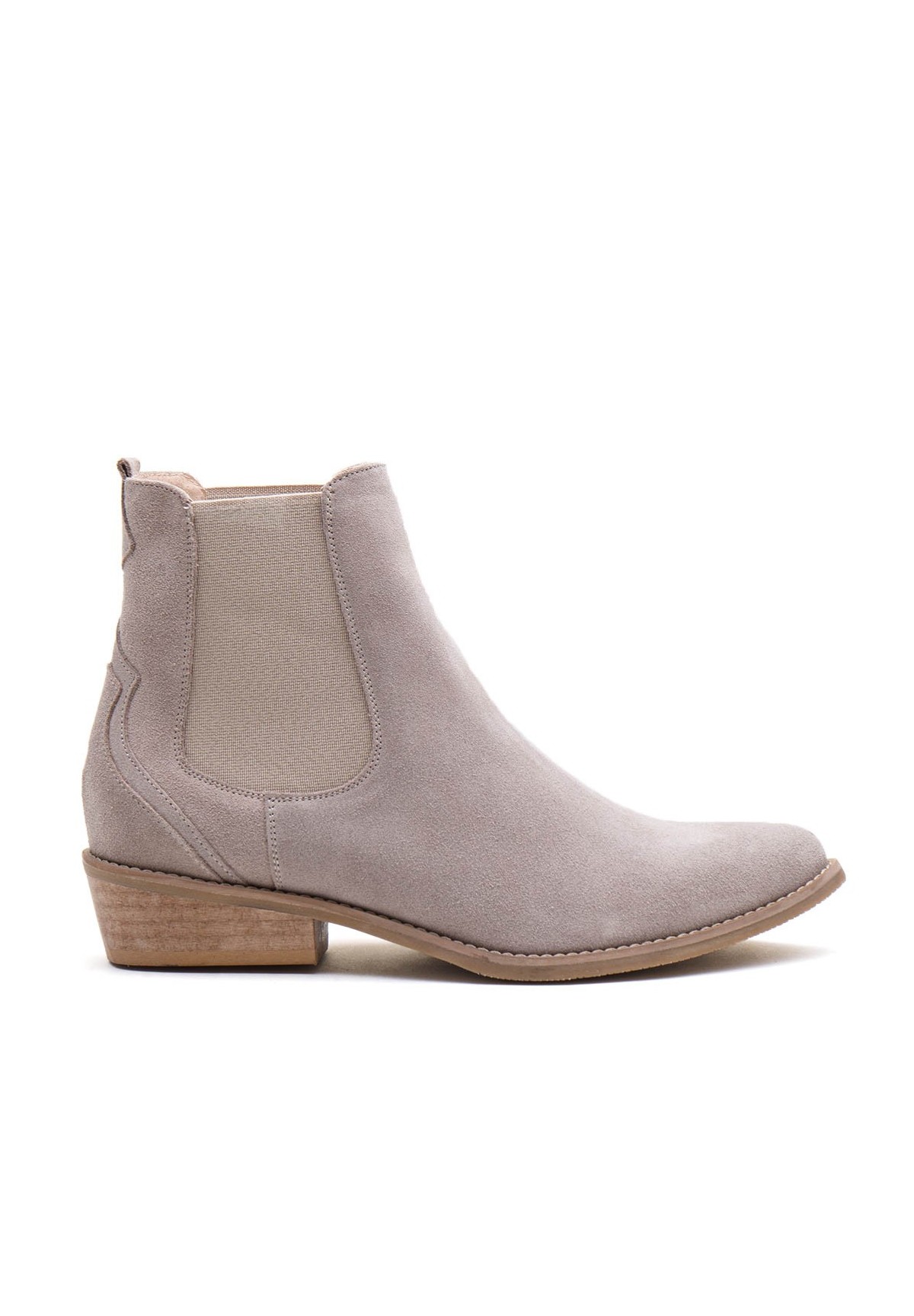 Wsuwane sztyblety damskie, wykonane z naturalnej skóry welurowej w odcieniu jasnego beżu. Z obu stron wszyta jest elastyczna wstawka, dzięki której zakładanie ich jest niezwykle szybkie i wygodne. Model na niskim obcasie. Wewnątrz wygodna, skórzana wkładka.