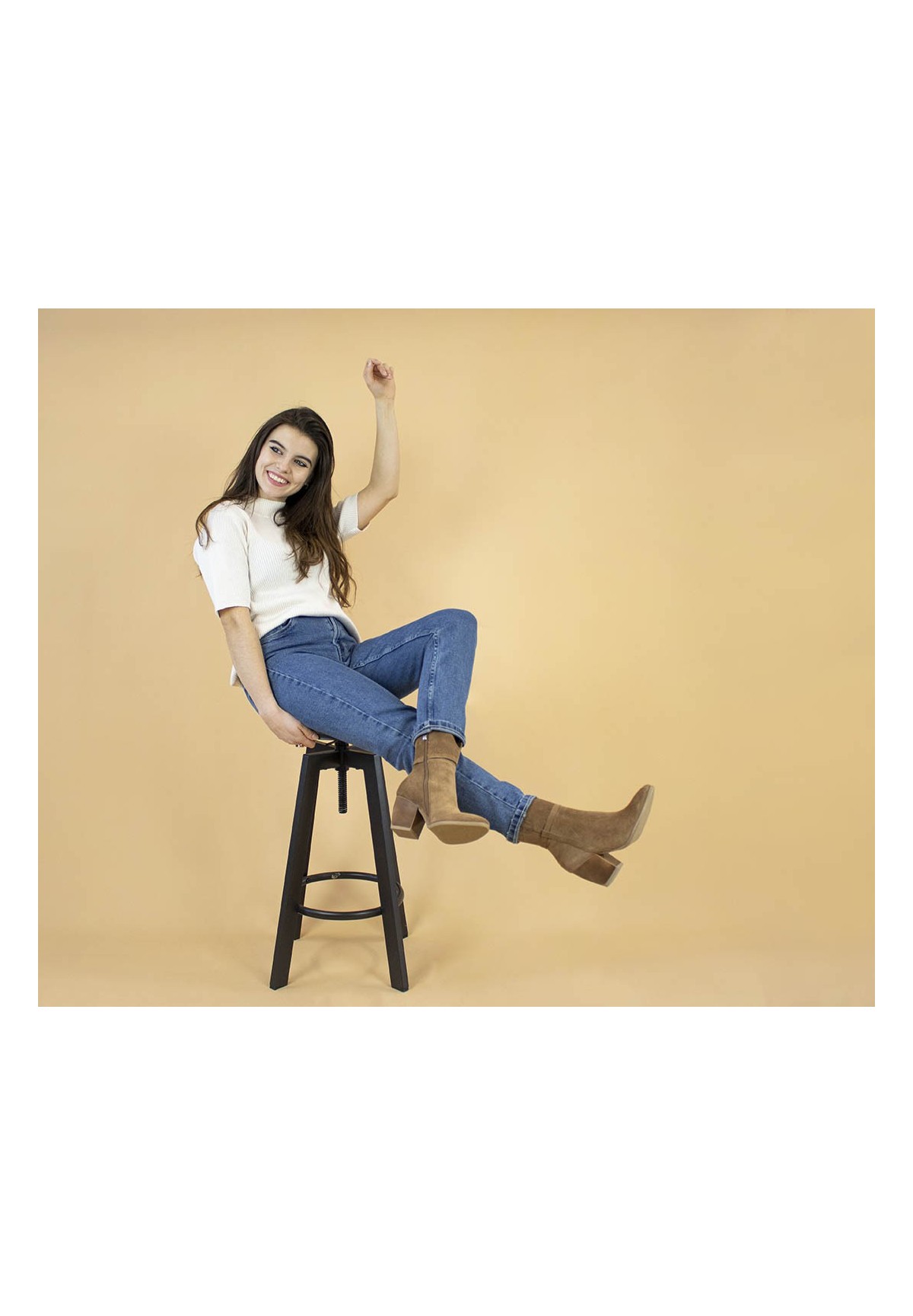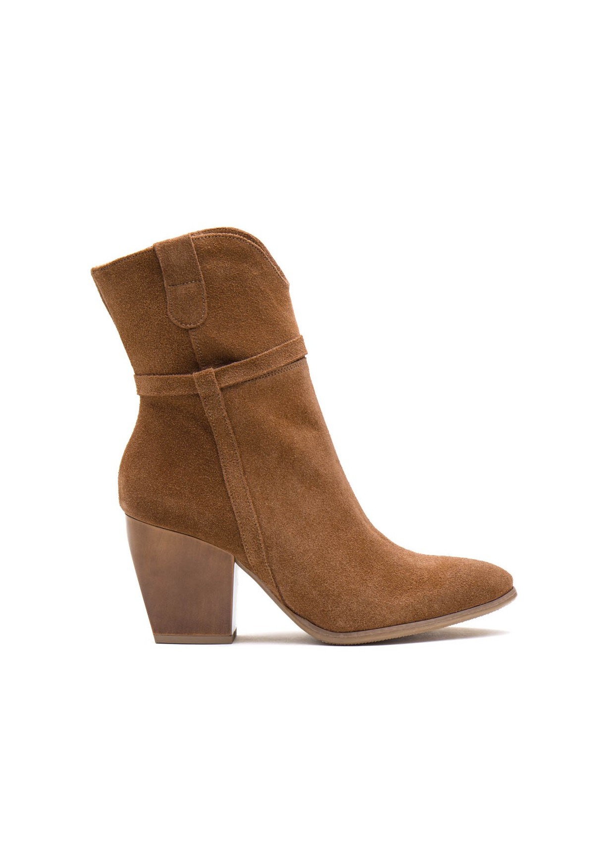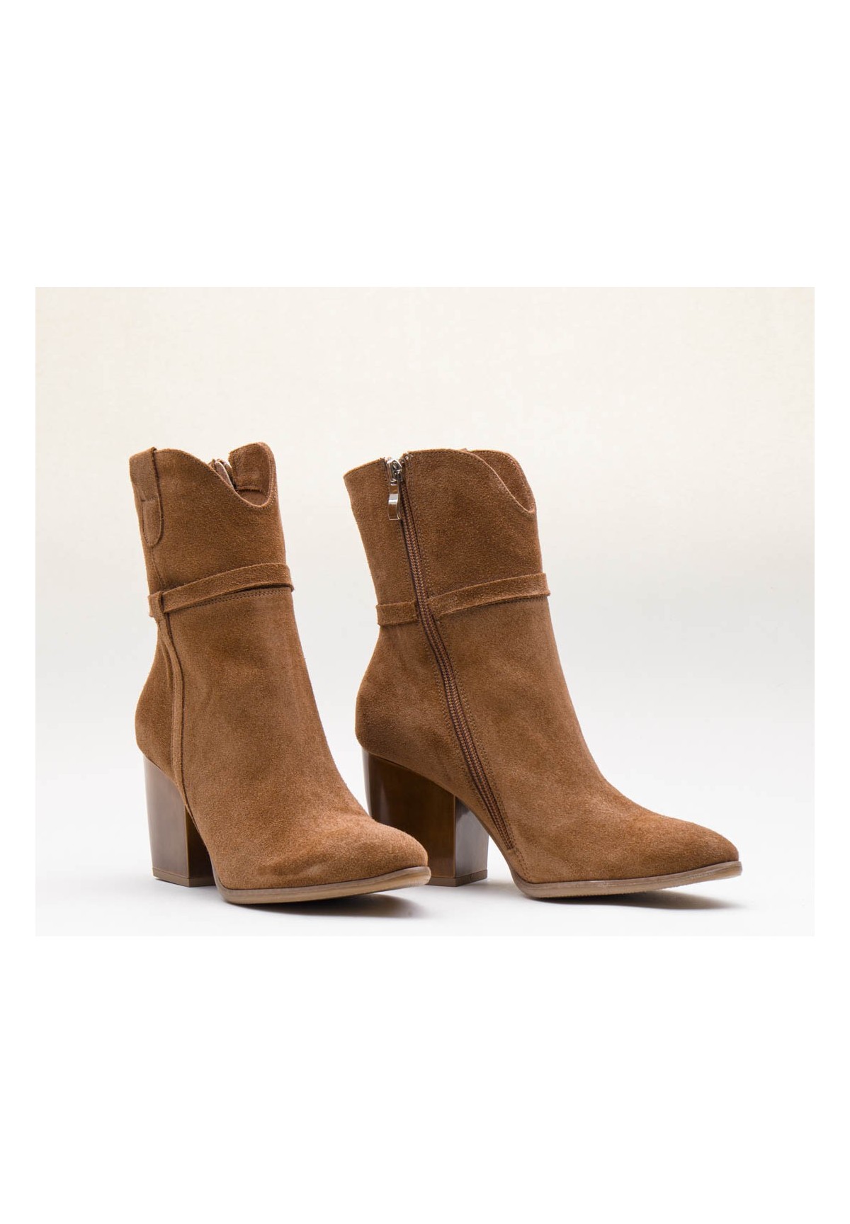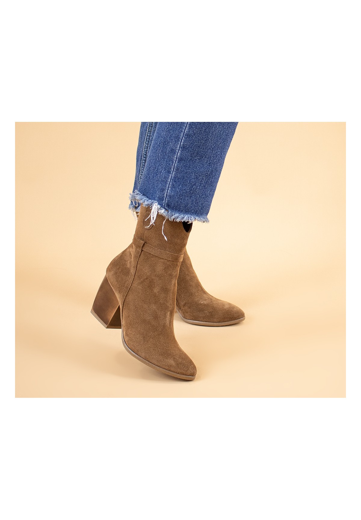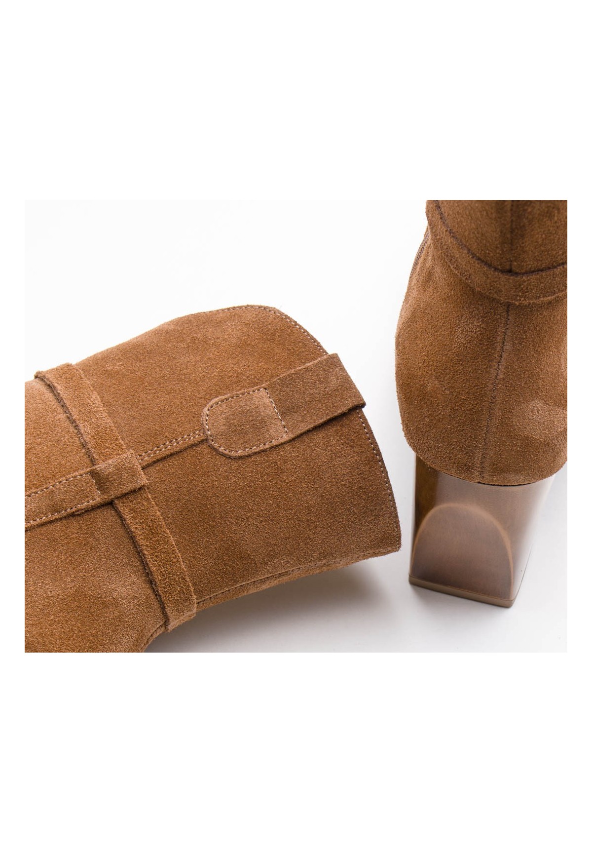 Wysokie botki damskie na szerokim obcasie typu słupek. Wykonane z naturalnej skóry welurowej. Niezwykle wygodne dzięki skórzanej wyściółce. Po wewnętrznej stronie buta zamek, ułatwiający szybkie ubieranie. Cholewka dodatkowo zdobiona cienkimi paseczkami w kolorze buta.