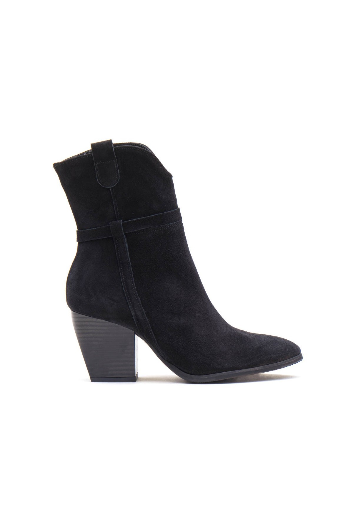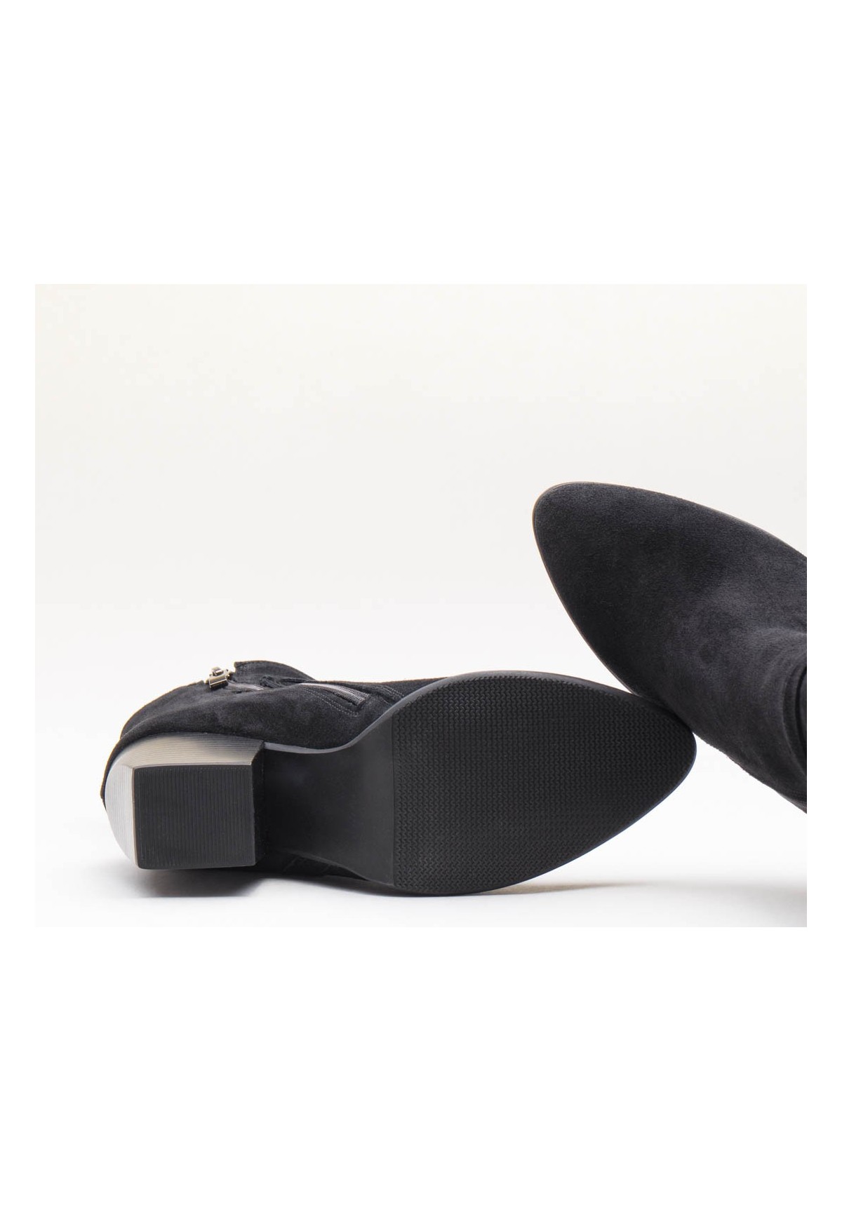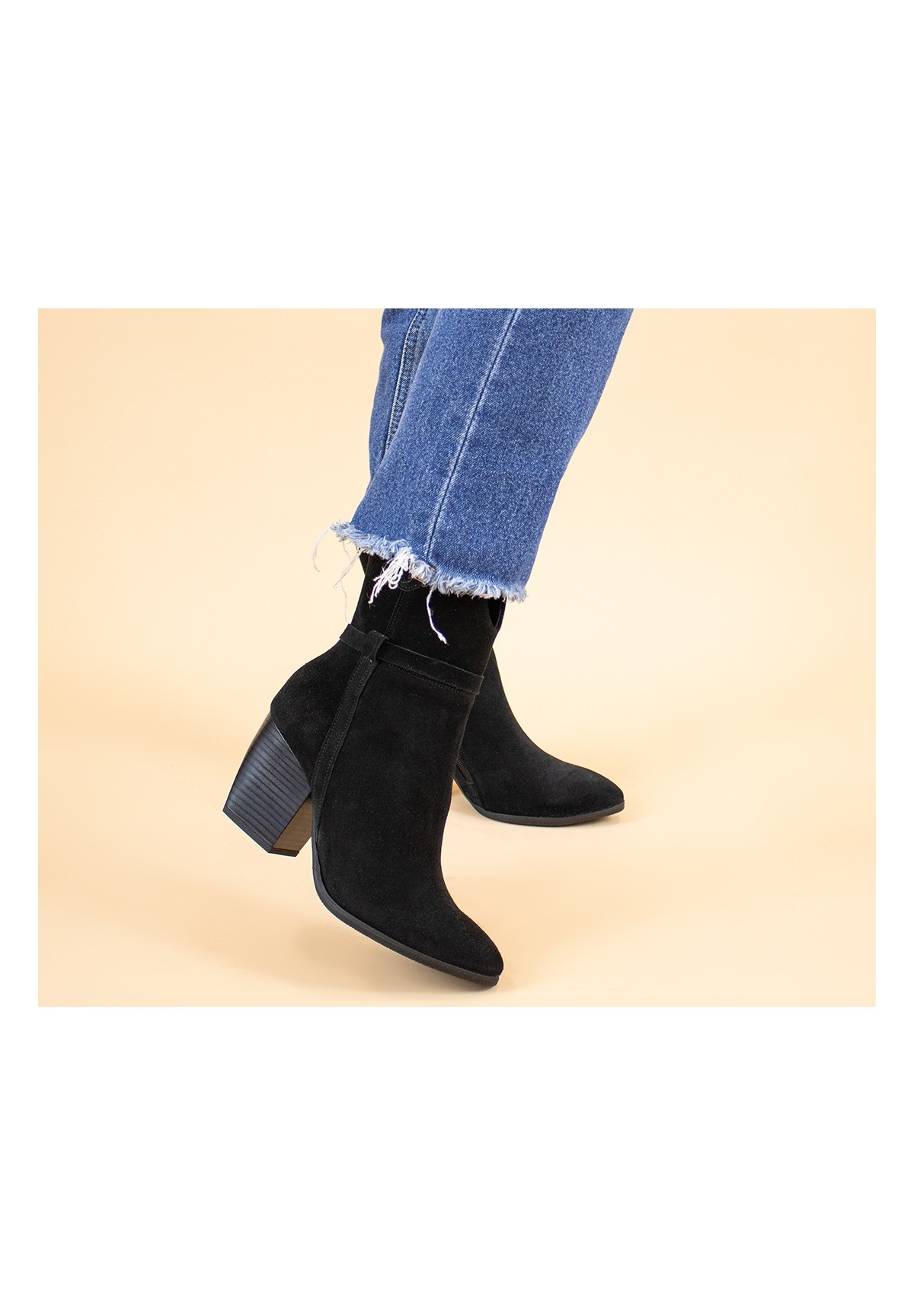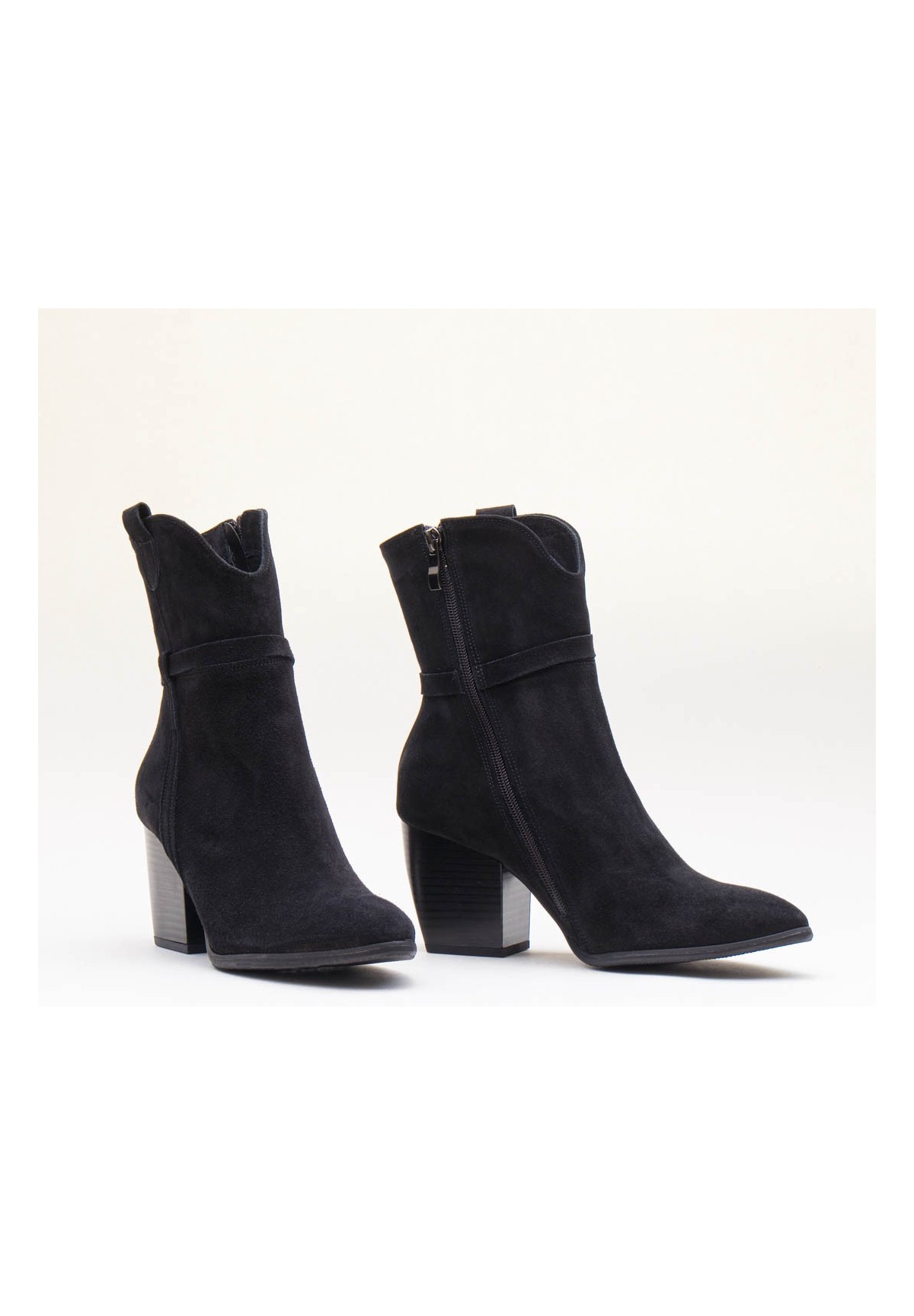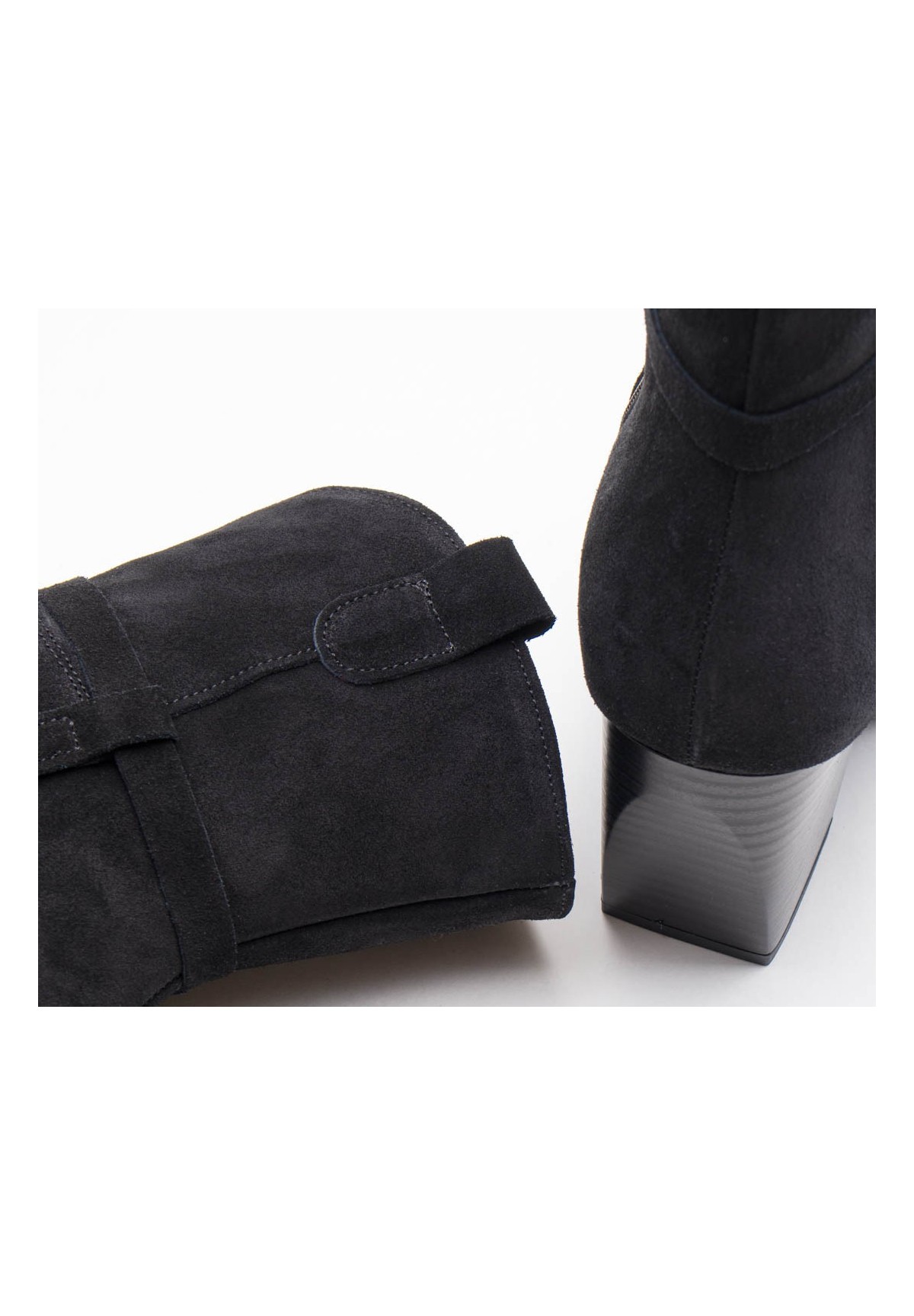 Wysokie botki damskie na szerokim obcasie typu słupek. Wykonane z naturalnej skóry welurowej. Niezwykle wygodne dzięki skórzanej wyściółce. Po wewnętrznej stronie buta zamek, ułatwiający szybkie ubieranie. Cholewka dodatkowo zdobiona cienkimi paseczkami w kolorze buta.