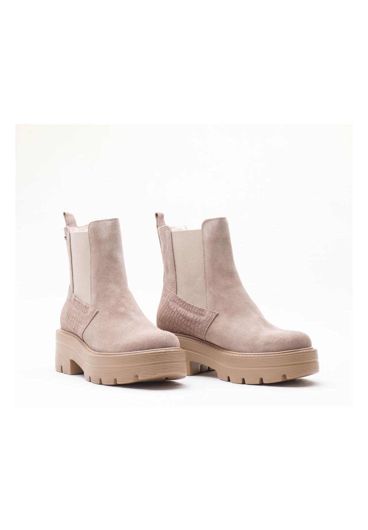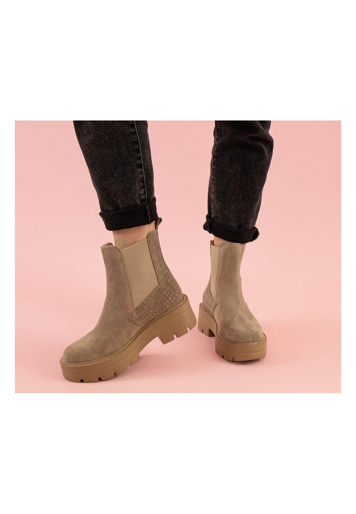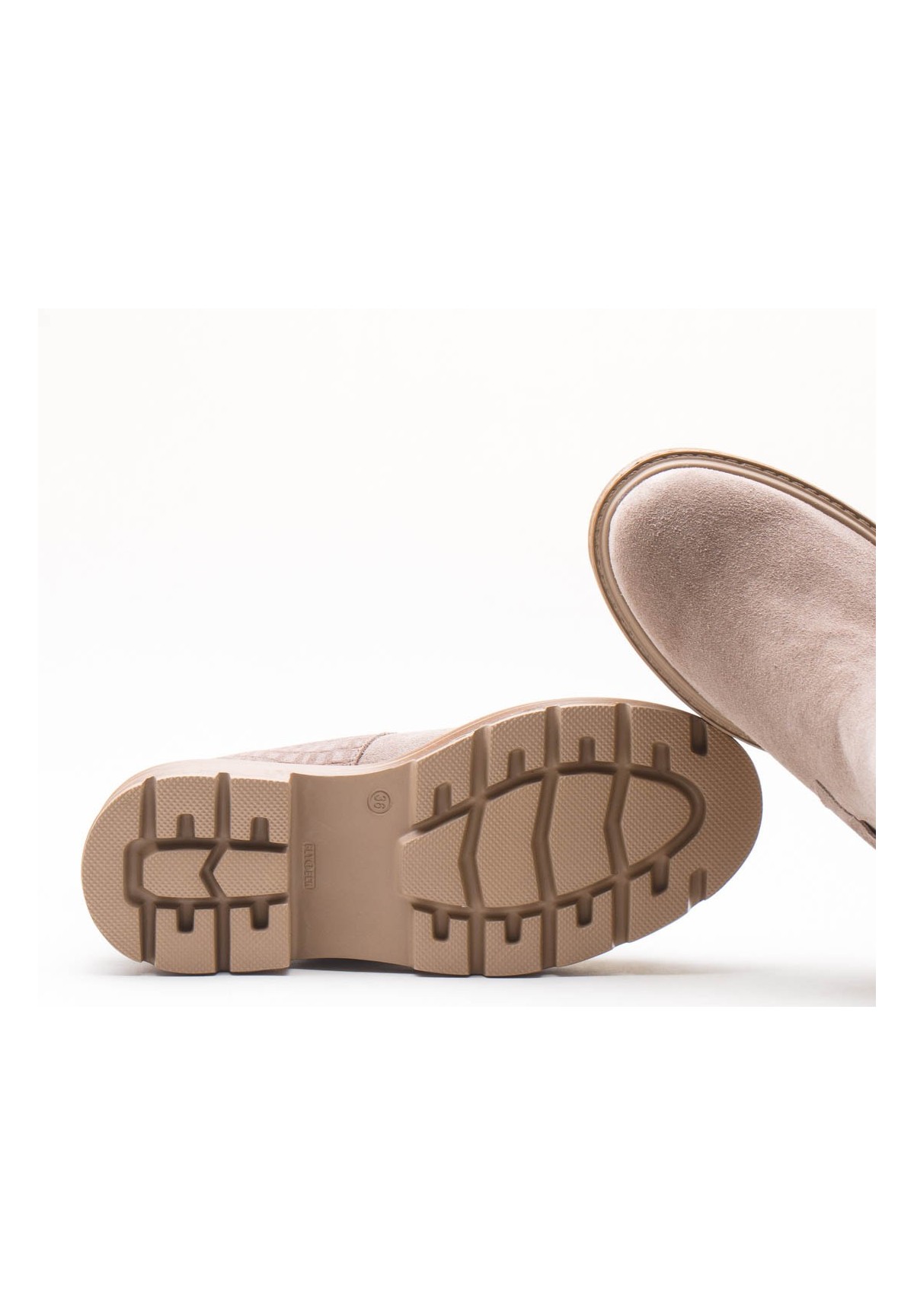 Beżowe botki damskie z okrągłym noskiem, wykonane z naturalnej skóry welurowej. Z obu stron wszyto elastyczna gumę, dzięki czemu ubieranie ich jest niezwykle wygodne i szybkie. Osadzone na grubej podeszwie, zapewniającej stabilność oraz komfort chodzenia. Model nad kostkę. Wewnątrz znajduje się skórzana wkładka, sprawiająca, że stopa nie poci się.