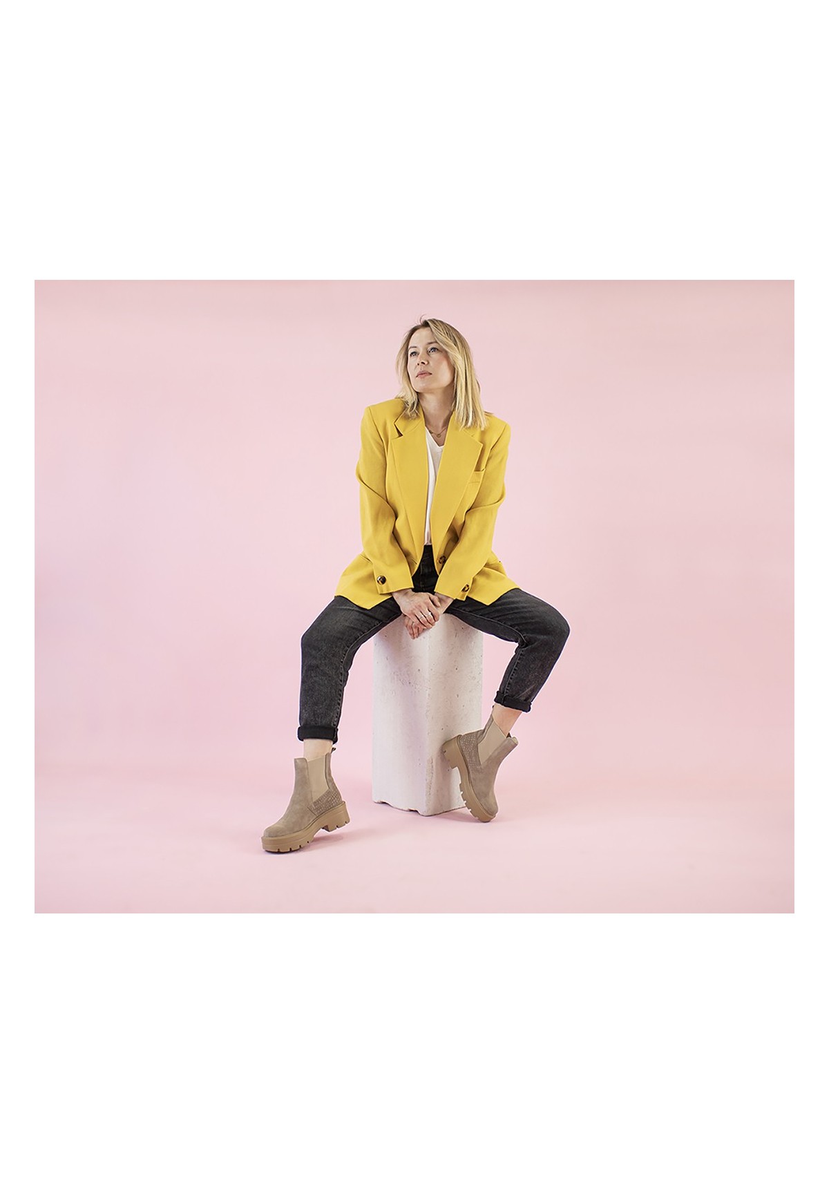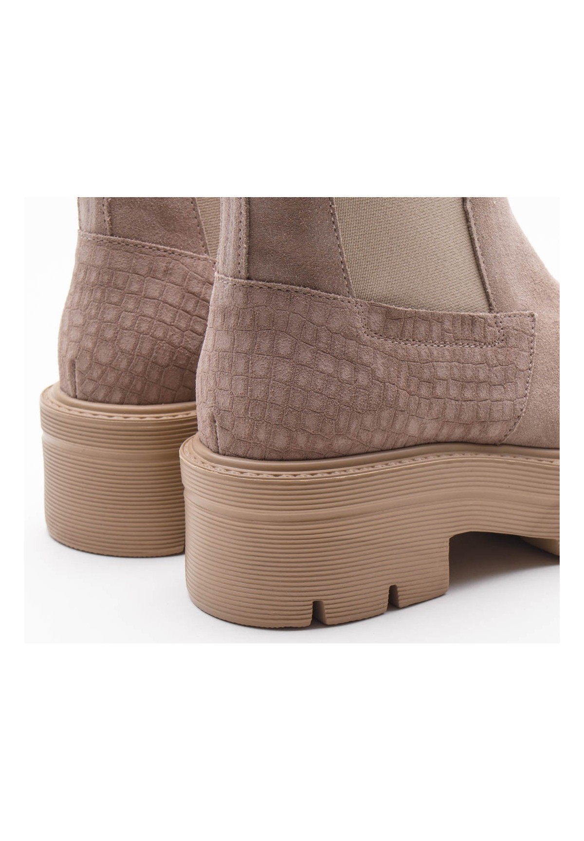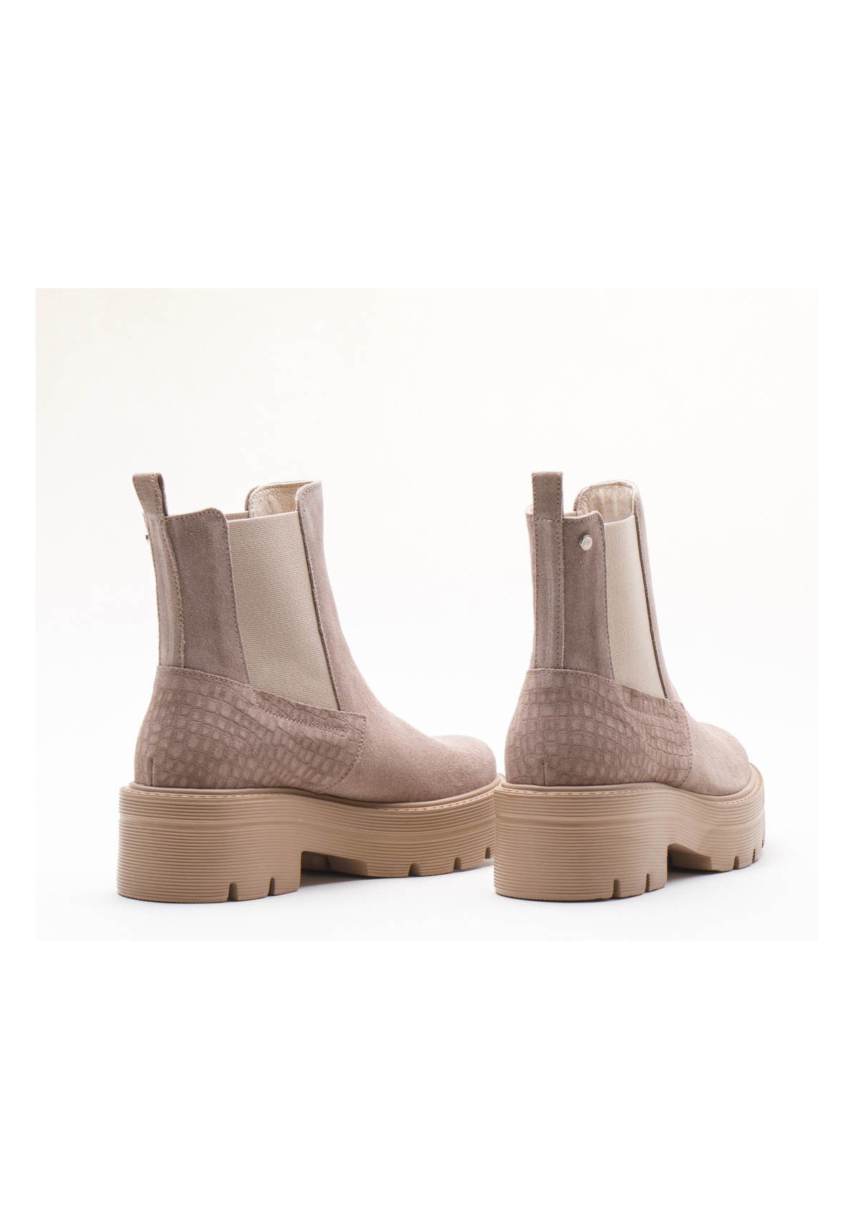 Beżowe botki damskie z okrągłym noskiem, wykonane z naturalnej skóry welurowej. Z obu stron wszyto elastyczna gumę, dzięki czemu ubieranie ich jest niezwykle wygodne i szybkie. Osadzone na grubej podeszwie, zapewniającej stabilność oraz komfort chodzenia. Model nad kostkę. Wewnątrz znajduje się skórzana wkładka, sprawiająca, że stopa nie poci się.