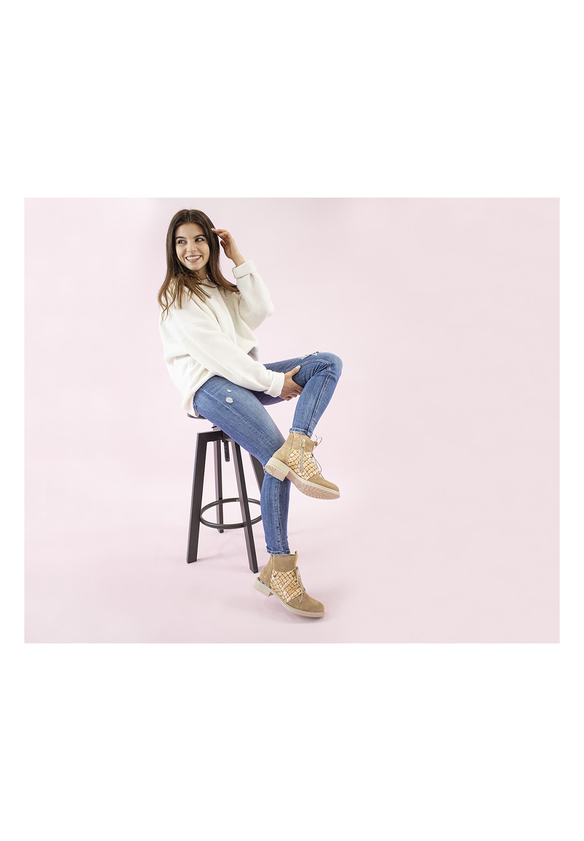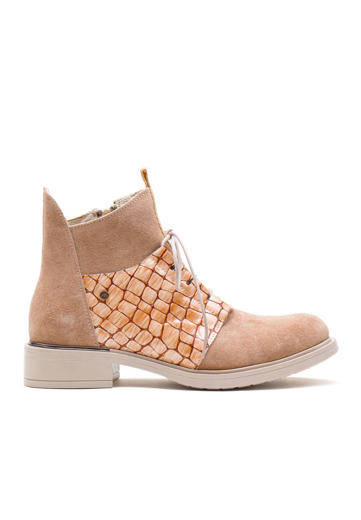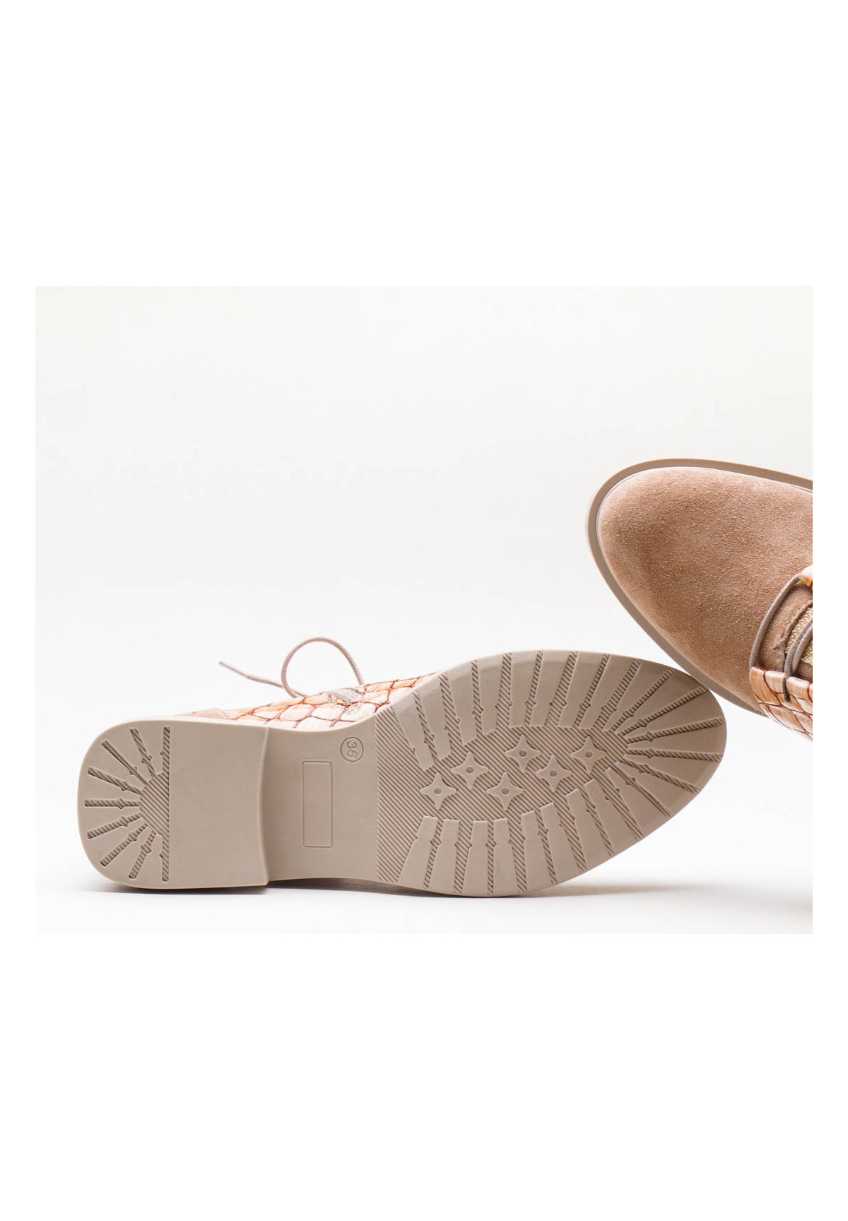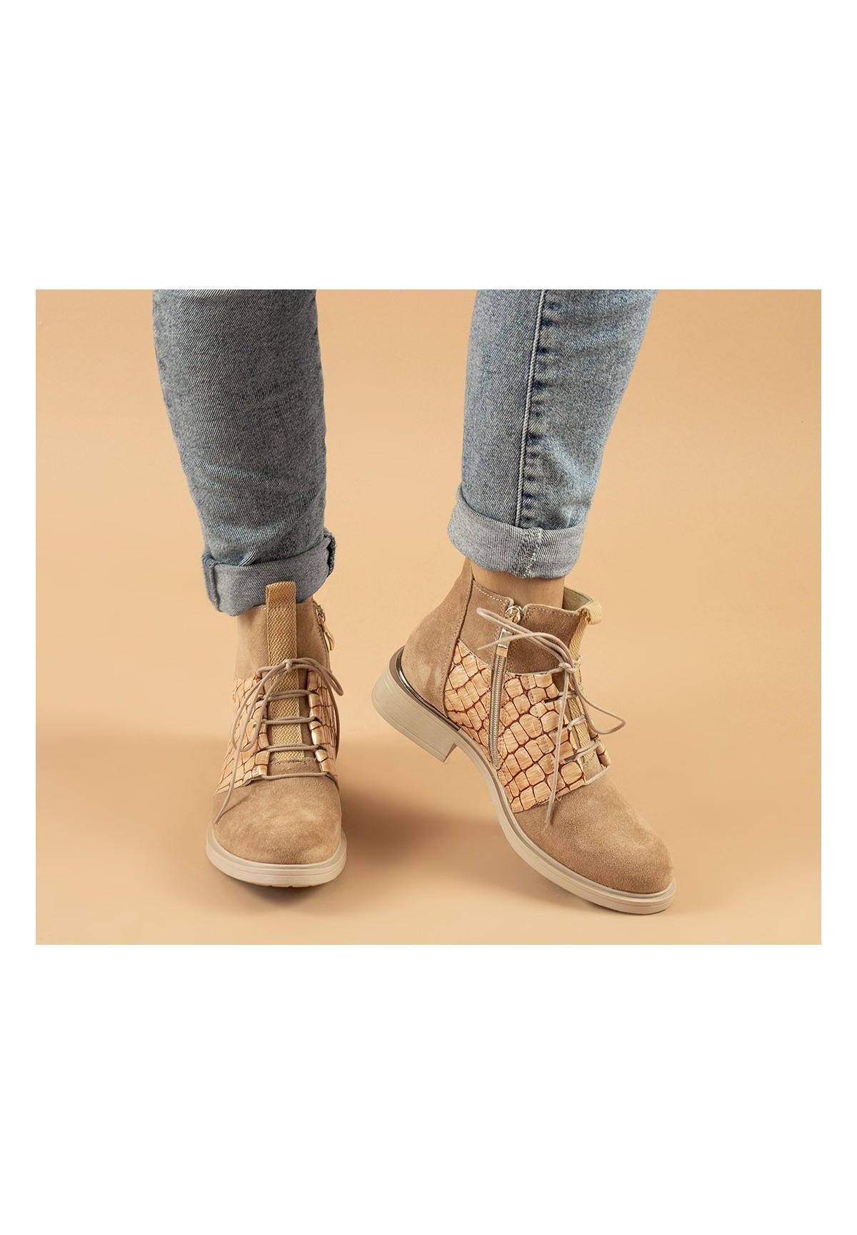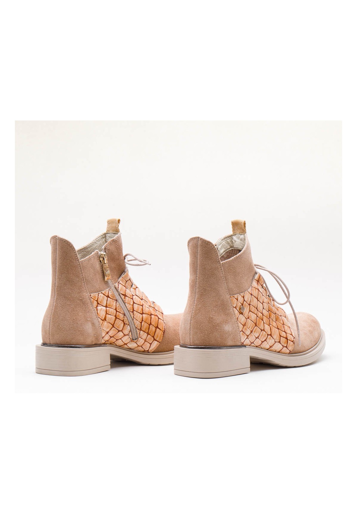 Niebanalne, pięknie prezentujące się botki damskie, wykonane z połączenia dwóch skór naturalnych: welurowej oraz lakierowanej. Zapinane na zamek. Dodatkowe wiązanie sprawia, że można je doskonale dopasować do tęgości stopy. Buty osadzone na podeszwie z niskim obcasem, co sprawia, że są niezwykle wygodne.