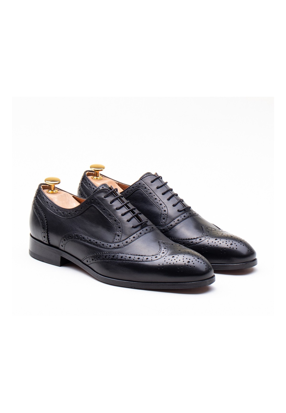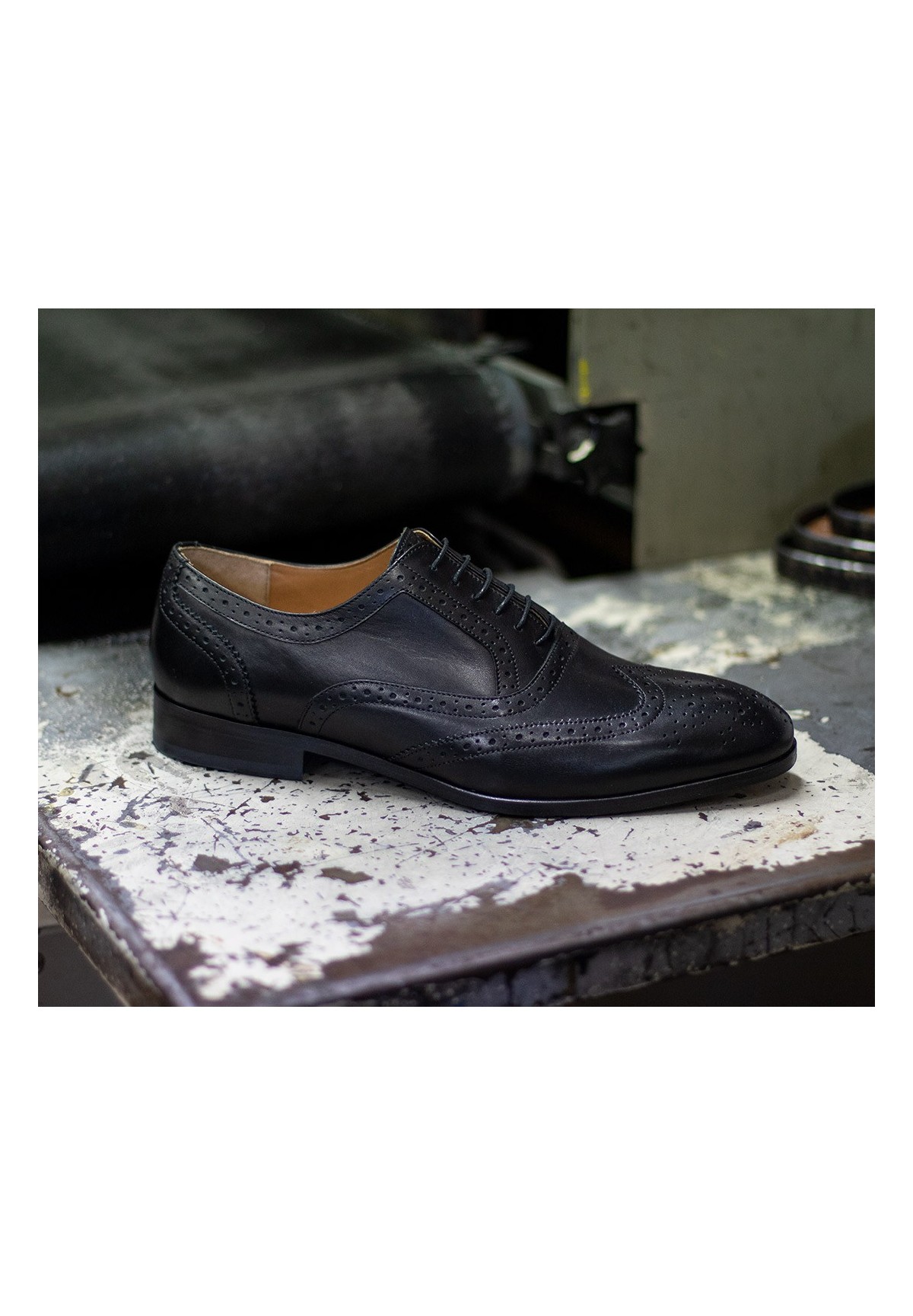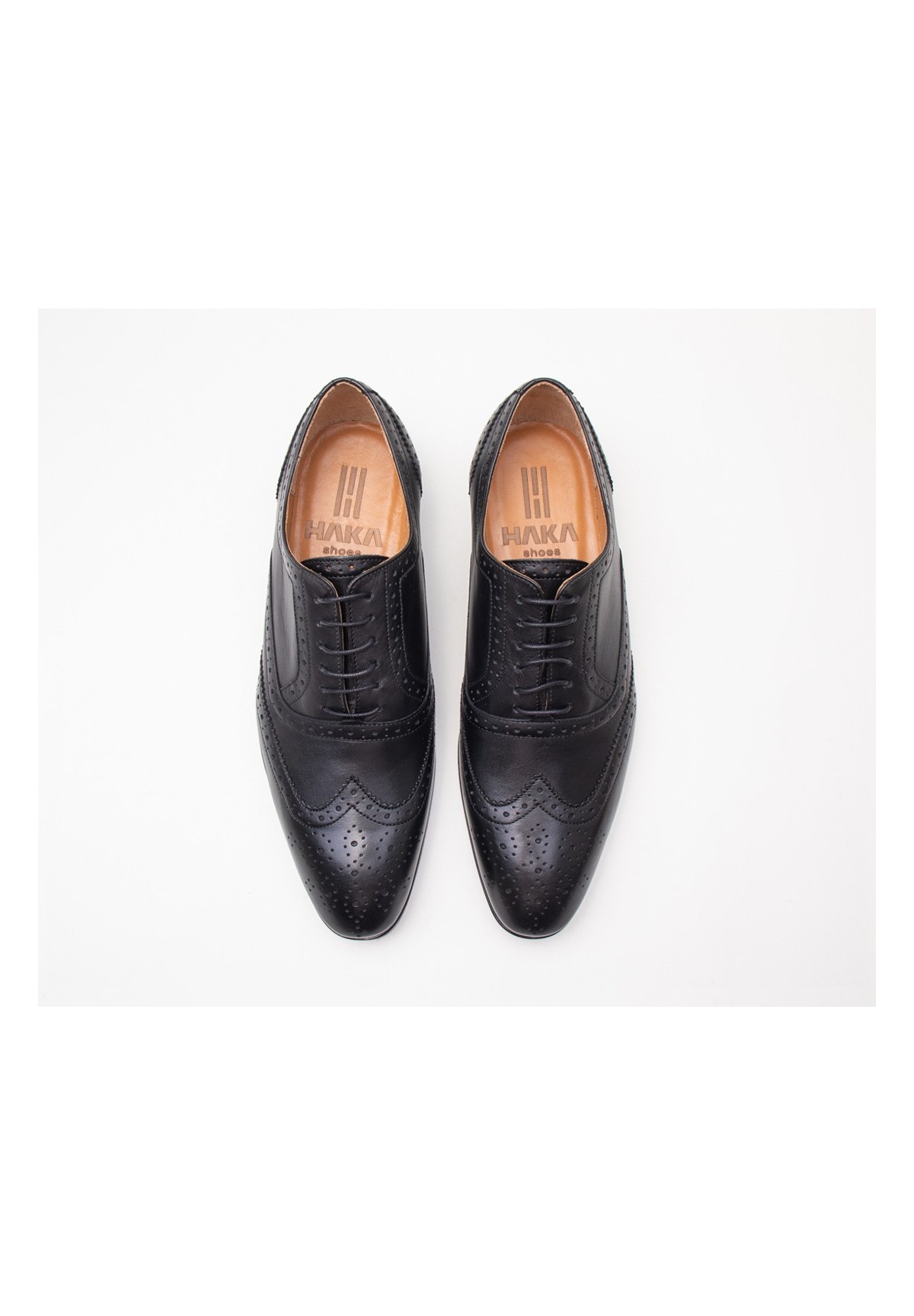 Czarne półbuty marki HAKA Shoes wykonane z naturalnej skóry cielęcej, będą idealnie sprawdzały się na wielkie uroczystości typu ślub, jak i mniejsze wyjścia np. do pracy. Wykończone podszewką z bydlęcej skóry zapewnią stopie cyrkulację powietrza. Charakteryzują się ponadczasowym wyglądem, smukłą sylwetką i oryginalną przyszwą układającą się w skrzydła. Zaletą butów jest ich doskonała jakość oraz wygoda. Sznurowania zapewniają doskonałe dopasowanie ich do tęgości stopy. Buty uszyto metodą Blake, przez doświadczonych szewców, z dbałością o detale.