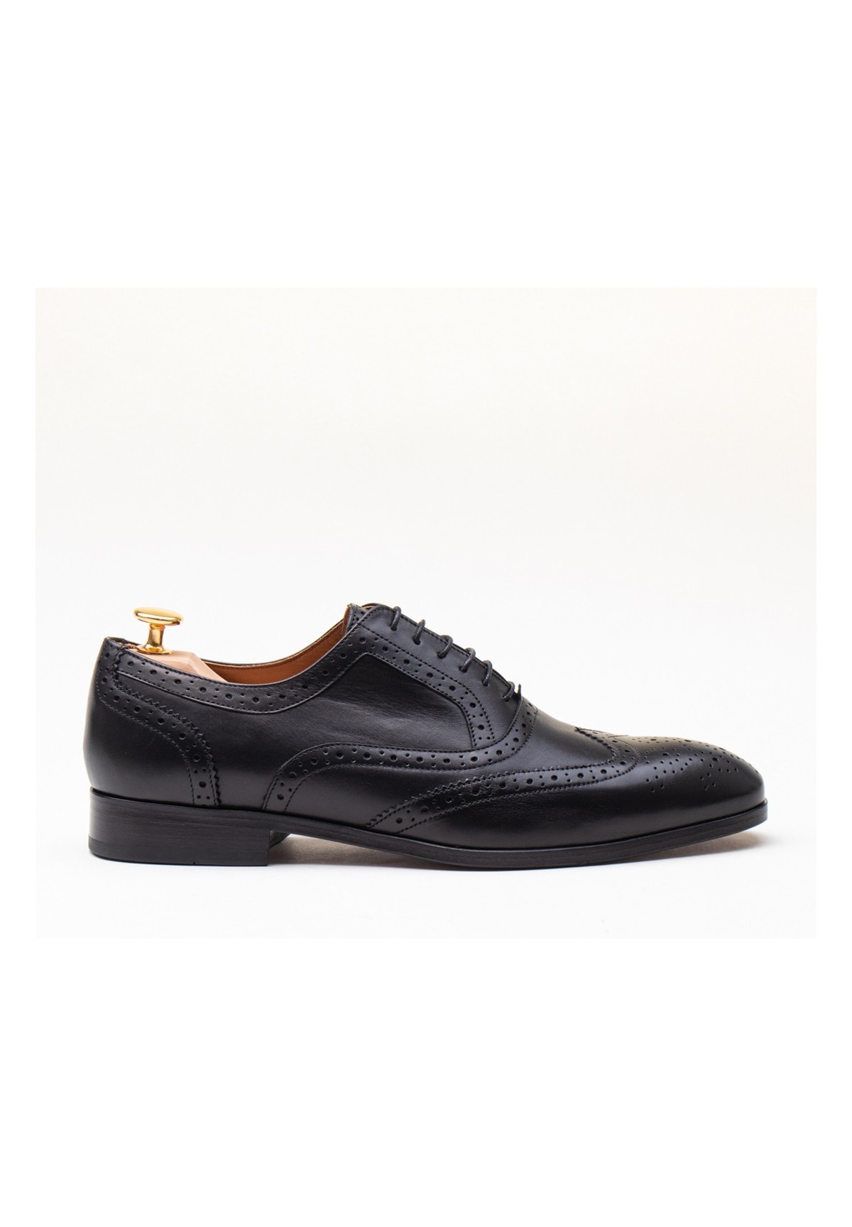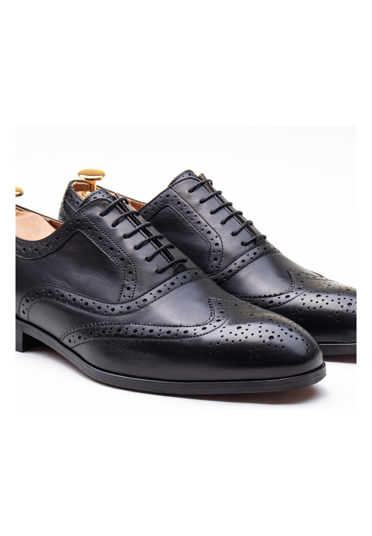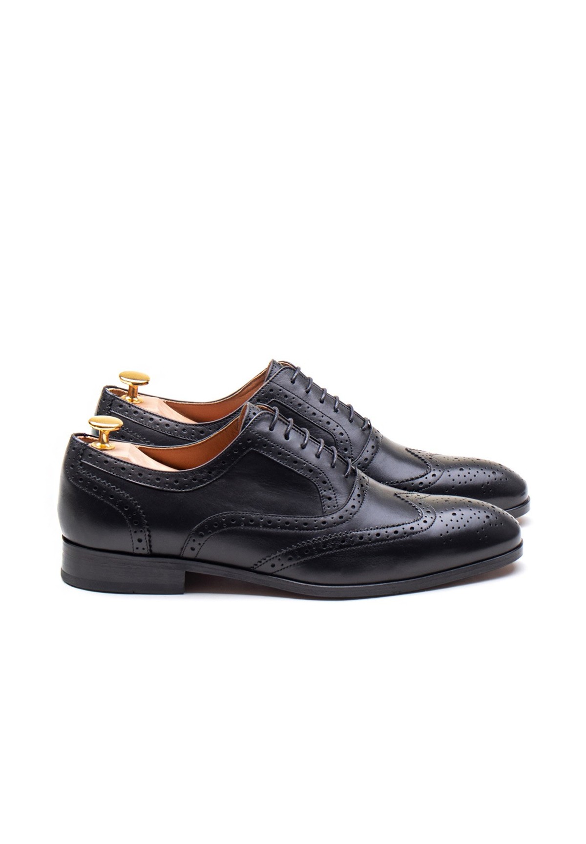 Czarne półbuty marki HAKA Shoes wykonane z naturalnej skóry cielęcej, będą idealnie sprawdzały się na wielkie uroczystości typu ślub, jak i mniejsze wyjścia np. do pracy. Wykończone podszewką z bydlęcej skóry zapewnią stopie cyrkulację powietrza. Charakteryzują się ponadczasowym wyglądem, smukłą sylwetką i oryginalną przyszwą układającą się w skrzydła. Zaletą butów jest ich doskonała jakość oraz wygoda. Sznurowania zapewniają doskonałe dopasowanie ich do tęgości stopy. Buty uszyto metodą Blake, przez doświadczonych szewców, z dbałością o detale.