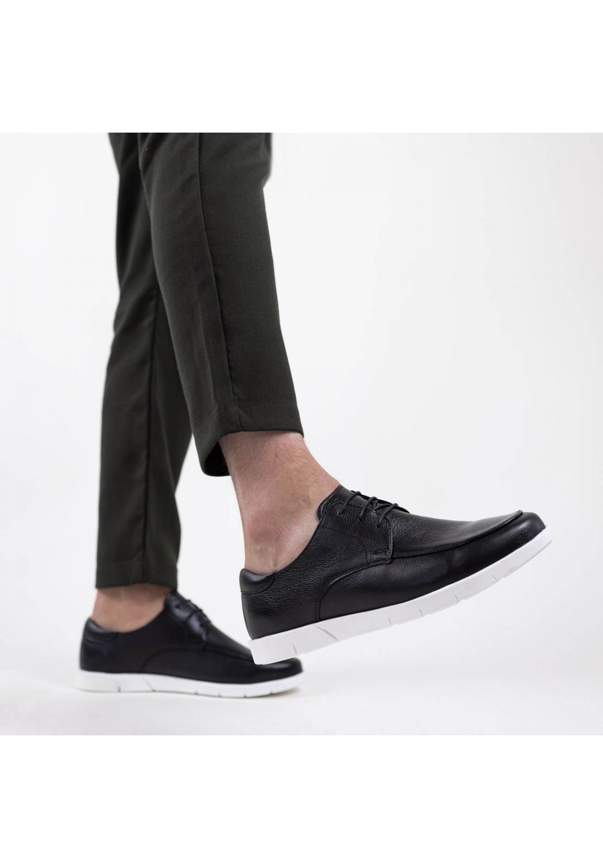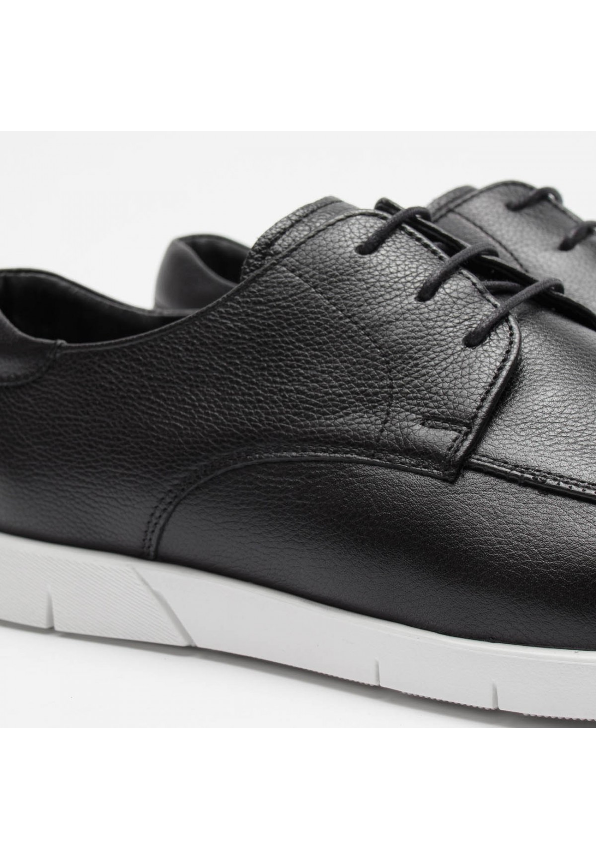 Męskie półsportowe buty, które łączą w sobie stylowy wygląd z wygodą i trwałością. Wykonane z najwyższej jakości skóry naturalnej o wyjątkowej, groszkowanej fakturze. Buty charakteryzują się sportową, białą podeszwą, która nie tylko nadaje im dynamiczny wygląd, ale także zapewnia świetną amortyzację i stabilność podczas każdego kroku. Wiązane za pomocą cienkich sznurówek, pozwalają na precyzyjne dopasowanie do stopy, co gwarantuje maksymalny komfort noszenia. Wnętrze butów wyściełane jest wysokiej jakości skórą naturalną, która zapewnia miękkość i odpowiednią wentylację, utrzymując stopy suchymi i komfortowymi przez cały dzień. Dodatkowo, wkładka również wykonana jest ze skóry naturalnej, co zwiększa komfort użytkowania.