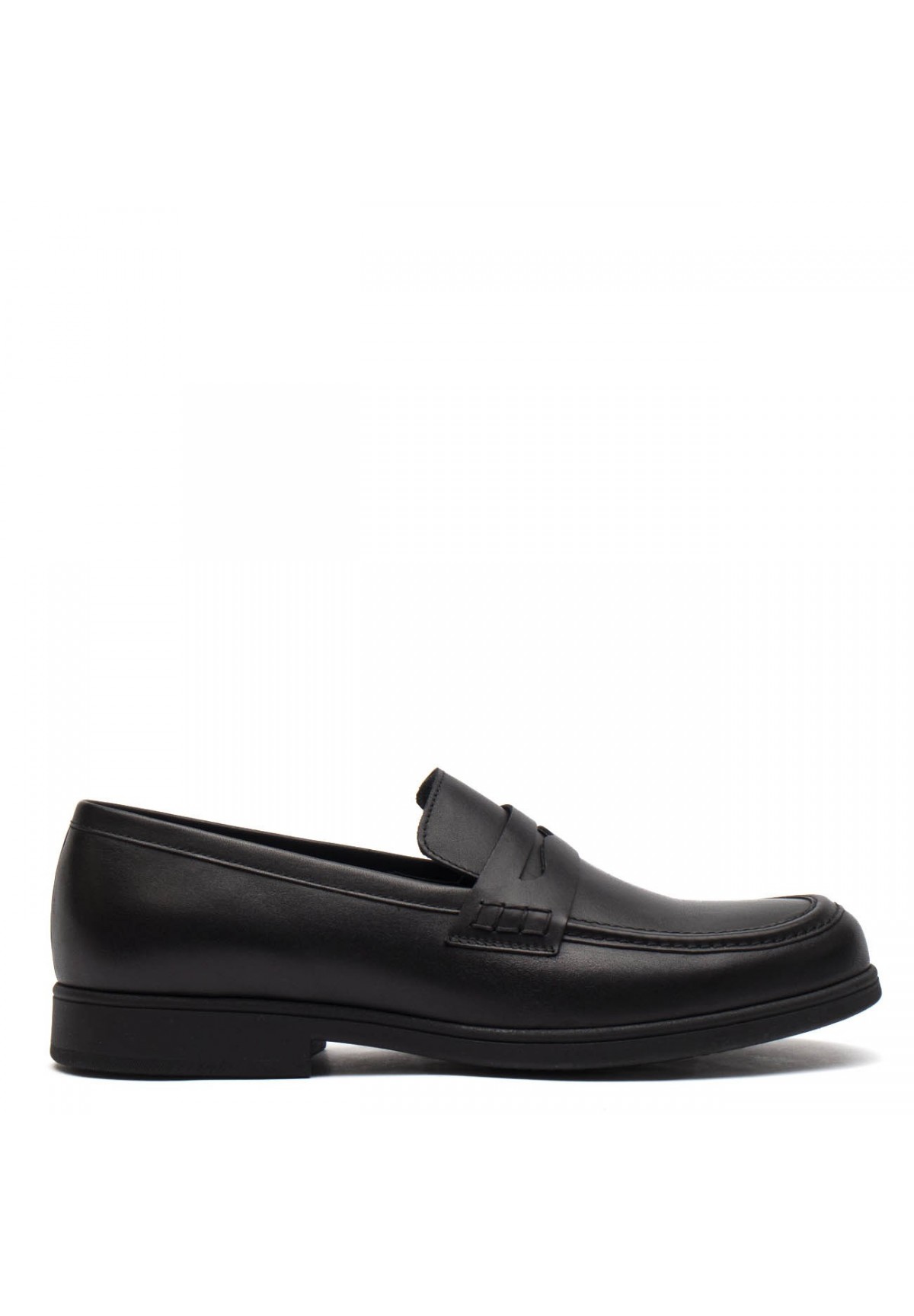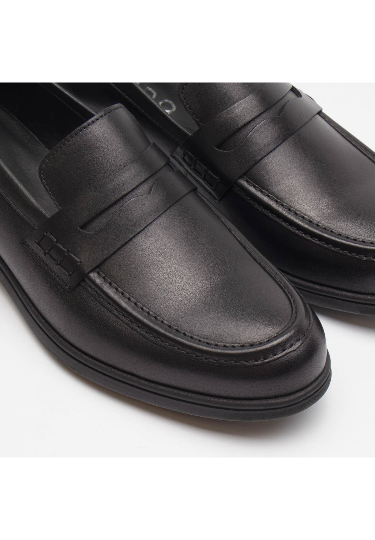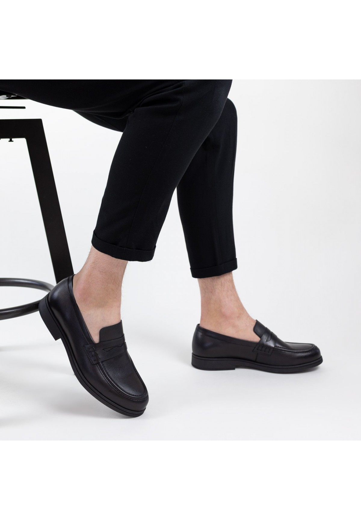 Loafersy męskie wykonane z najwyższej jakości skóry naturalnej o gładkim licu, w głębokiej czerni. Ich klasyczny design sprawia, że są niezastąpionym elementem męskiej garderoby. Wzrok przykuwa subtelny, lecz efektowny ozdobny pasek naszyty na cholewce, który dodaje im niepowtarzalnego charakteru. Loafersy są nie tylko eleganckie, ale także niezwykle wygodne i szybkie w zakładaniu oraz zdejmowaniu. Ich noski w typie migdała dodają im klasy i ponadczasowego uroku. Buty te osadzone są na solidnej podeszwie o grubości około 1,5 cm, z delikatnym obcasem o wysokości 2,5 cm, co zapewnia zarówno stabilność, jak i subtelne podwyższenie. Wnętrze wyścielane miękką skórą naturalną jest dodatkowym atutem, zapewniającym komfort na najwyższym poziomie.