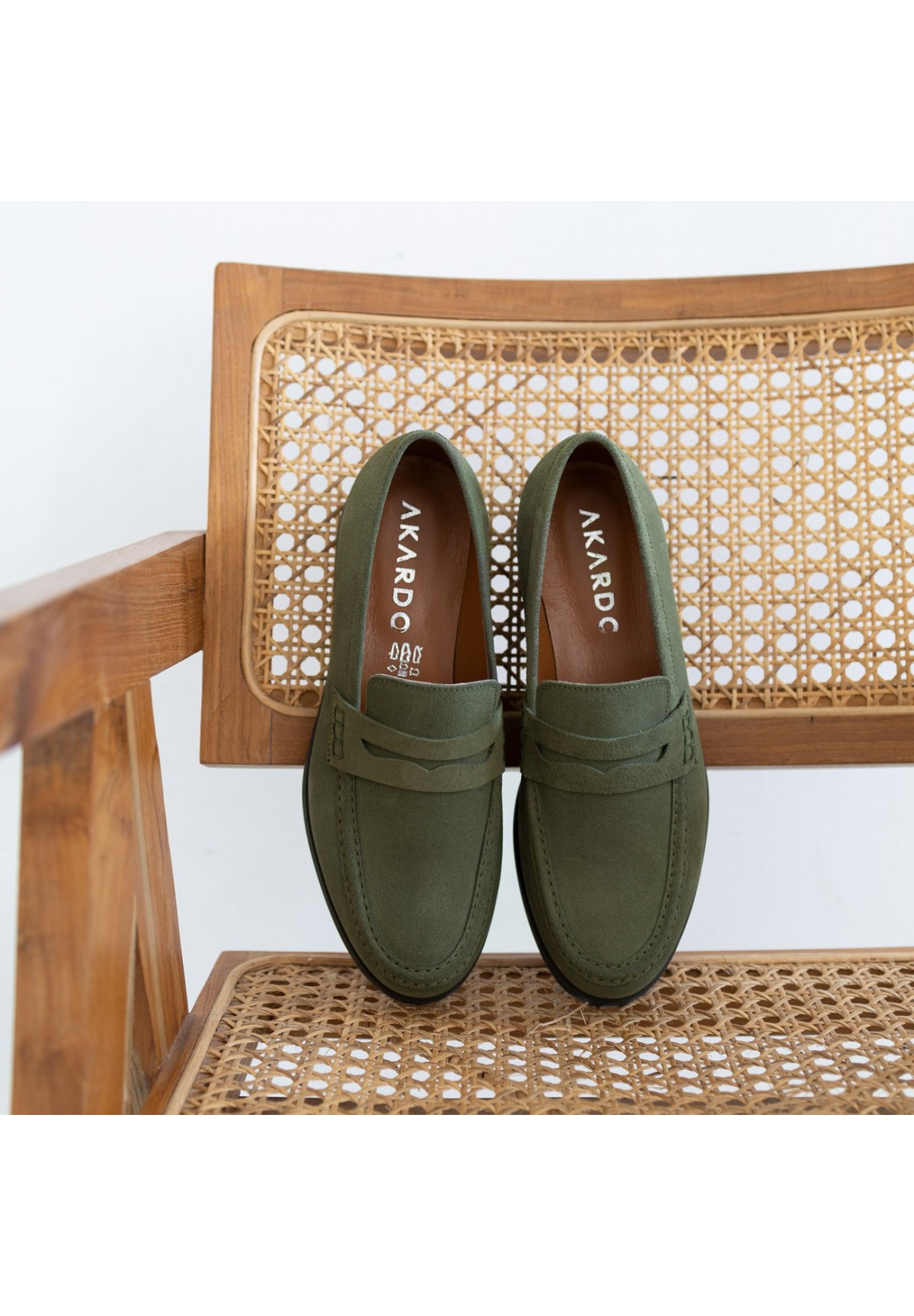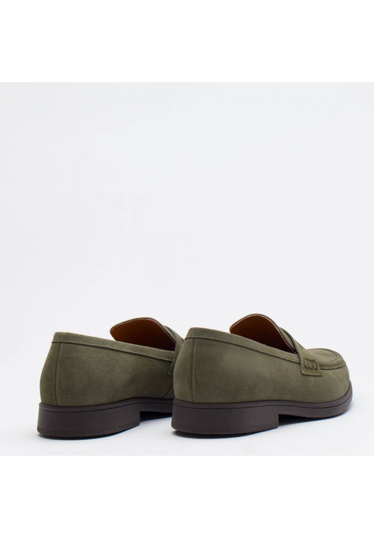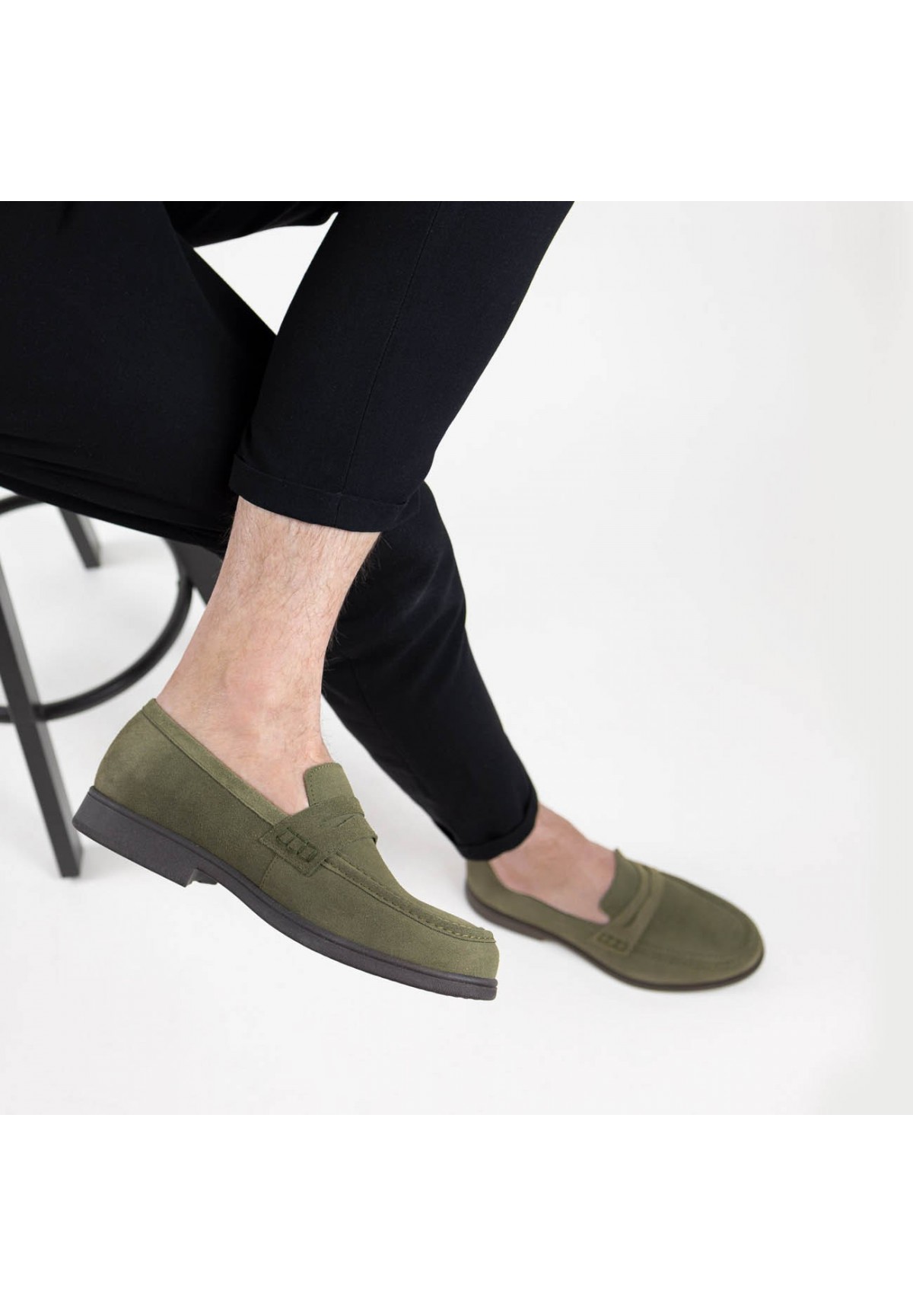 Loafersy męskie wykonane z najwyższej jakości skóry welurowej w pięknym oliwkowym kolorze. Ich klasyczny design sprawia, że są niezastąpionym elementem męskiej garderoby. Wzrok przykuwa subtelny, lecz efektowny ozdobny pasek naszyty na cholewce, który dodaje im niepowtarzalnego charakteru. Loafersy są nie tylko eleganckie, ale także niezwykle wygodne i szybkie w zakładaniu oraz zdejmowaniu. Ich noski w typie migdała dodają im klasy i ponadczasowego uroku. Buty te osadzone są na solidnej podeszwie o grubości około 1,5 cm, z delikatnym obcasem o wysokości 2,5 cm, co zapewnia zarówno stabilność, jak i subtelne podwyższenie. Wnętrze wyścielane miękką skórą naturalną jest dodatkowym atutem, zapewniającym komfort na najwyższym poziomie.