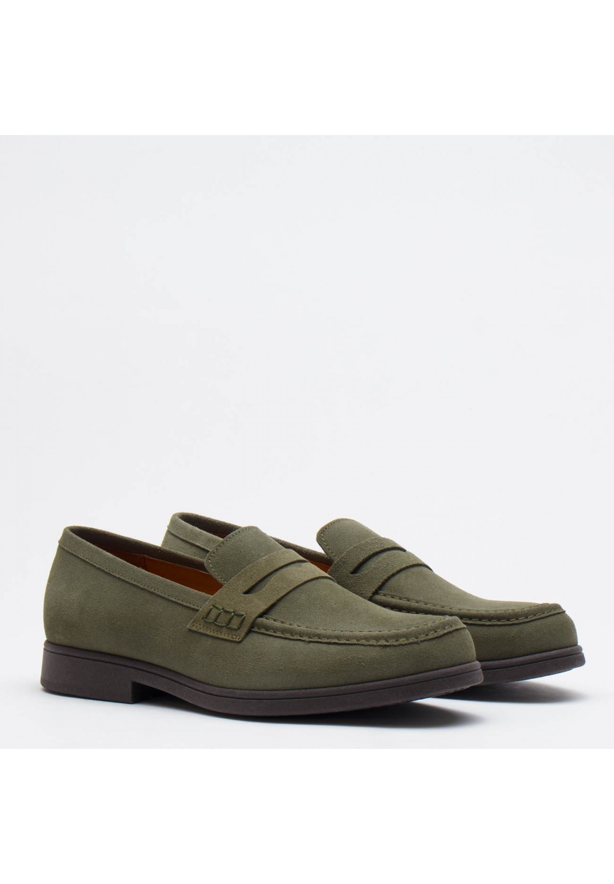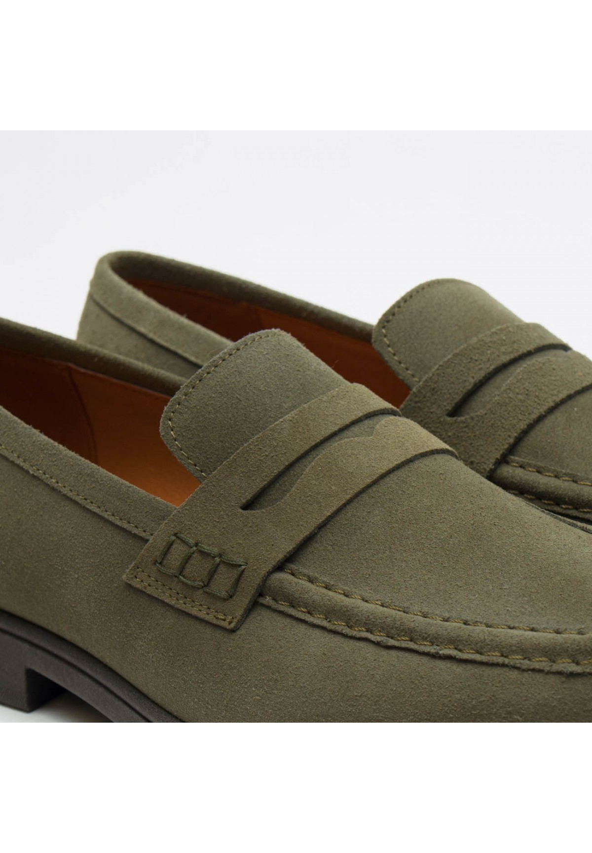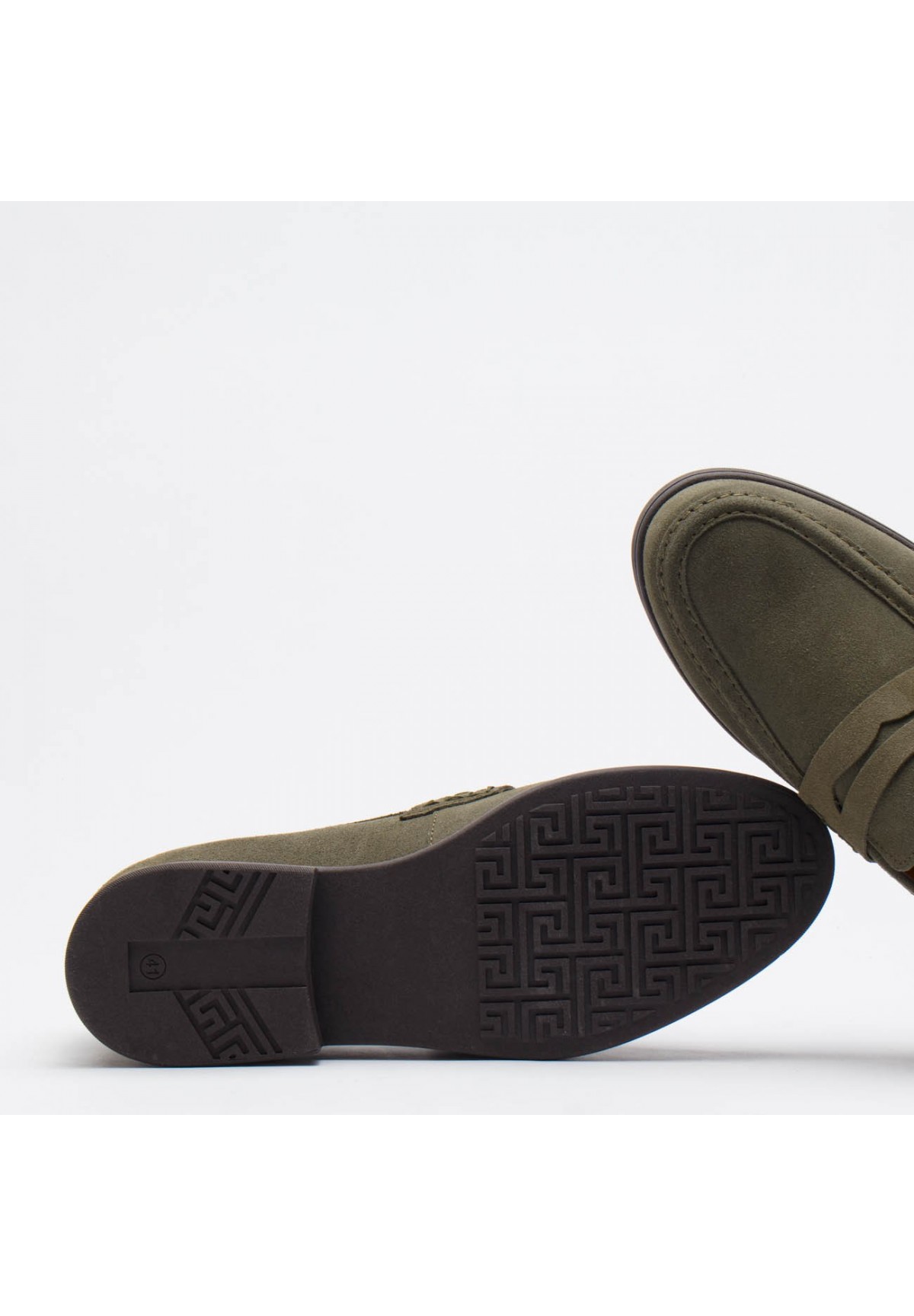 Loafersy męskie wykonane z najwyższej jakości skóry welurowej w pięknym oliwkowym kolorze. Ich klasyczny design sprawia, że są niezastąpionym elementem męskiej garderoby. Wzrok przykuwa subtelny, lecz efektowny ozdobny pasek naszyty na cholewce, który dodaje im niepowtarzalnego charakteru. Loafersy są nie tylko eleganckie, ale także niezwykle wygodne i szybkie w zakładaniu oraz zdejmowaniu. Ich noski w typie migdała dodają im klasy i ponadczasowego uroku. Buty te osadzone są na solidnej podeszwie o grubości około 1,5 cm, z delikatnym obcasem o wysokości 2,5 cm, co zapewnia zarówno stabilność, jak i subtelne podwyższenie. Wnętrze wyścielane miękką skórą naturalną jest dodatkowym atutem, zapewniającym komfort na najwyższym poziomie.