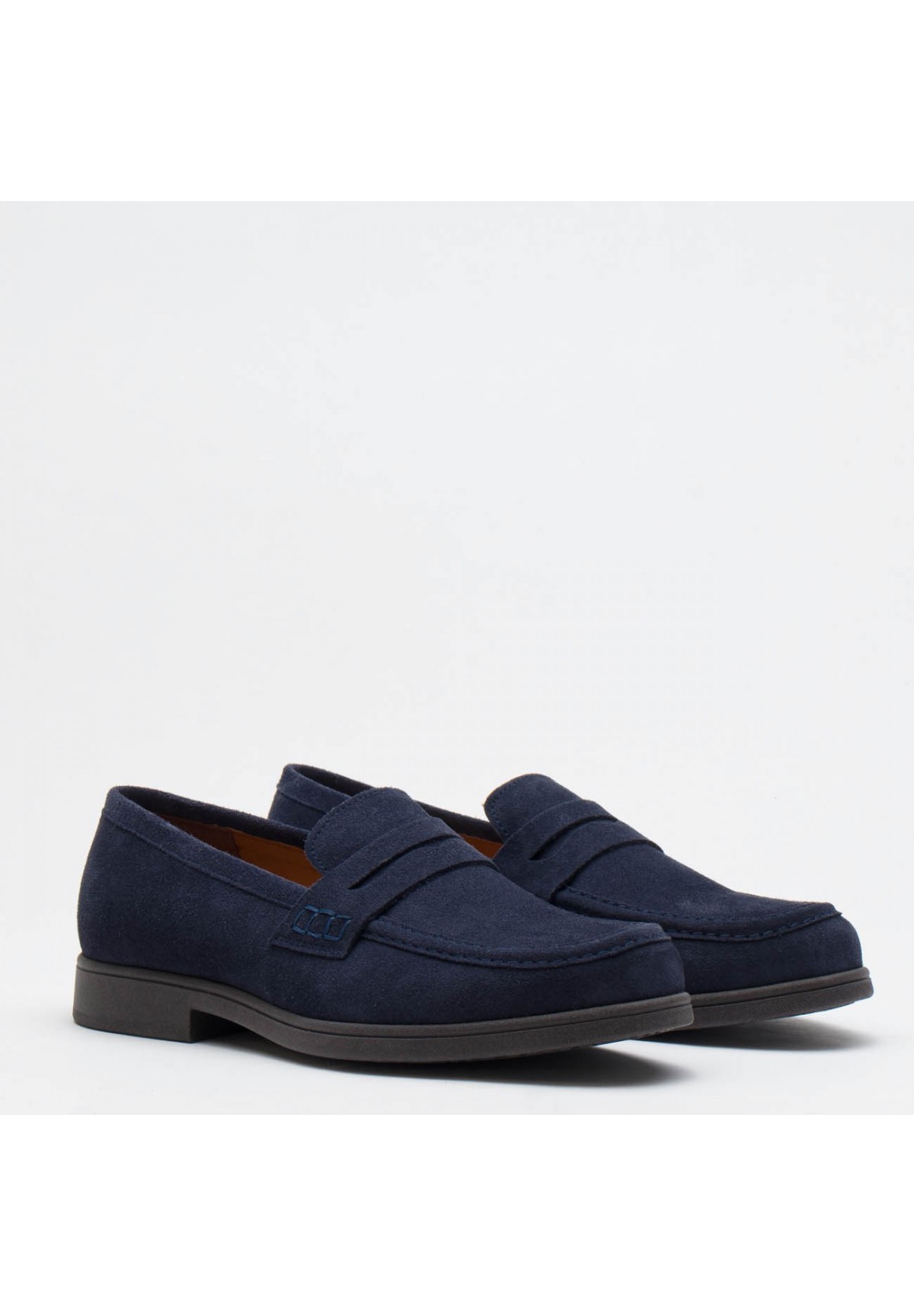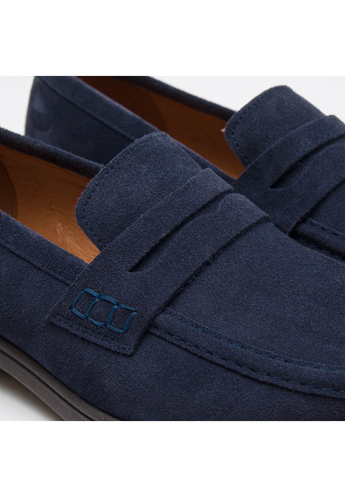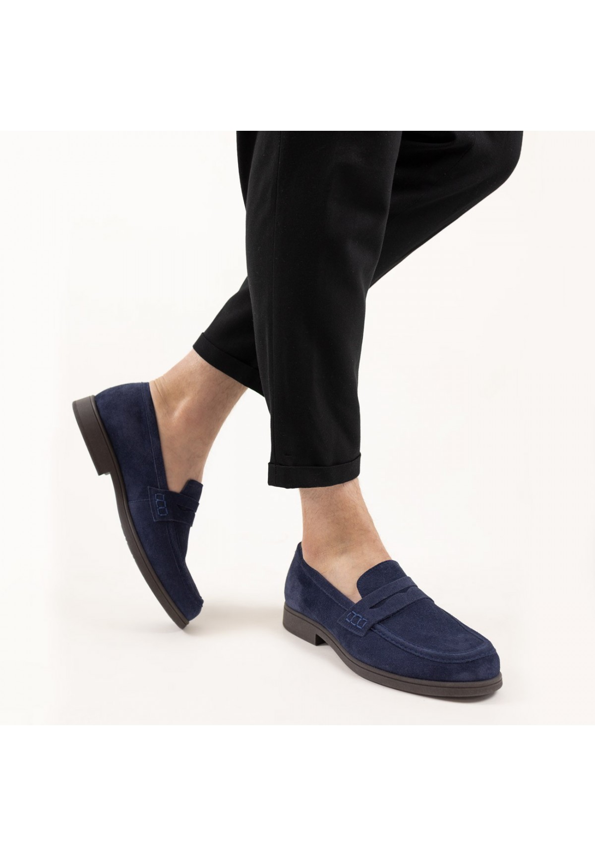 Loafersy męskie wykonane z najwyższej jakości skóry welurowej w pięknym granatowym kolorze. Ich klasyczny design sprawia, że są niezastąpionym elementem męskiej garderoby. Wzrok przykuwa subtelny, lecz efektowny ozdobny pasek naszyty na cholewce, który dodaje im niepowtarzalnego charakteru. Loafersy są nie tylko eleganckie, ale także niezwykle wygodne i szybkie w zakładaniu oraz zdejmowaniu. Ich noski w typie migdała dodają im klasy i ponadczasowego uroku. Buty te osadzone są na solidnej podeszwie o grubości około 1,5 cm, z delikatnym obcasem o wysokości 2,5 cm, co zapewnia zarówno stabilność, jak i subtelne podwyższenie. Wnętrze wyścielane miękką skórą naturalną jest dodatkowym atutem, zapewniającym komfort na najwyższym poziomie.