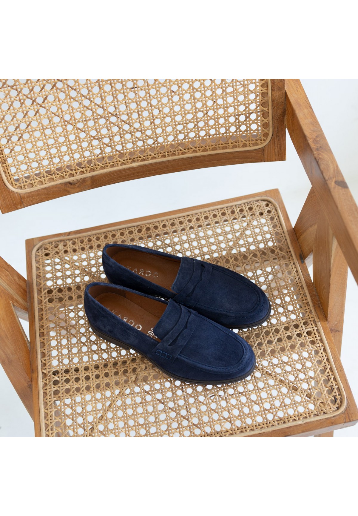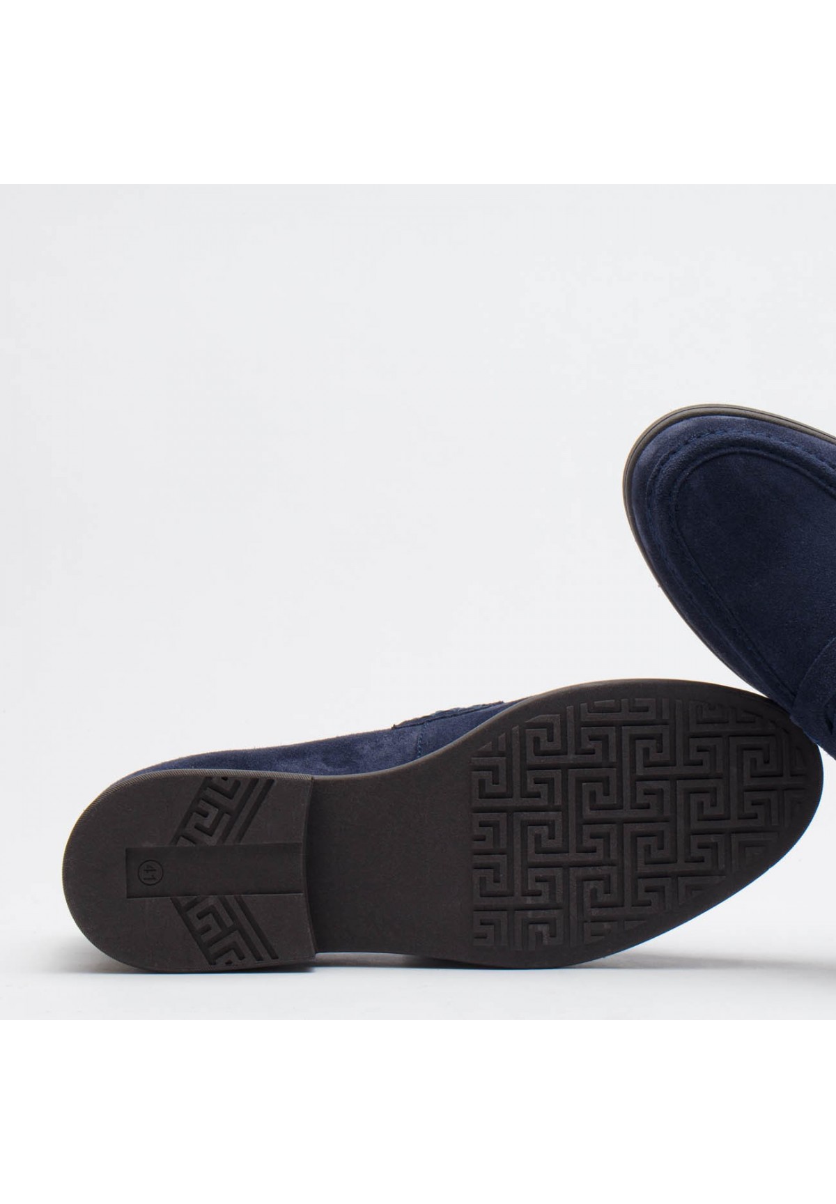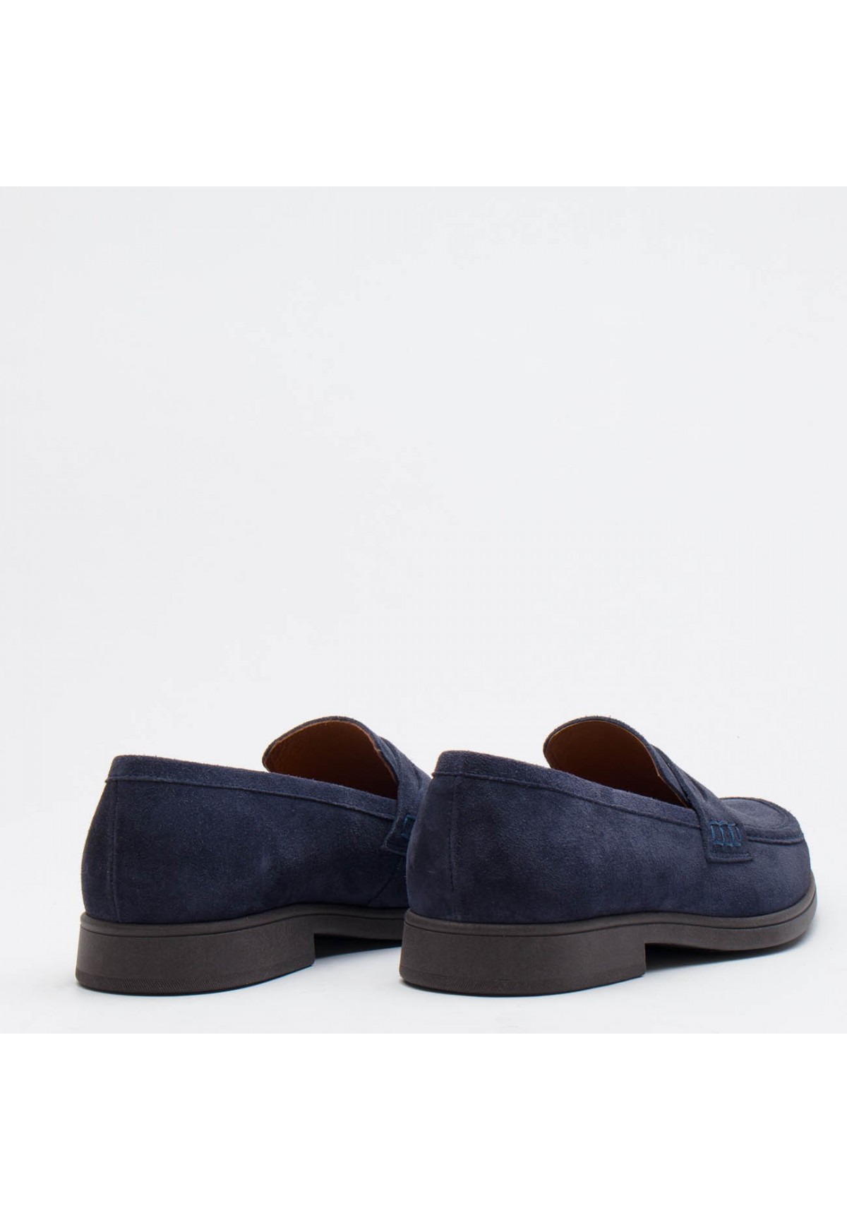 Loafersy męskie wykonane z najwyższej jakości skóry welurowej w pięknym granatowym kolorze. Ich klasyczny design sprawia, że są niezastąpionym elementem męskiej garderoby. Wzrok przykuwa subtelny, lecz efektowny ozdobny pasek naszyty na cholewce, który dodaje im niepowtarzalnego charakteru. Loafersy są nie tylko eleganckie, ale także niezwykle wygodne i szybkie w zakładaniu oraz zdejmowaniu. Ich noski w typie migdała dodają im klasy i ponadczasowego uroku. Buty te osadzone są na solidnej podeszwie o grubości około 1,5 cm, z delikatnym obcasem o wysokości 2,5 cm, co zapewnia zarówno stabilność, jak i subtelne podwyższenie. Wnętrze wyścielane miękką skórą naturalną jest dodatkowym atutem, zapewniającym komfort na najwyższym poziomie.