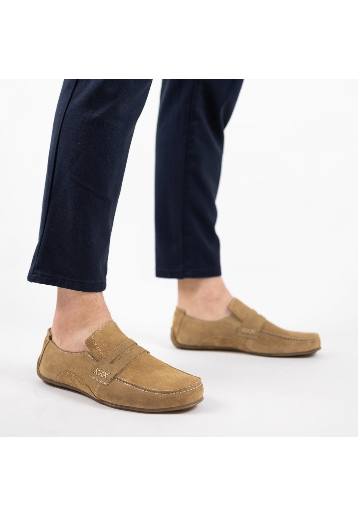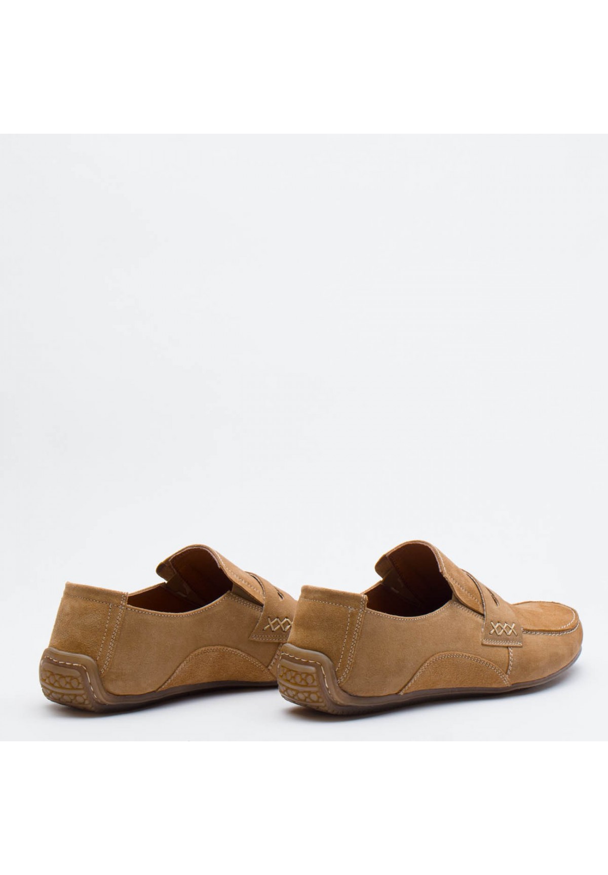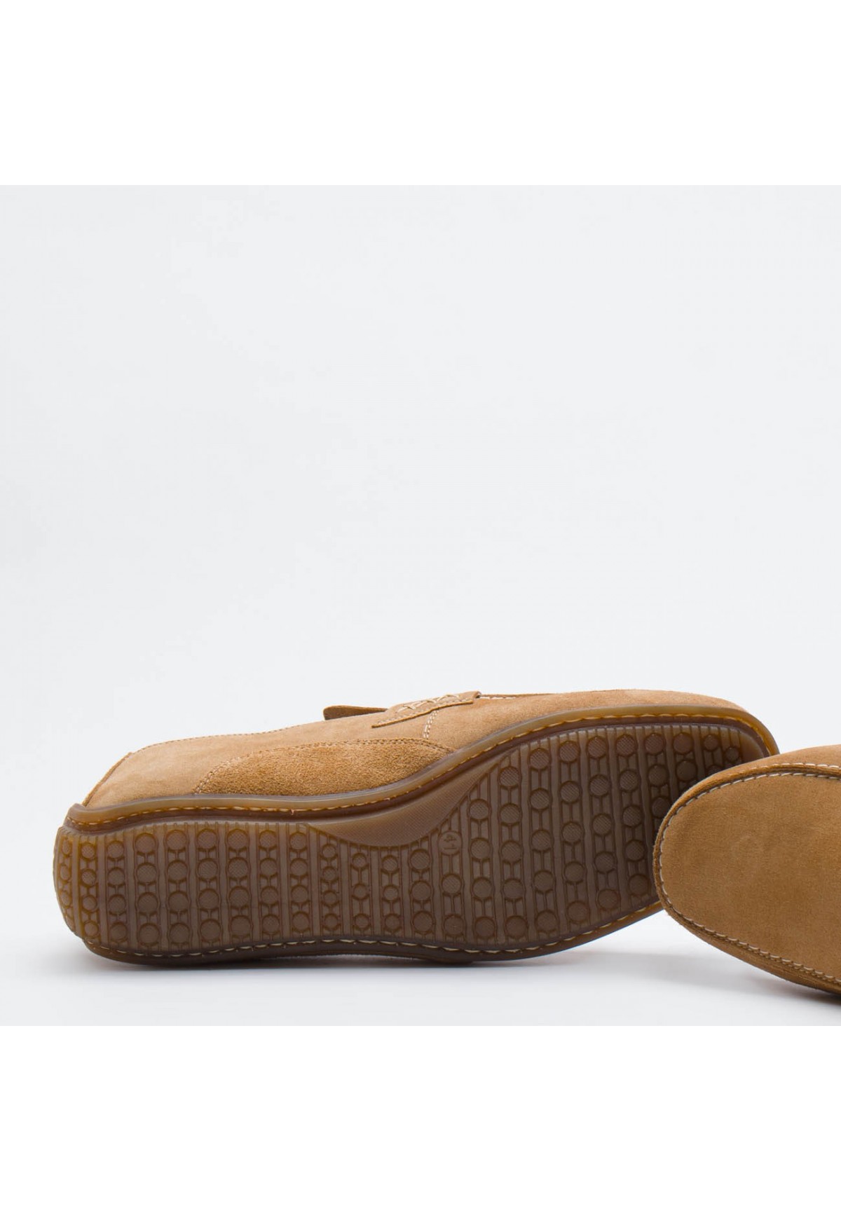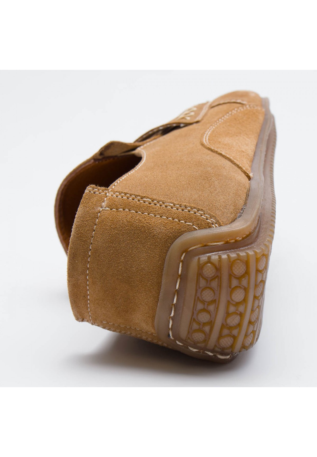 Mokasyny męskie wykonane ze skóry naturalnej welurowej to buty, które łączą elegancję z wygodą. Buty posiadają gumową, płaską podeszwę, co zapewnia komfort podczas chodzenia. Gumowa podeszwa jest również trwała i odporna na ścieranie. Cholewka jest zdobiona ozdobnym naszytym paskiem, co dodaje butom elegancji. Wnętrze mokasynów jest wyścielane naturalną podszewką oraz wkładką, zapewniając wygodę noszenia. Dodatkowa poduszka w zapiętku chroni przed ocieraniem.