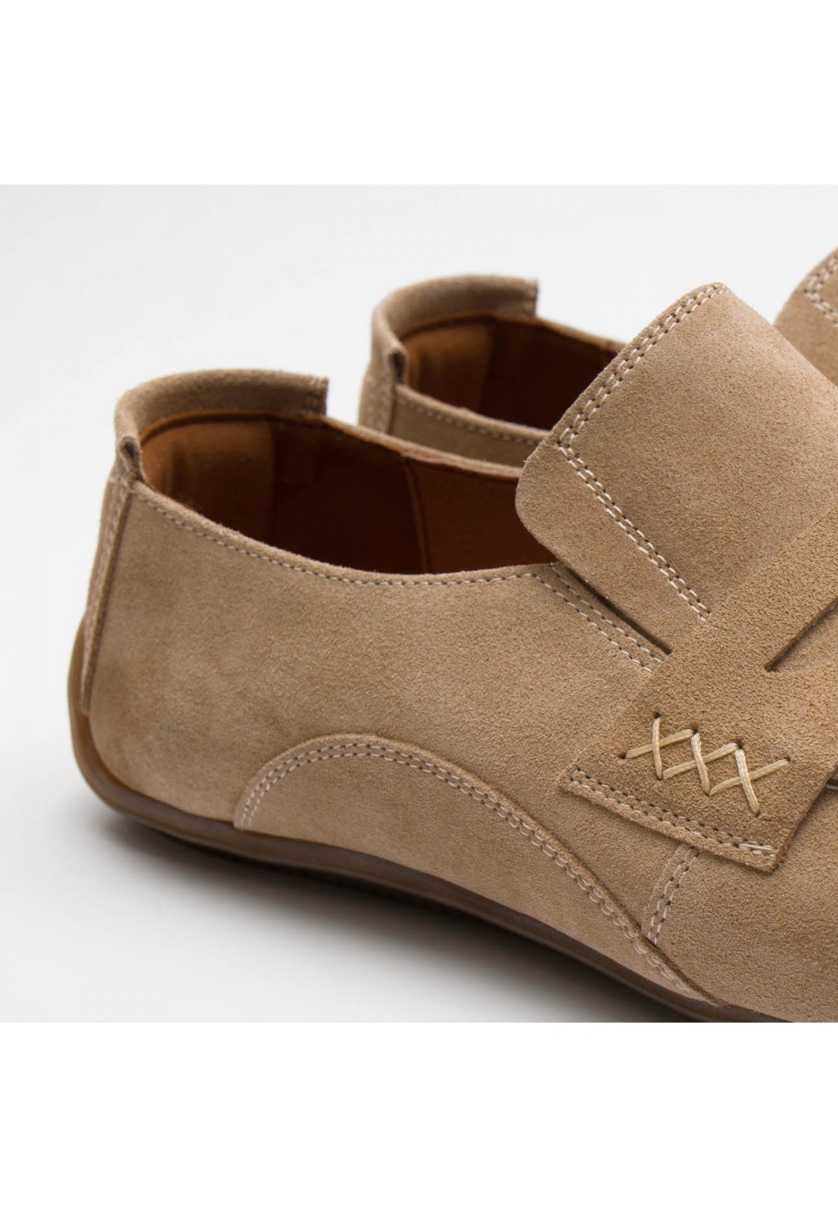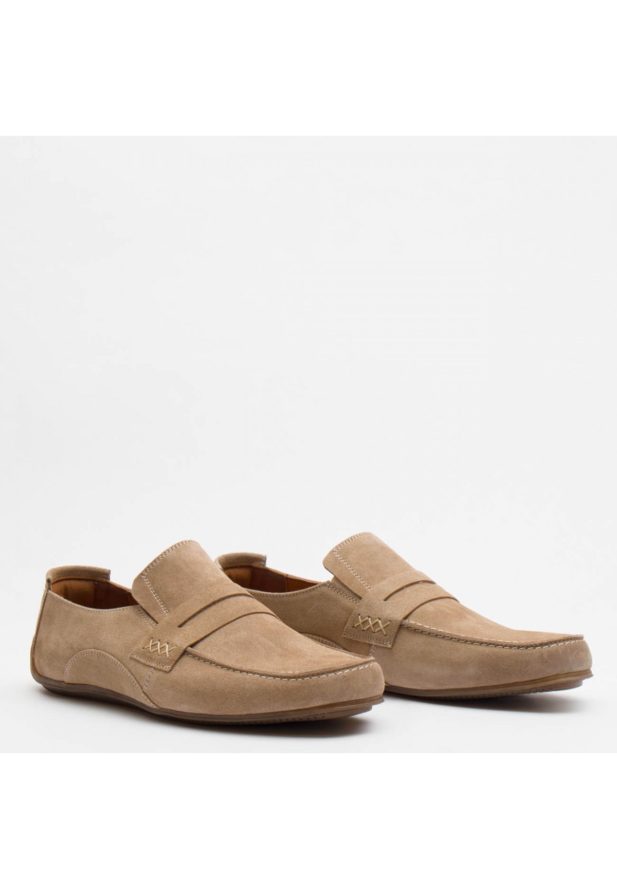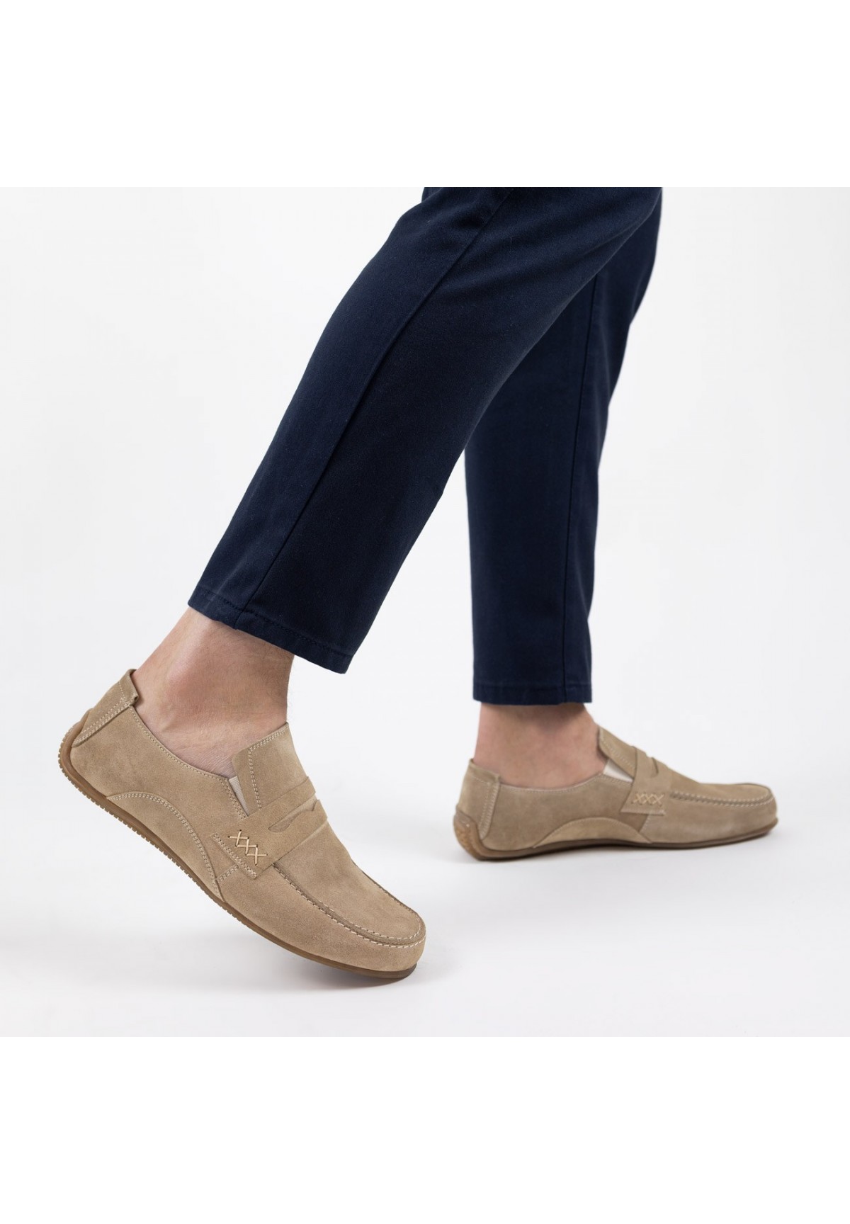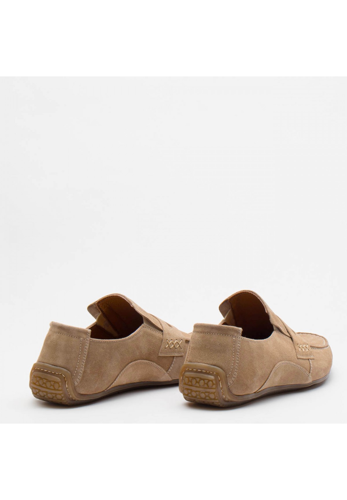 Mokasyny męskie wykonane ze skóry naturalnej welurowej to buty, które łączą elegancję z wygodą. Buty posiadają gumową, płaską podeszwę, co zapewnia komfort podczas chodzenia. Gumowa podeszwa jest również trwała i odporna na ścieranie. Cholewka jest zdobiona ozdobnym naszytym paskiem, co dodaje butom elegancji. Wnętrze mokasynów jest wyścielane naturalną podszewką oraz wkładką, zapewniając wygodę noszenia. Dodatkowa poduszka w zapiętku chroni przed ocieraniem.