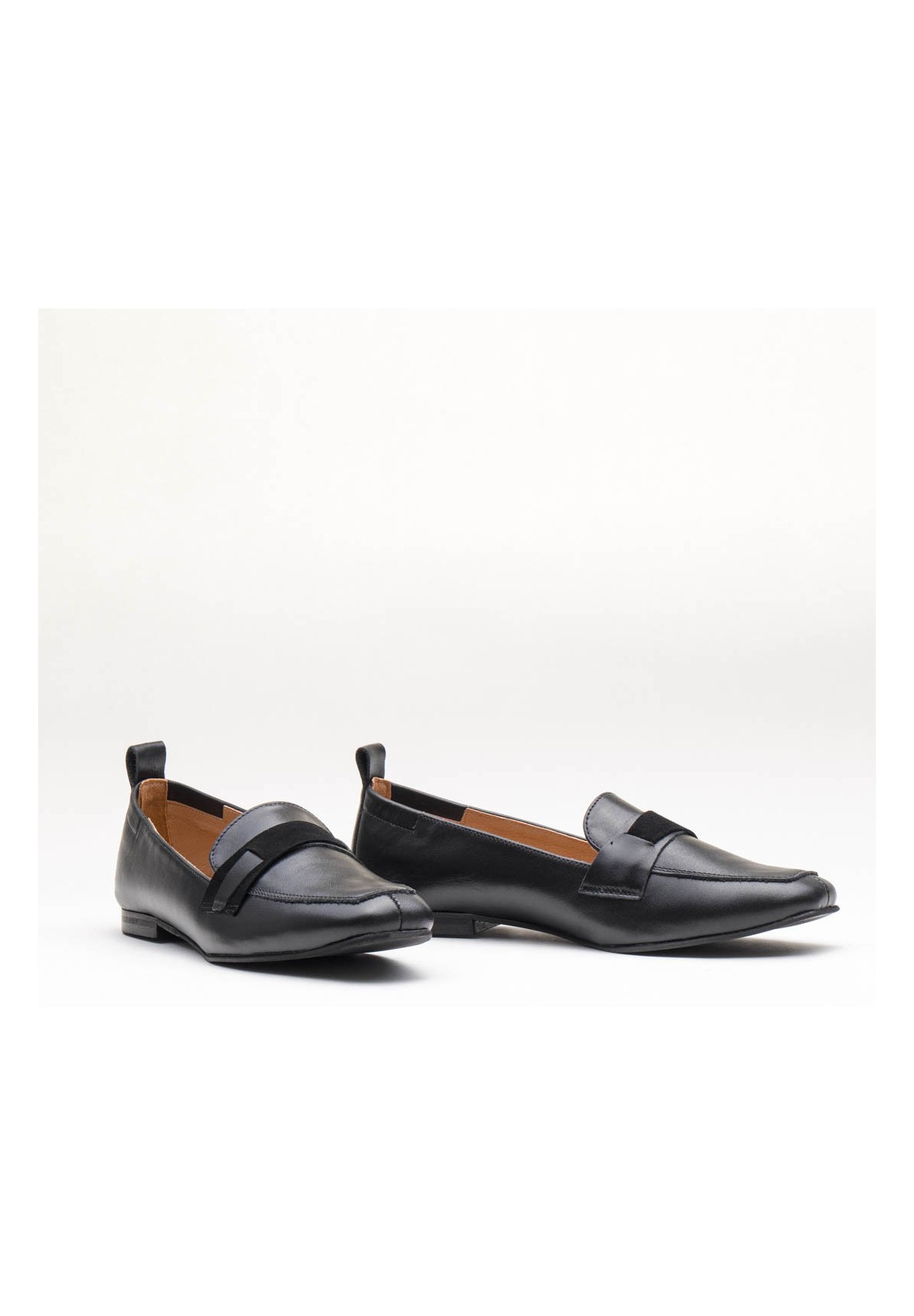 Klasyczne mokasyny wykonane z naturalnej skóry licowej w kolorze czarnym. Posiada ozdobny pasek ze skóry zamszowej.