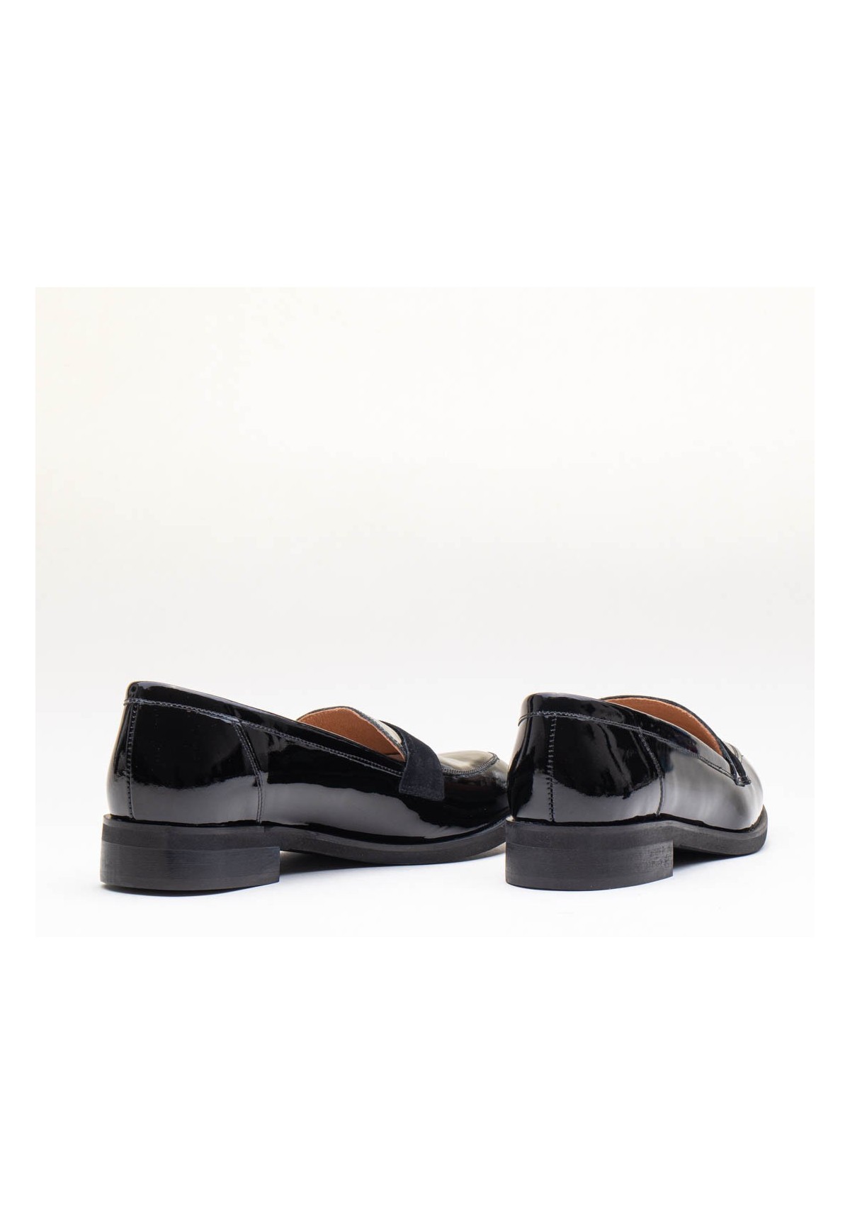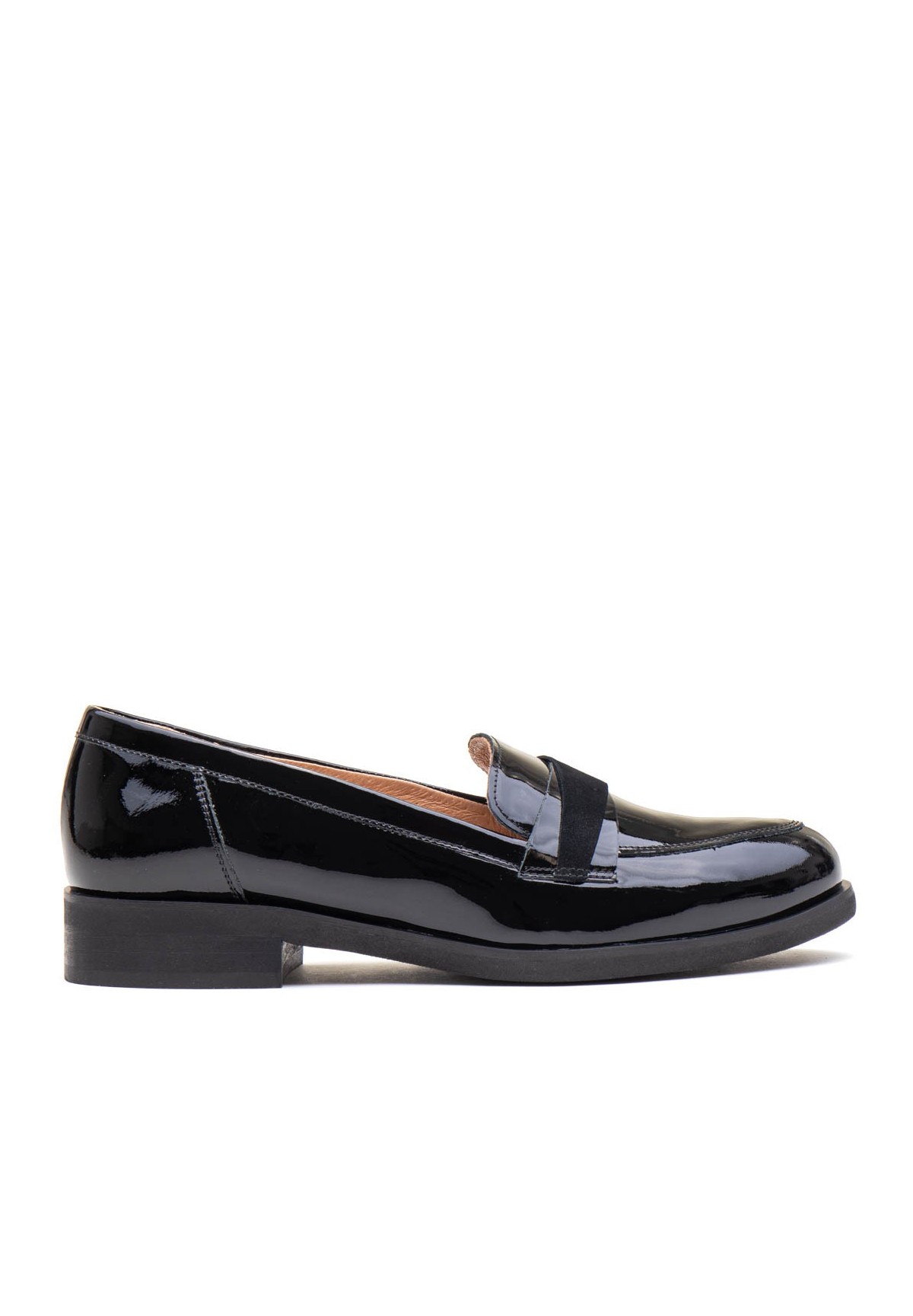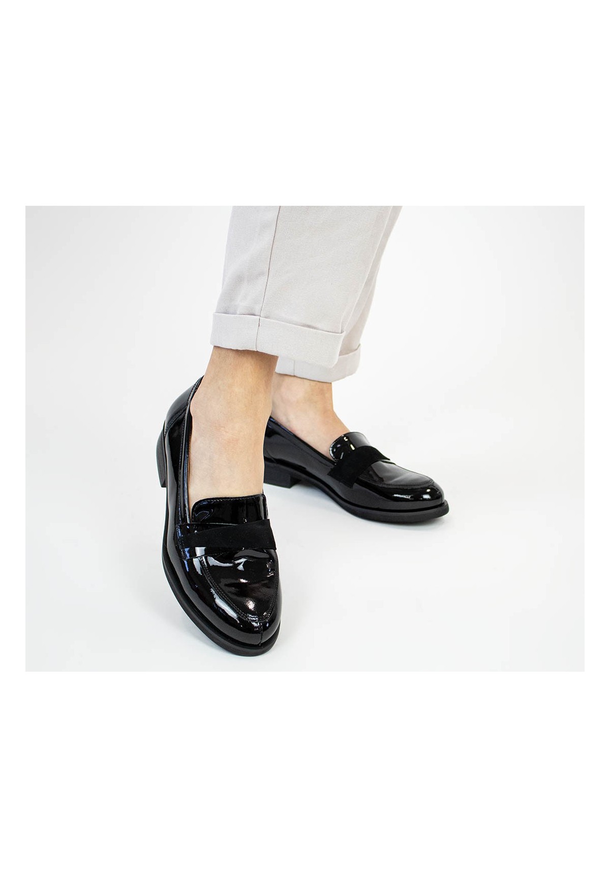 Czarne mokasyny wykonane ze skóry lakierowanej.