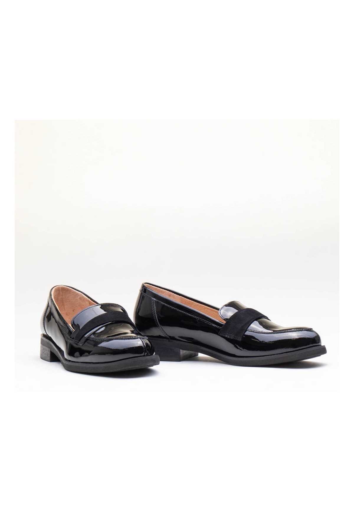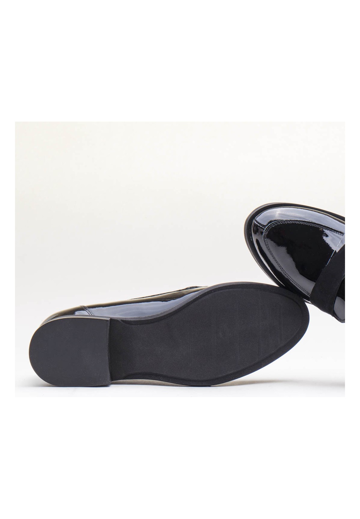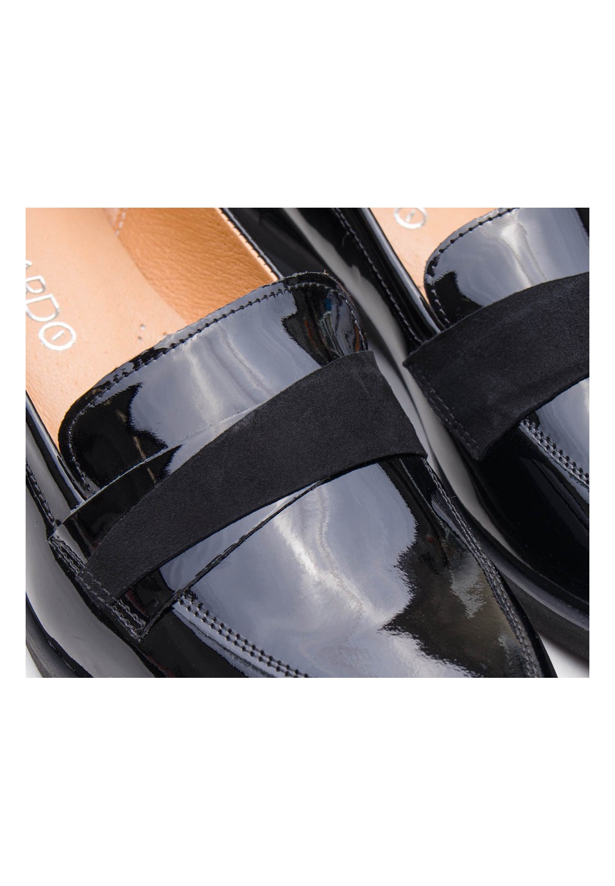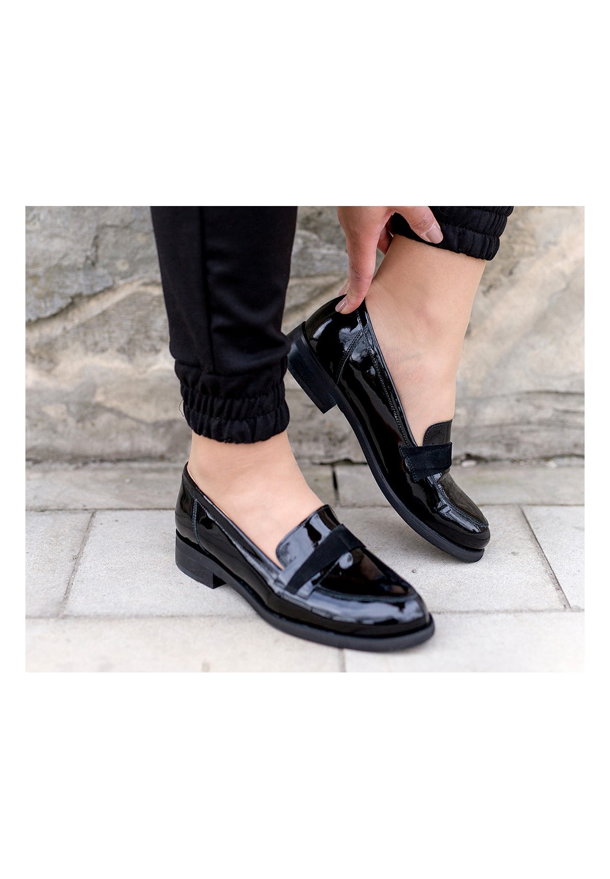 Czarne mokasyny wykonane ze skóry lakierowanej.