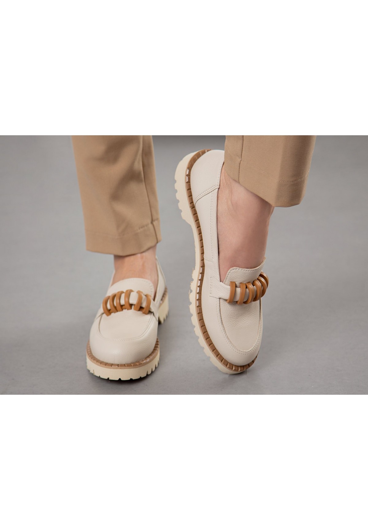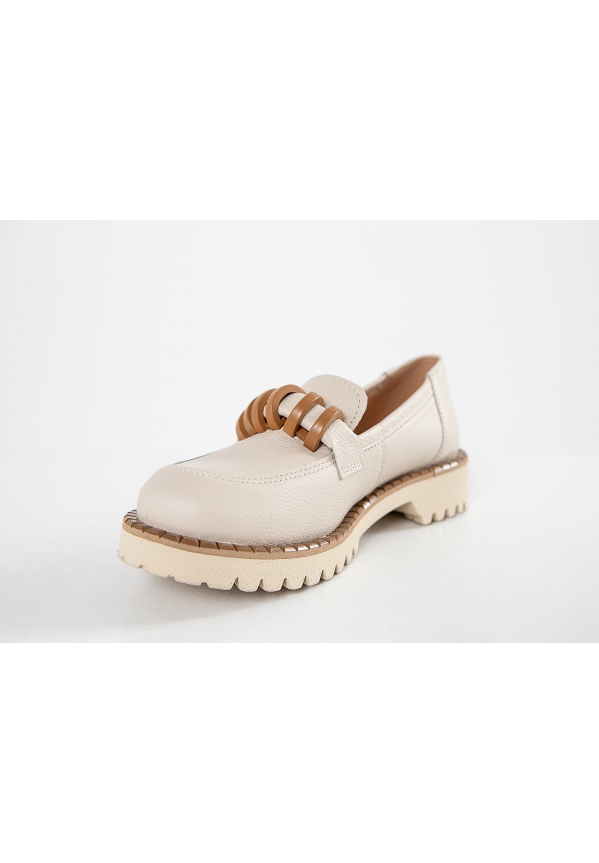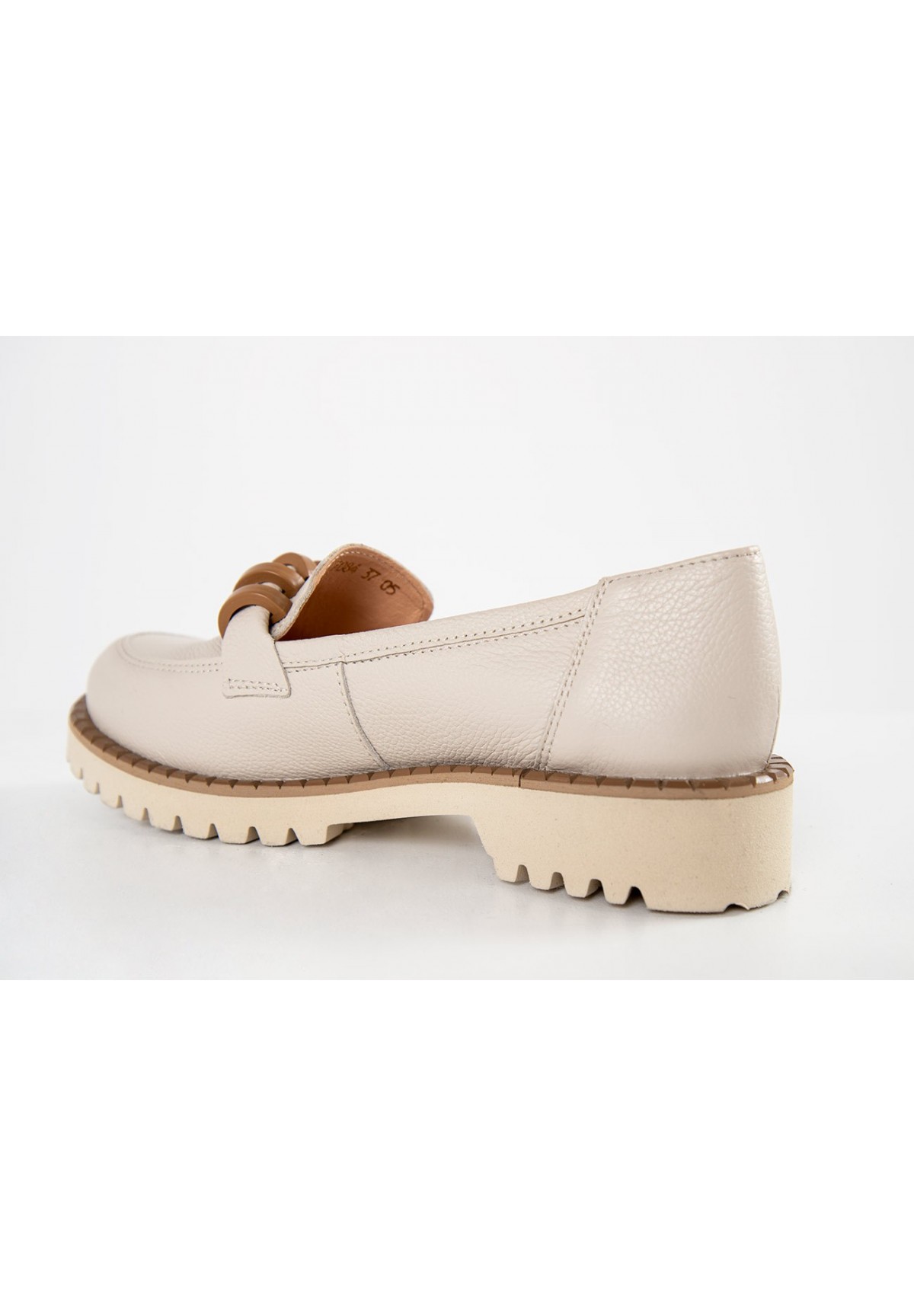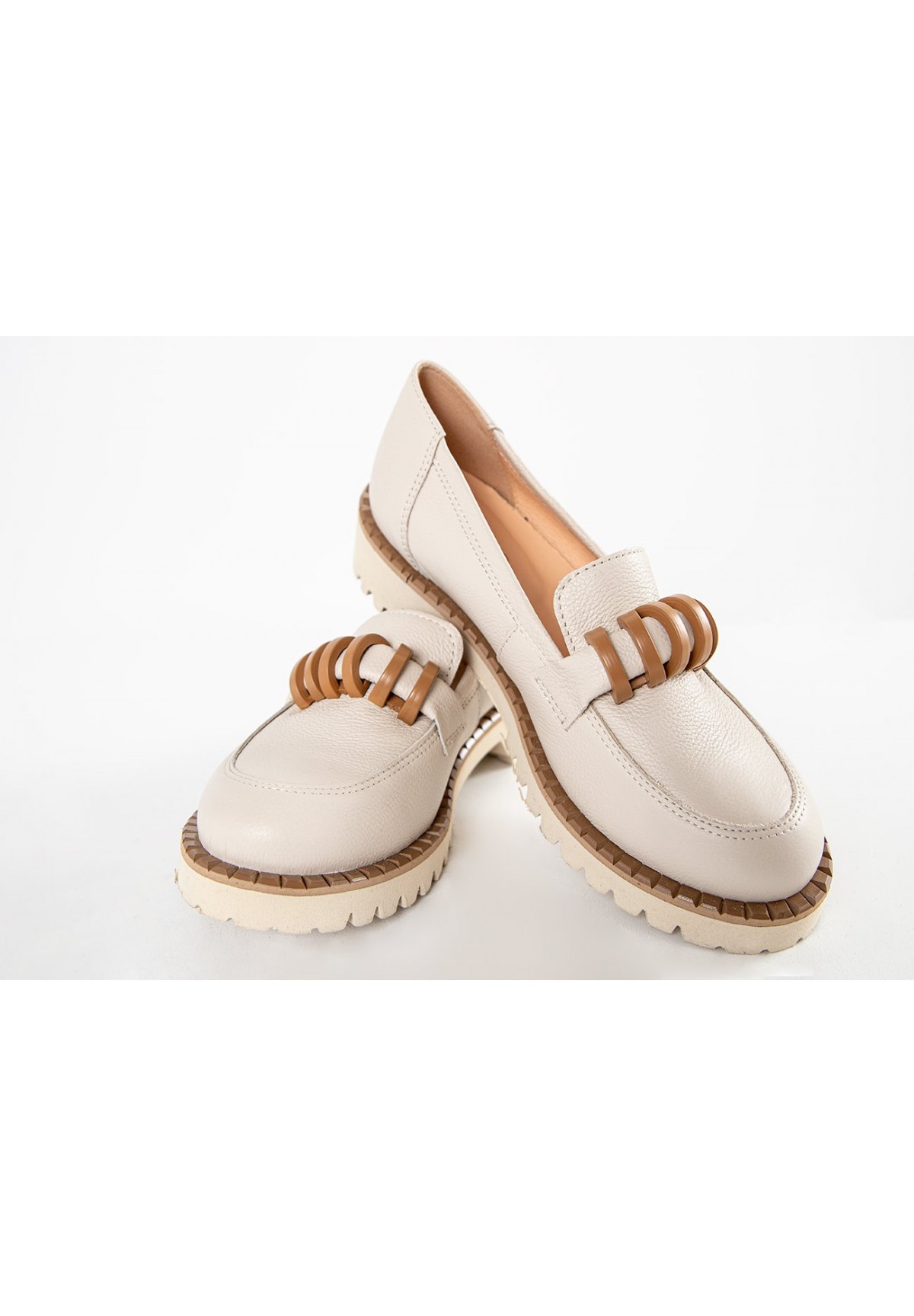 Klasyczne mokasyny damskie, wykonane z naturalnej skóry licowej o fakturze groszkowej, to idealny wybór na wiele okazji. Wygodne, dzięki grubej podeszwie zapewniającej amortyzację oraz wkładce ze skóry naturalnej, która zapewnia doskonałą cyrkulację powietrza. Zdobione dekoracyjnym elementem. Modne i eleganckie, przyciągają wzrok i nadają wyjątkowego wyglądu wielu stylizacjom.